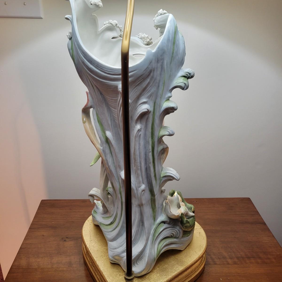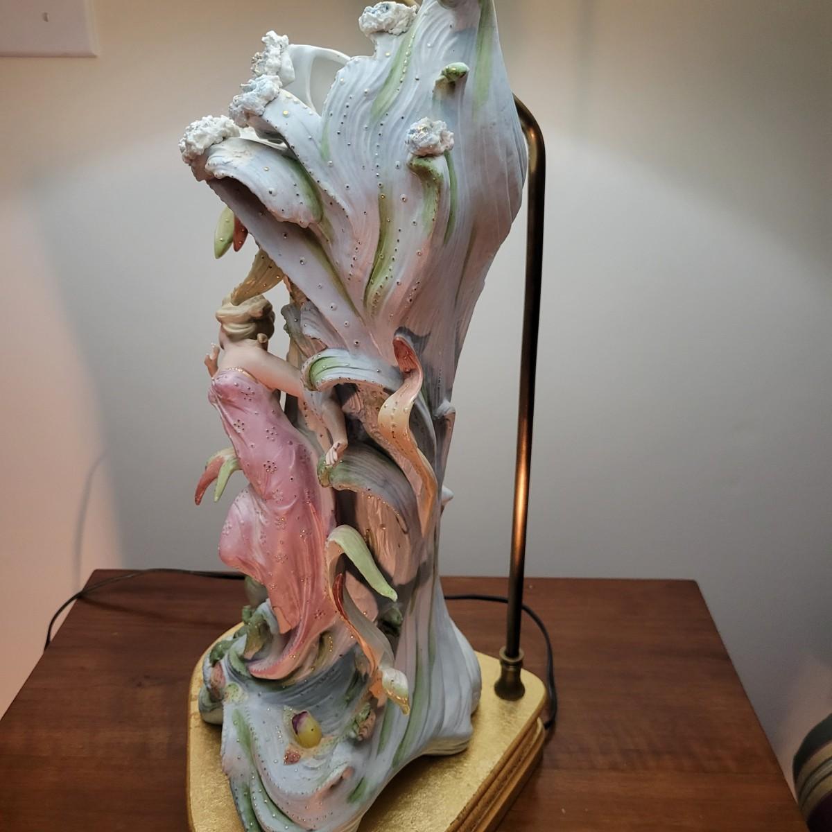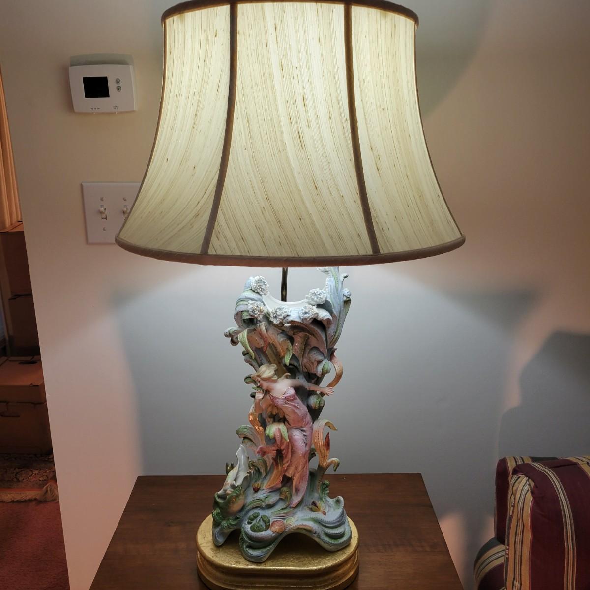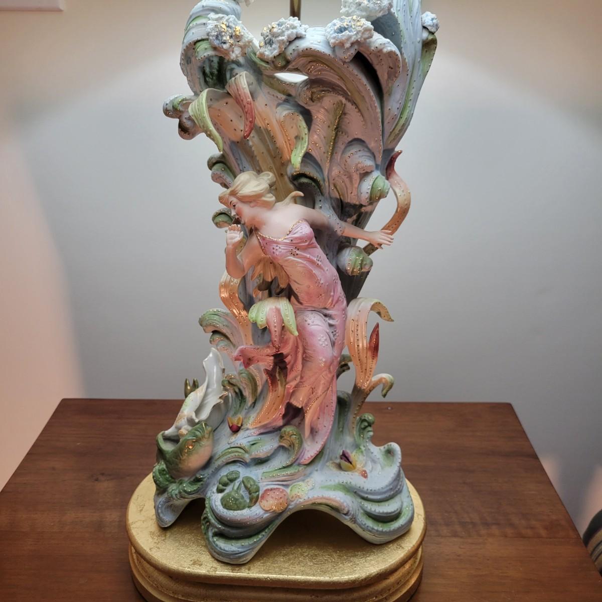 A Saxony porcelain vase and pedestal lamp in excellent. This piece is a whimsical porcelain vase manufactured by Saxony that features a woman in an aquatic scene with a fish, waves and features soft pastels with gold accents. Vase sits on a wooden lamp base that is gold and the lamp shade is made by Canterbury Roseart. Lamp and vase measures approximately 11" x 10" x 34". Shipping available. Shipping can be costly please call UPS store at 828-252-6930 for quote
