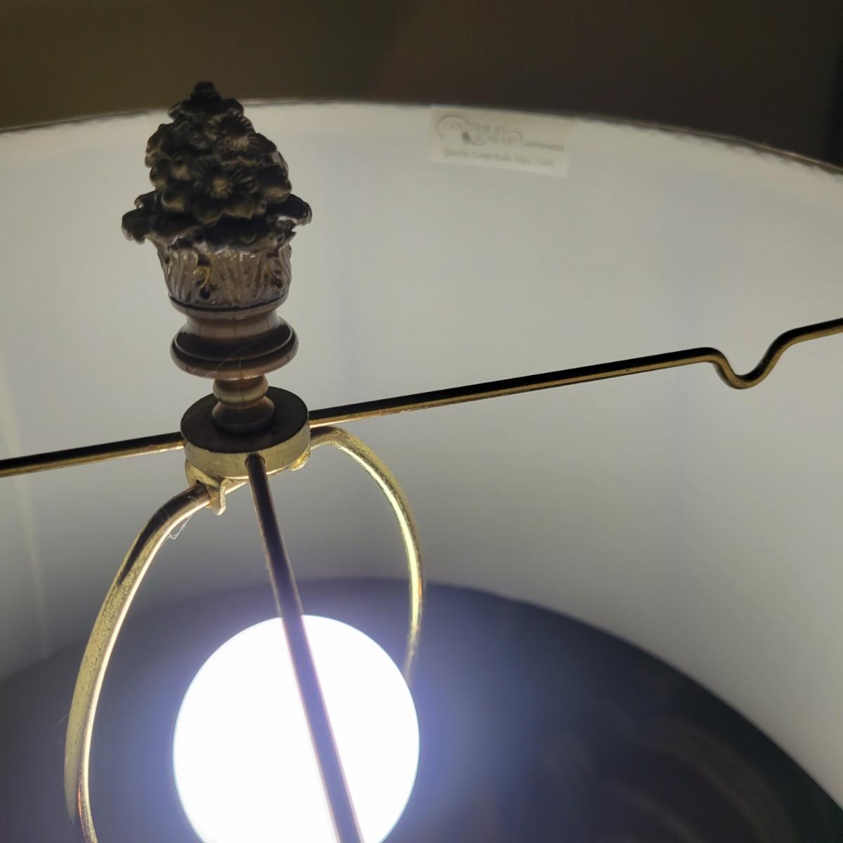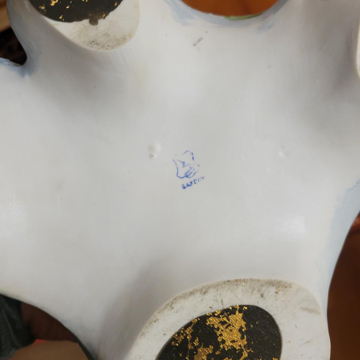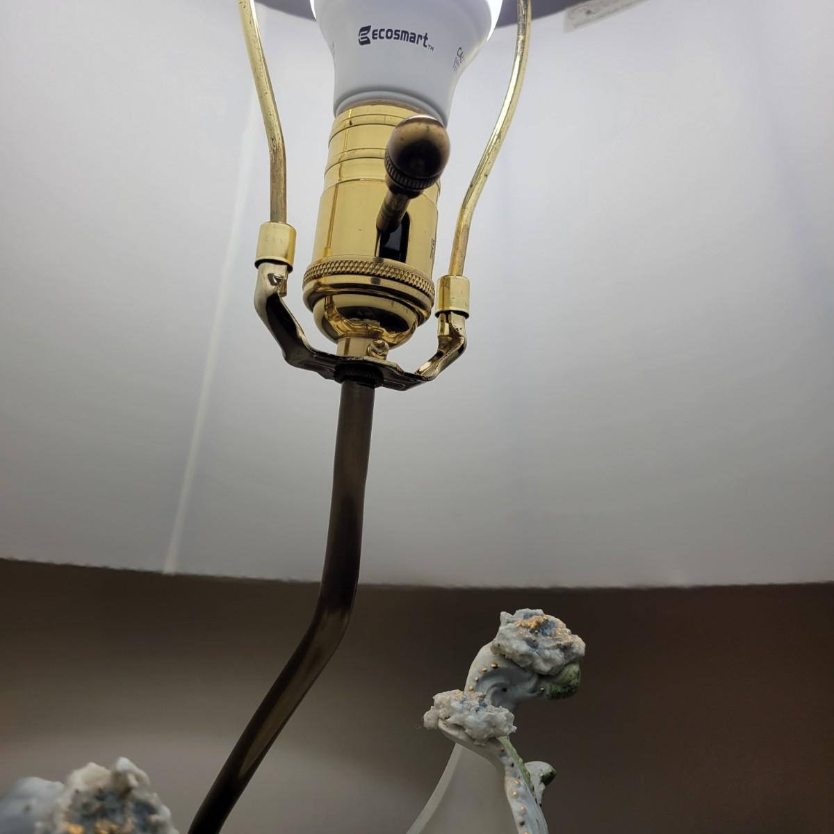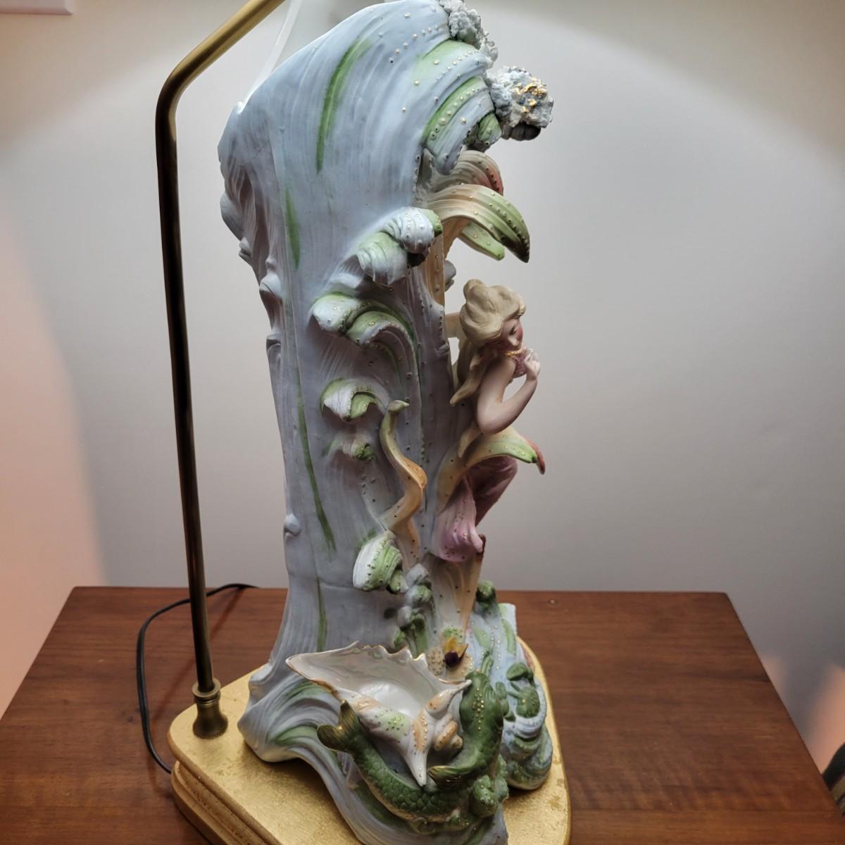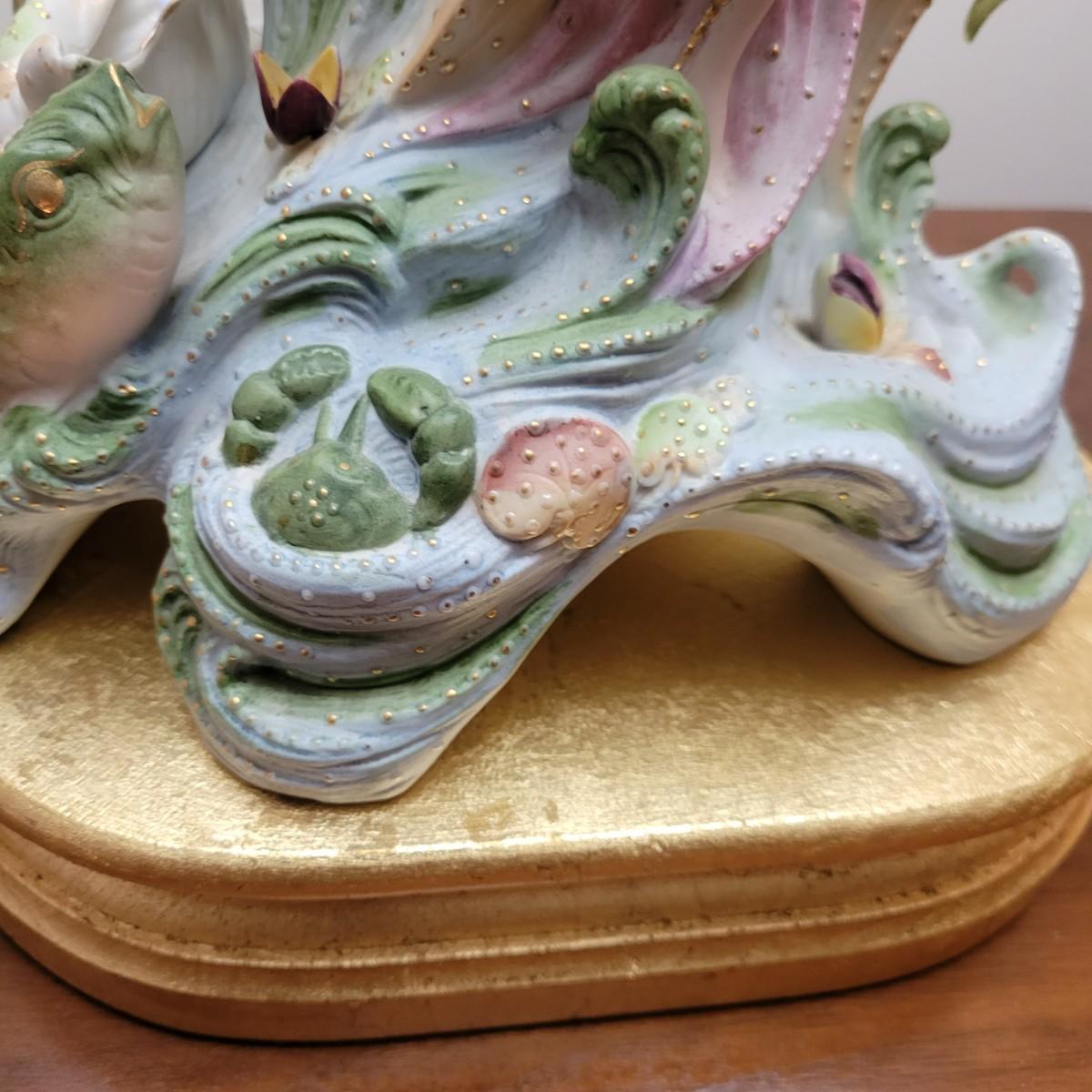 A Saxony porcelain vase and pedestal lamp in excellent. This piece is a whimsical porcelain vase manufactured by Saxony that features a woman in an aquatic scene with a fish, waves and features soft pastels with gold accents. Vase sits on a wooden lamp base that is gold and the lamp shade is made by Canterbury Roseart. Lamp and vase measures approximately 11" x 10" x 34". Shipping available. Shipping can be costly please call UPS store at 828-252-6930 for quote