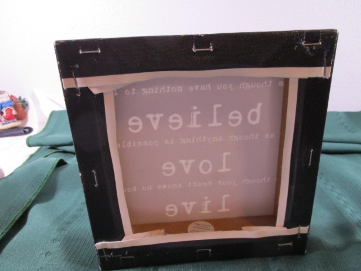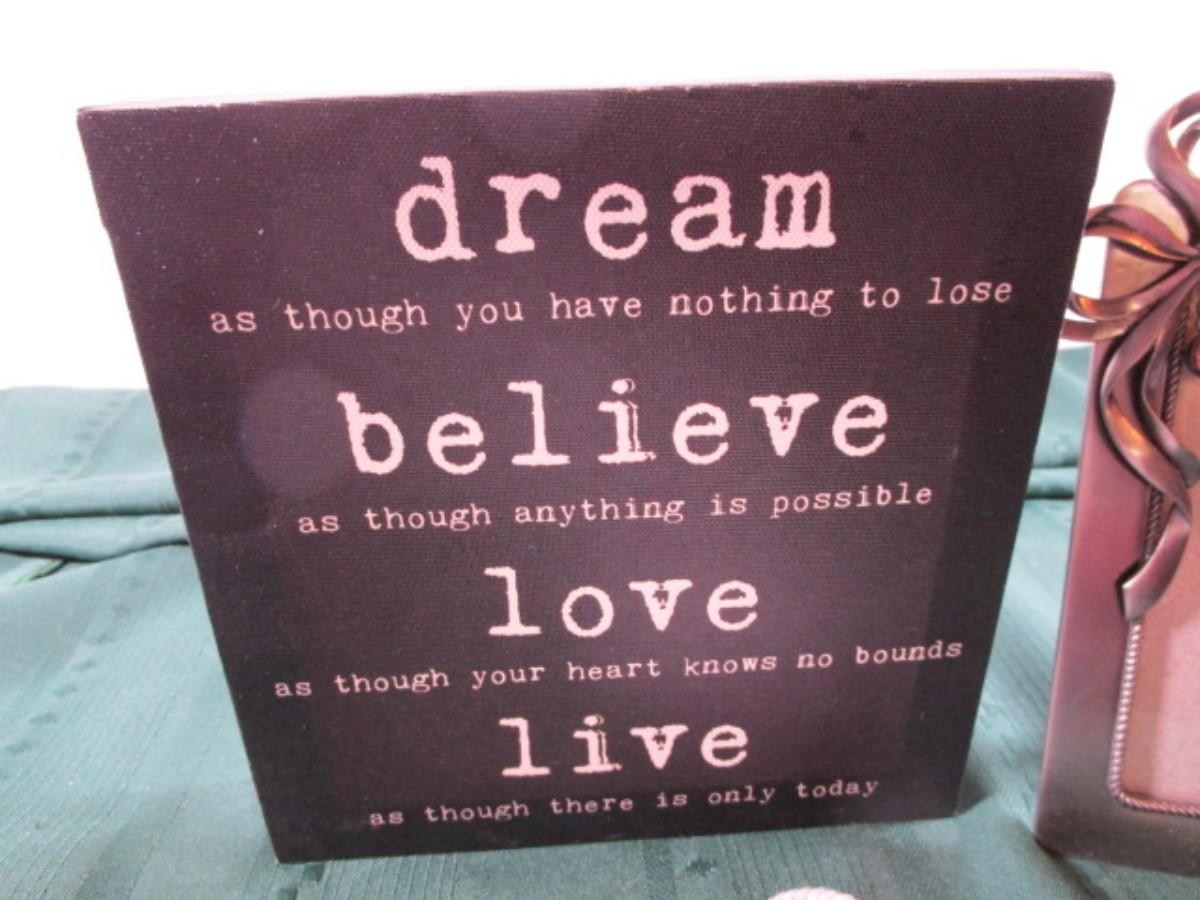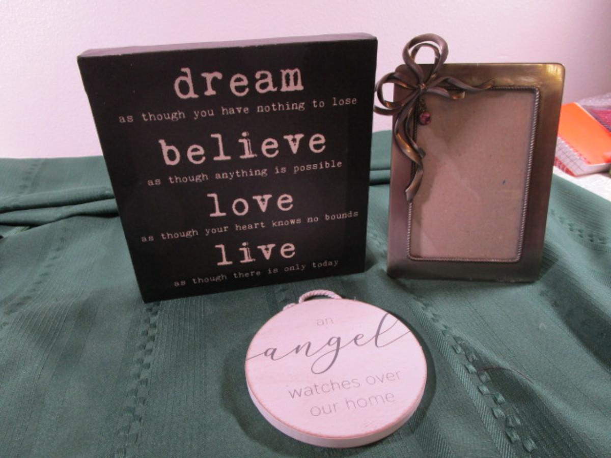 Canvas has Drream, Believe, Love, Live and is 7-1/2" x7-1/2", picture frame is 5" x 7", wood plaque is 4-1/2" in diameter