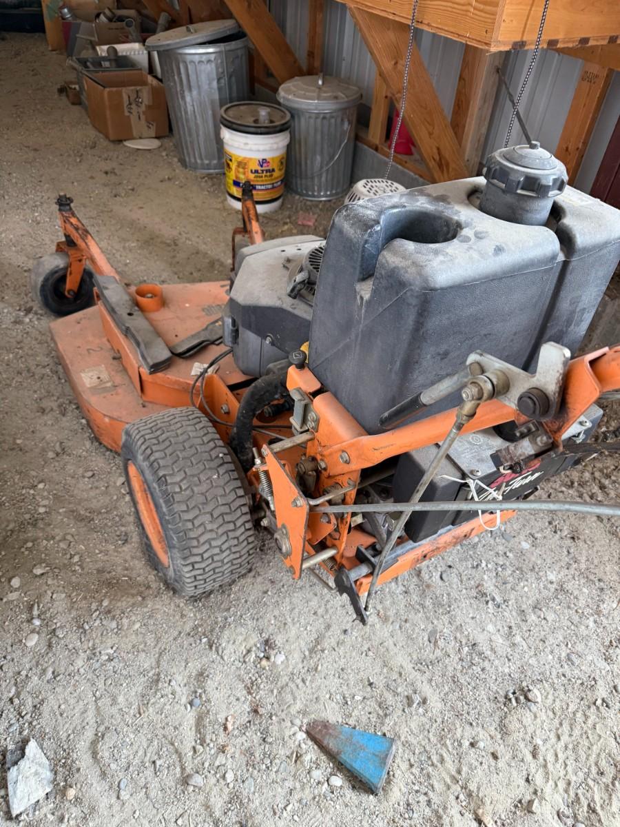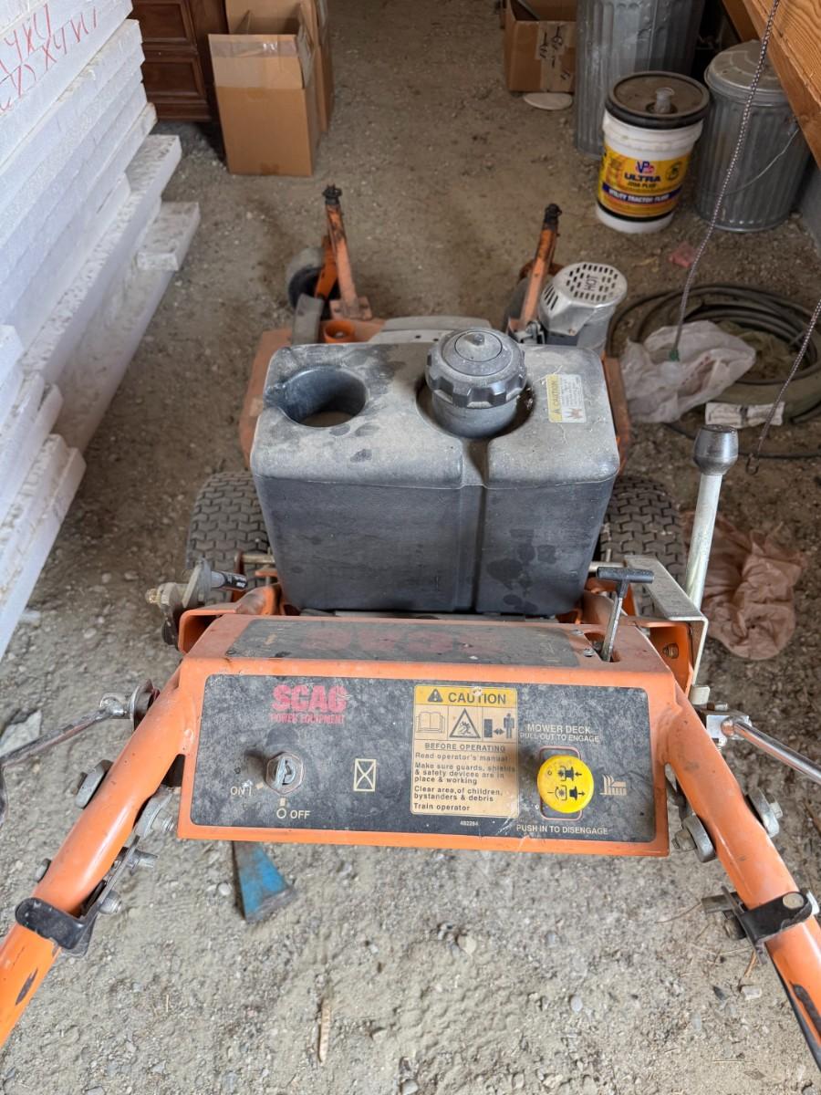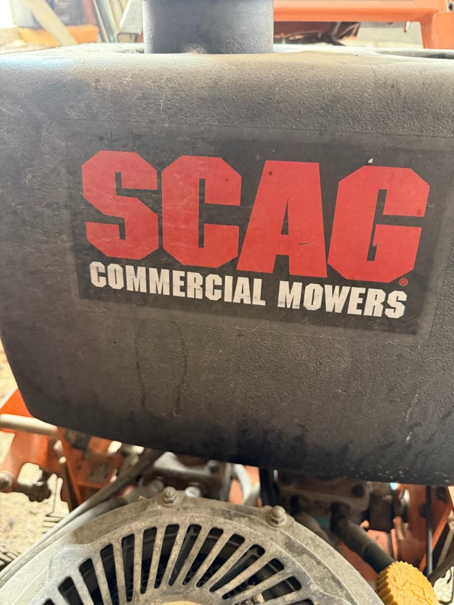 Heavy-duty SCAG commercial mower with Kawasaki engine and 52" deck. Shows signs of use but is structurally solid. Ideal for landscapers or property owners needing tough mowing power.