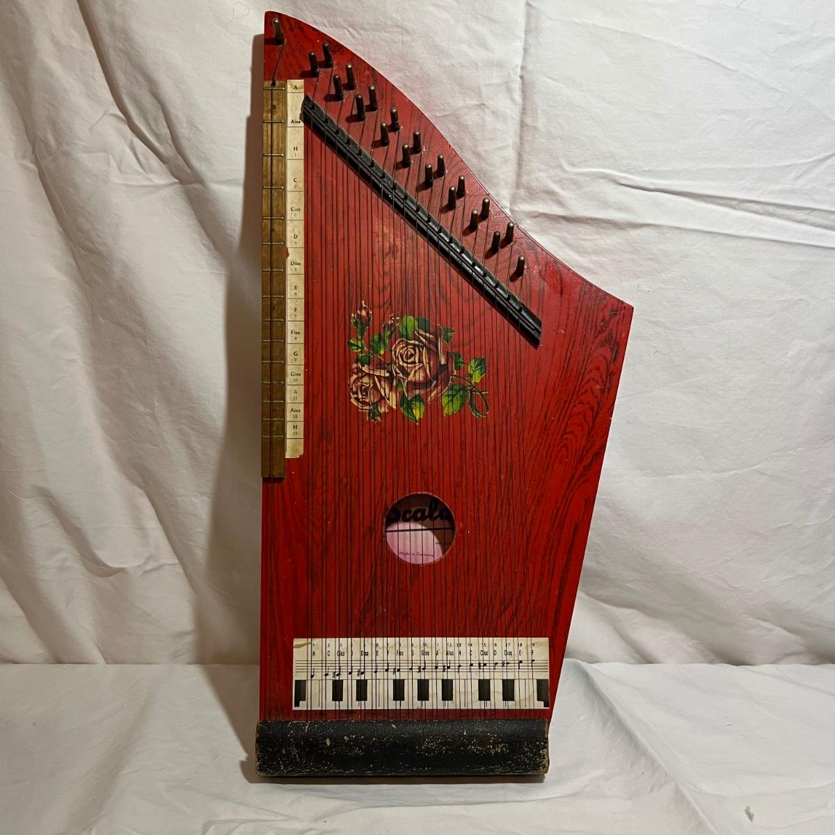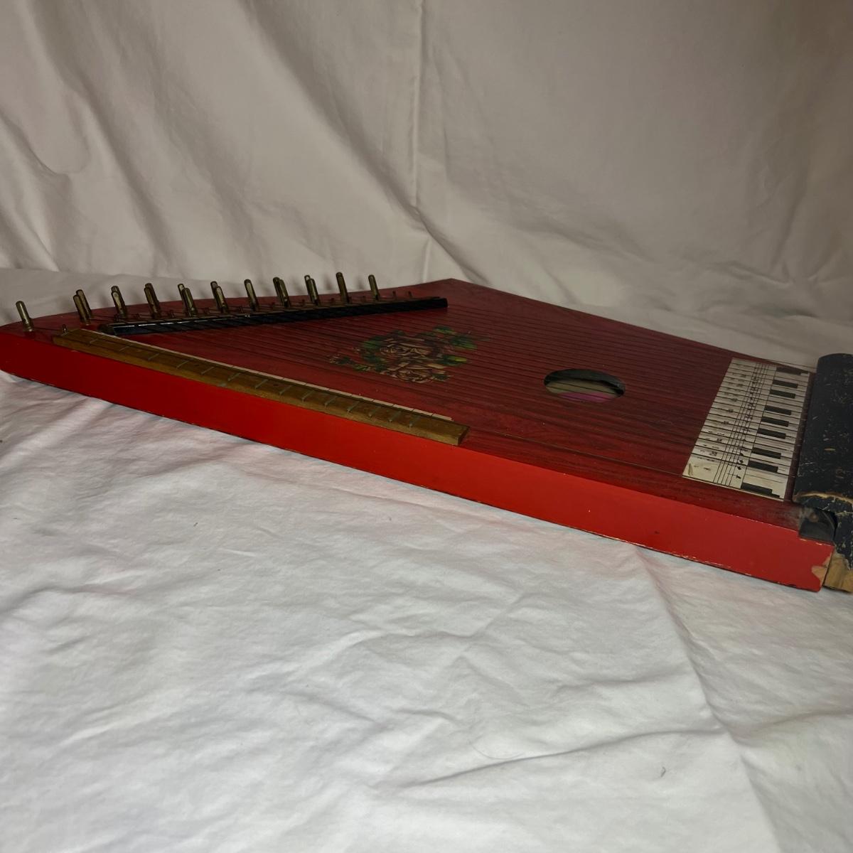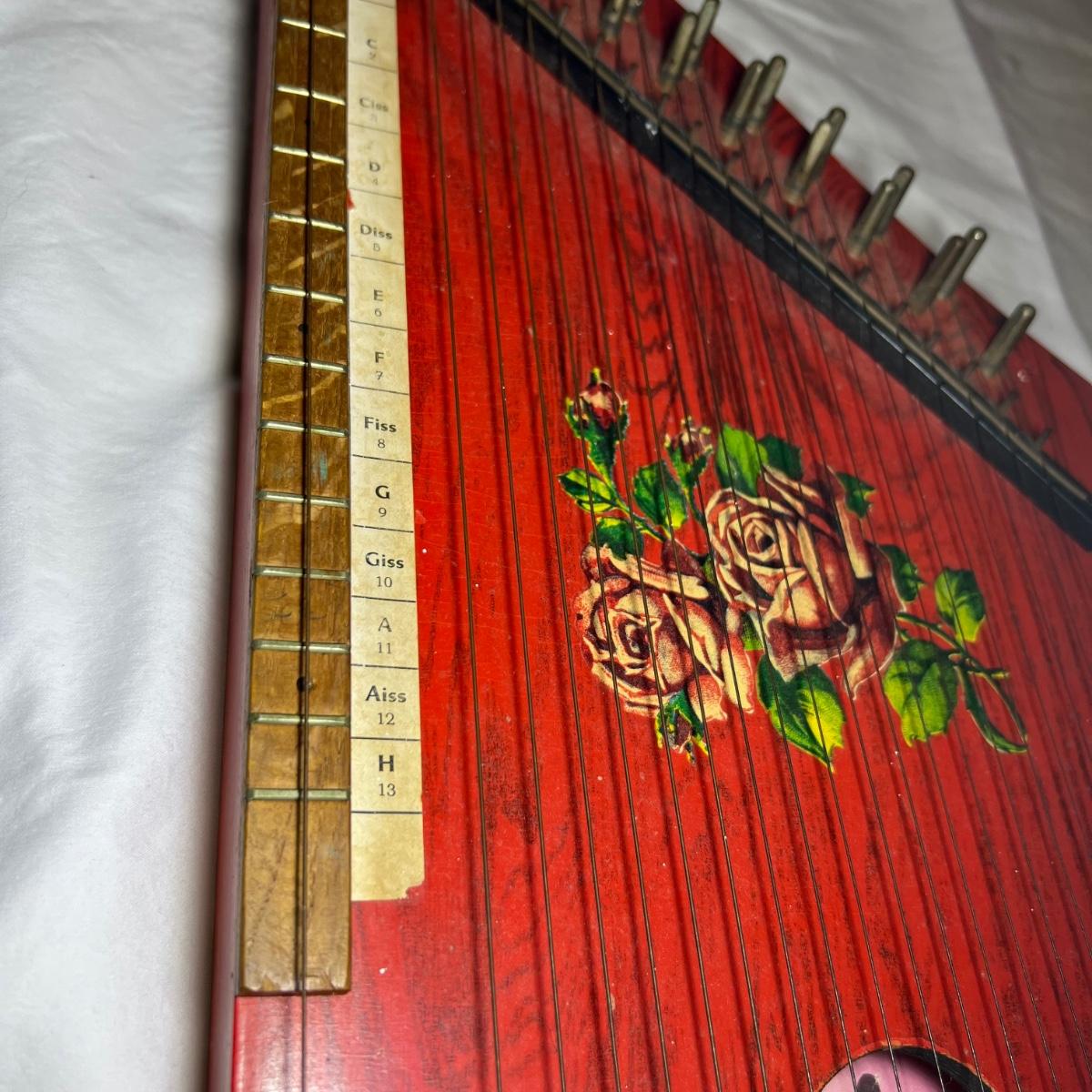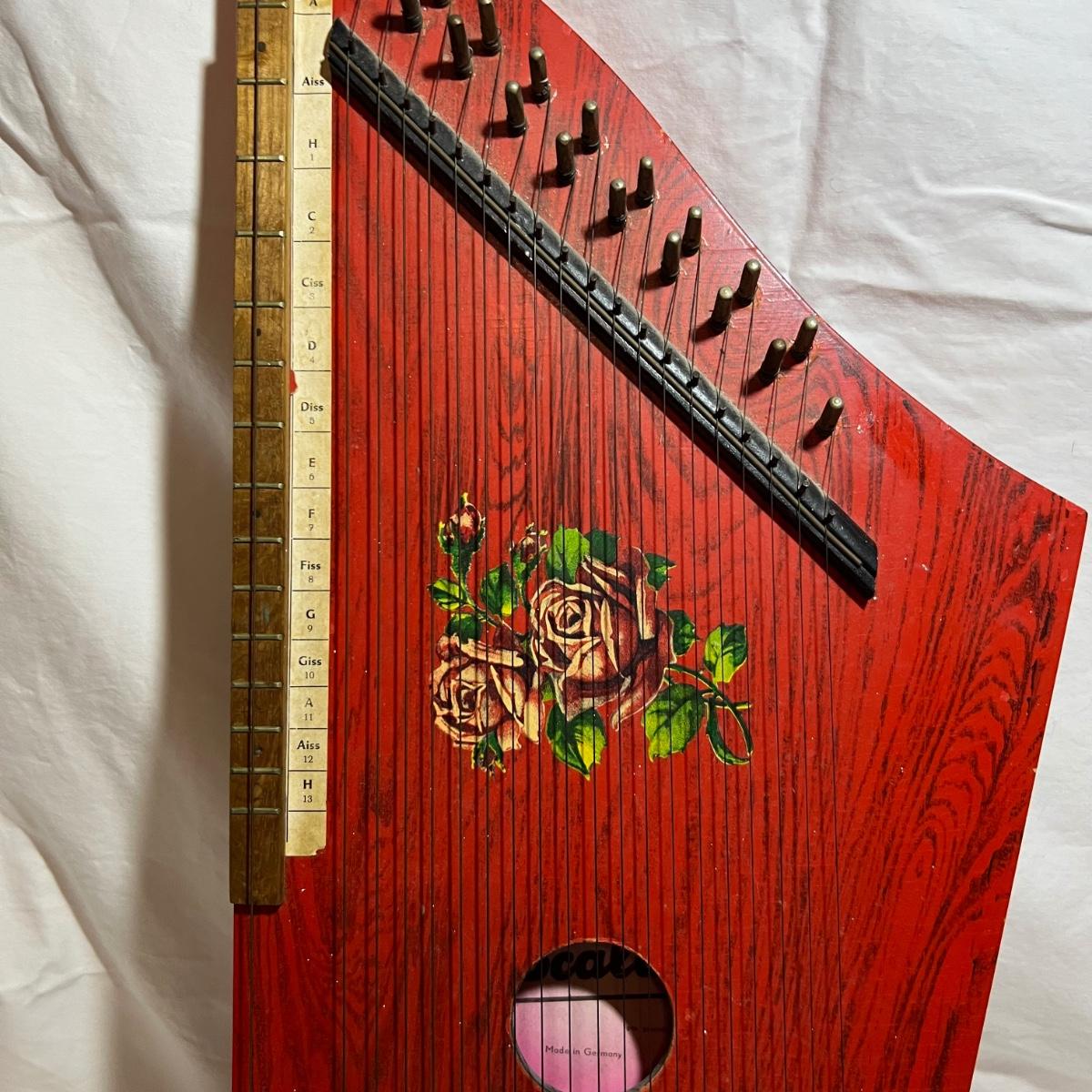 This vintage Scala zither is red with a rose motif. It has foreign keys as it was Made in Germany.