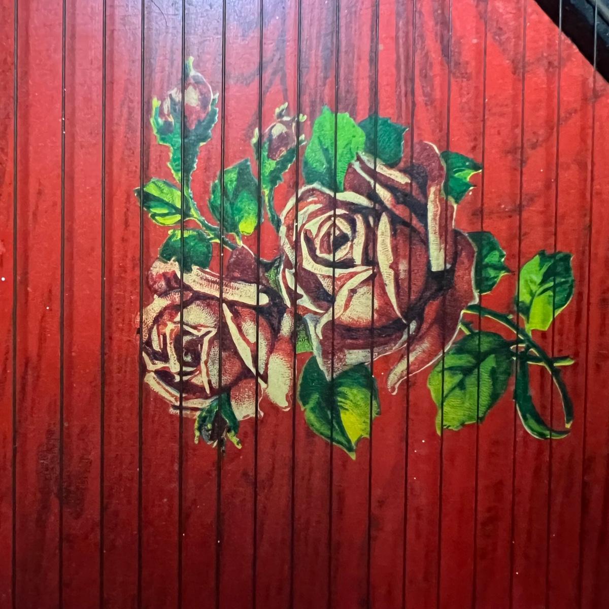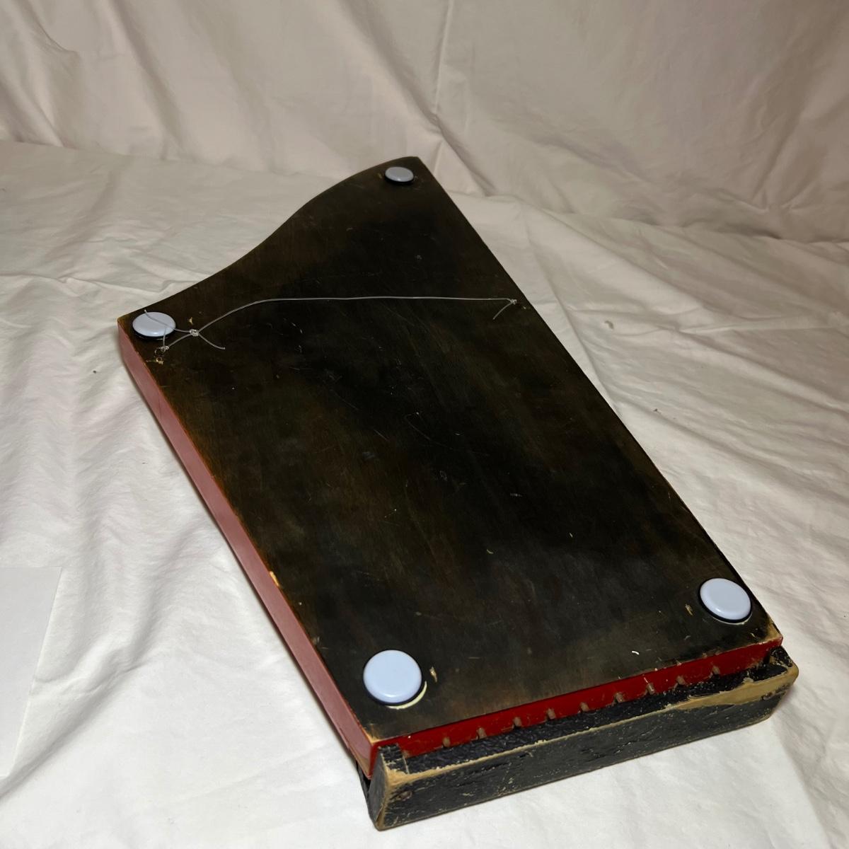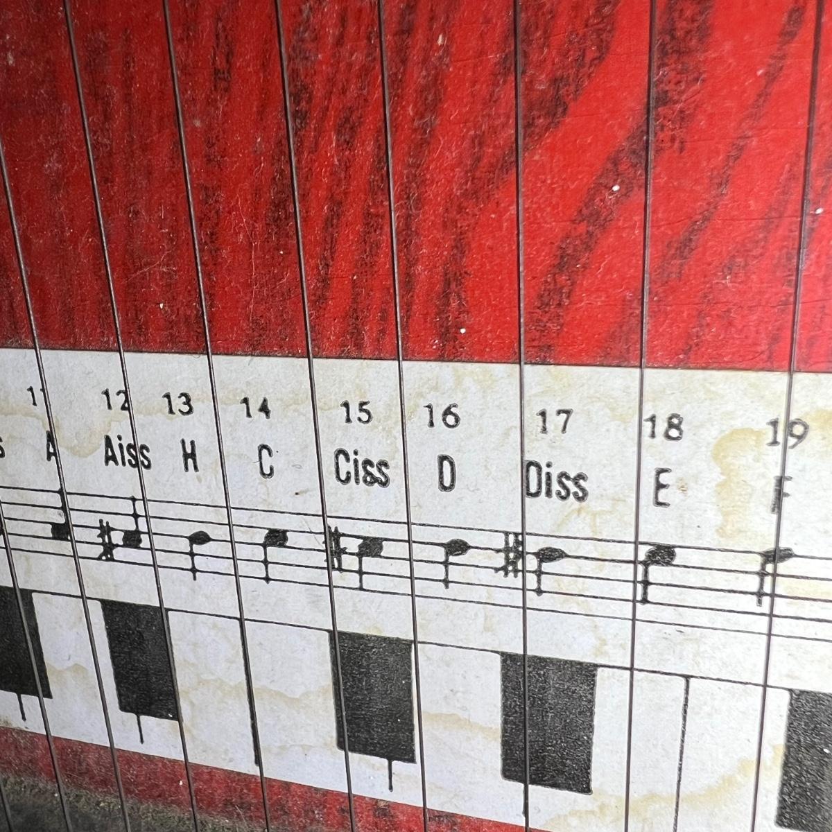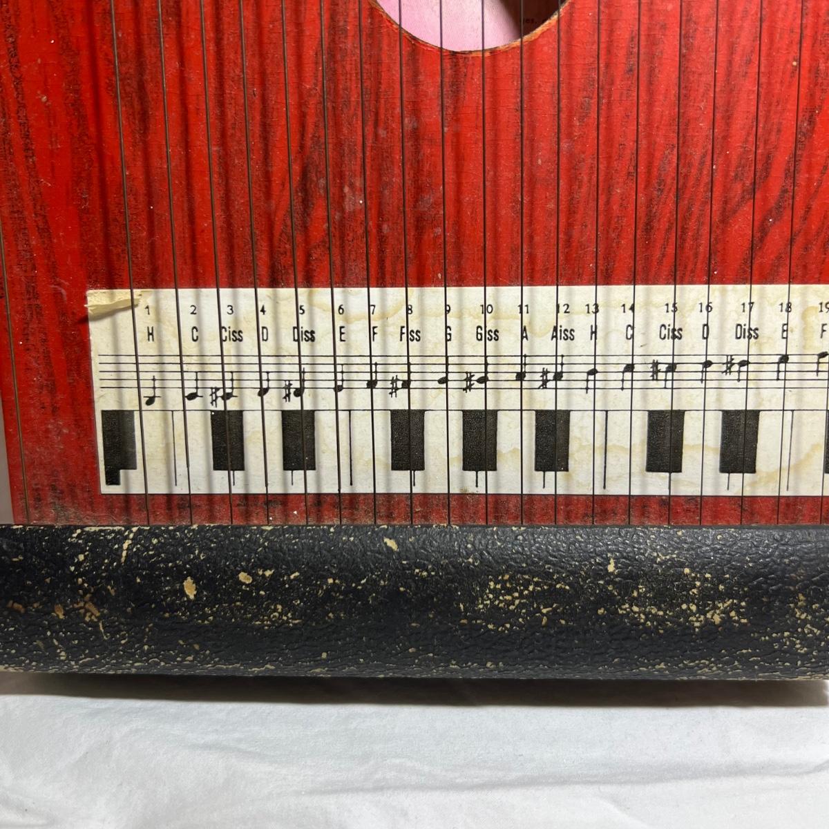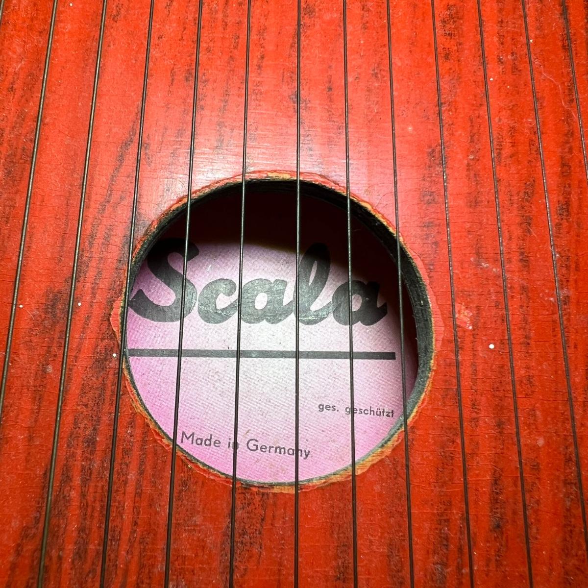 This vintage Scala zither is red with a rose motif. It has foreign keys as it was Made in Germany.