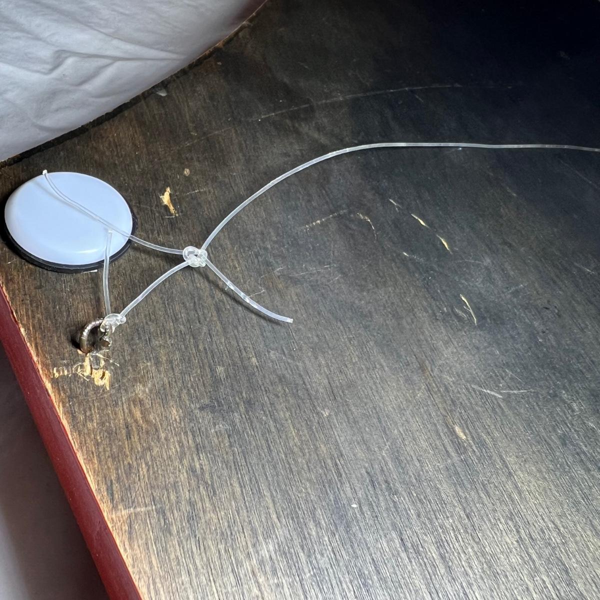 Currently has fishing wire in place to hang it and wall plastic protectors on the corners.