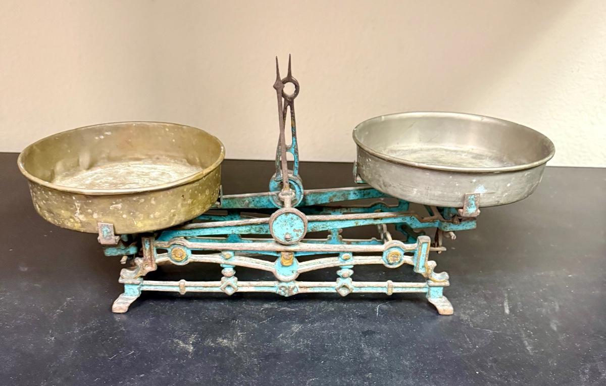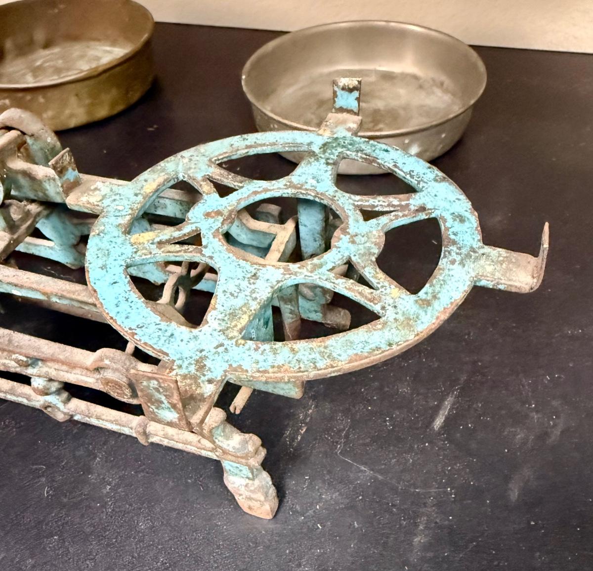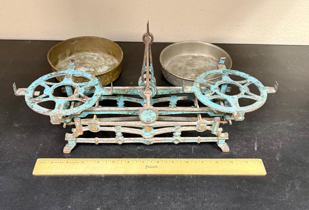 This is a vintage cast iron balance scale with brass pans.