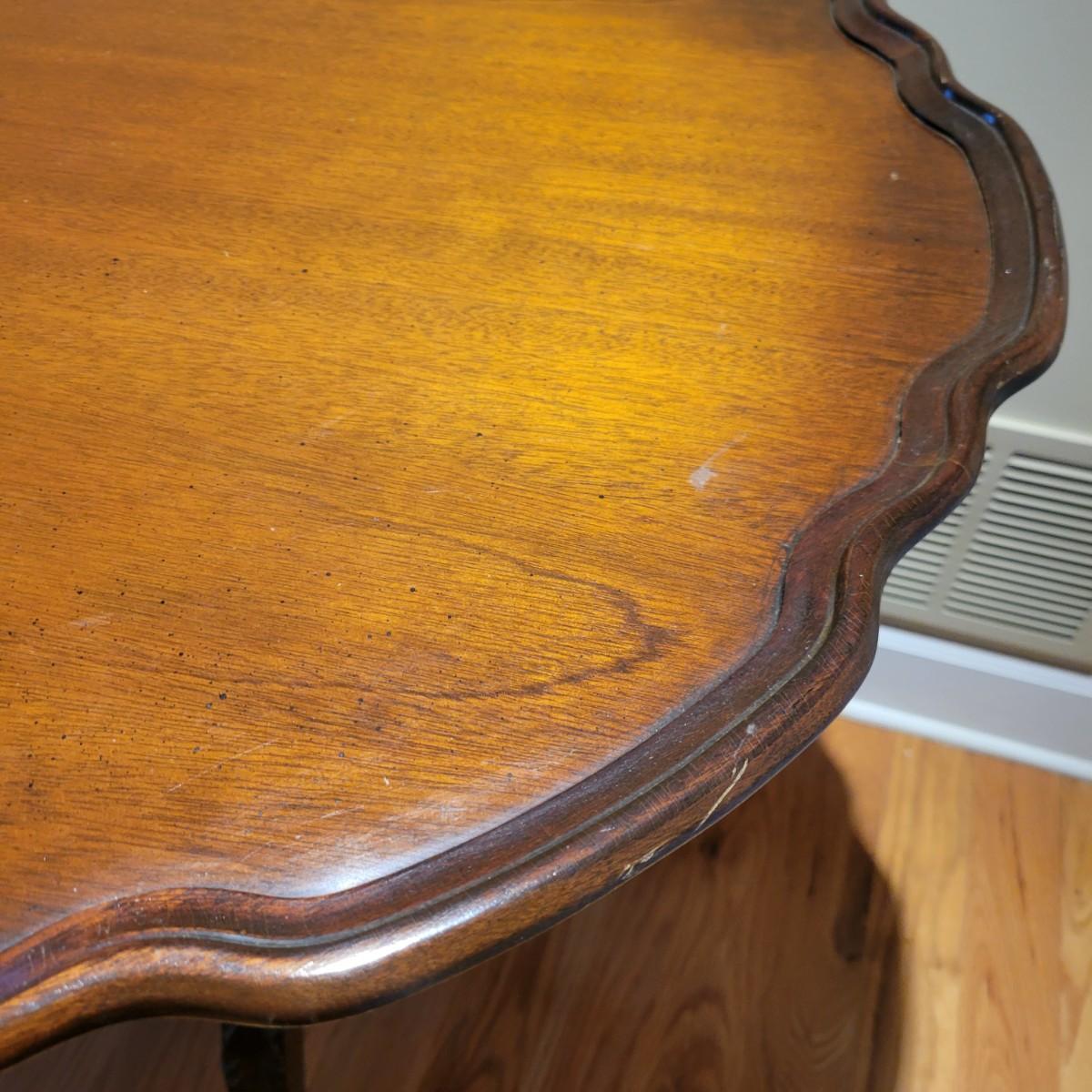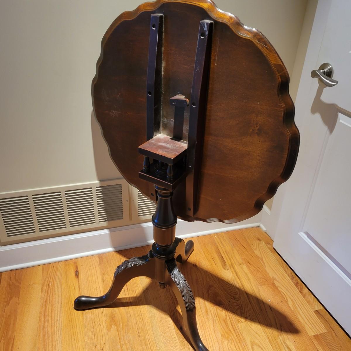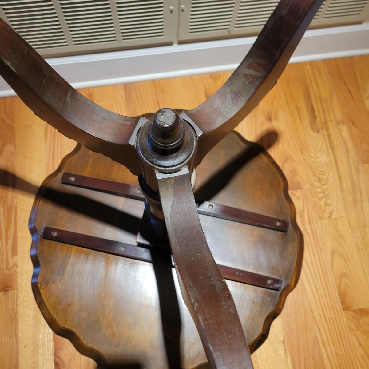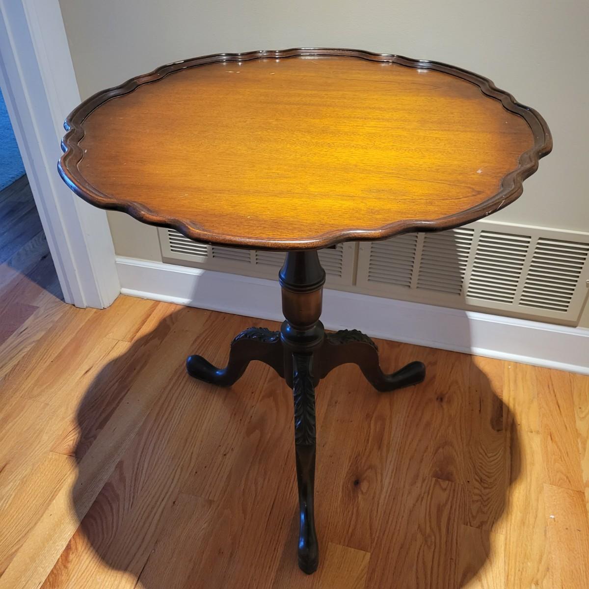 A tilt top table in good condition with some minor blemishes and scratches. This table features a scalloped edge and has a convenient tilt top design. It is made of solid wood and has rich medium stain. Measures approximately 30"D x 30"H. Local pickup only