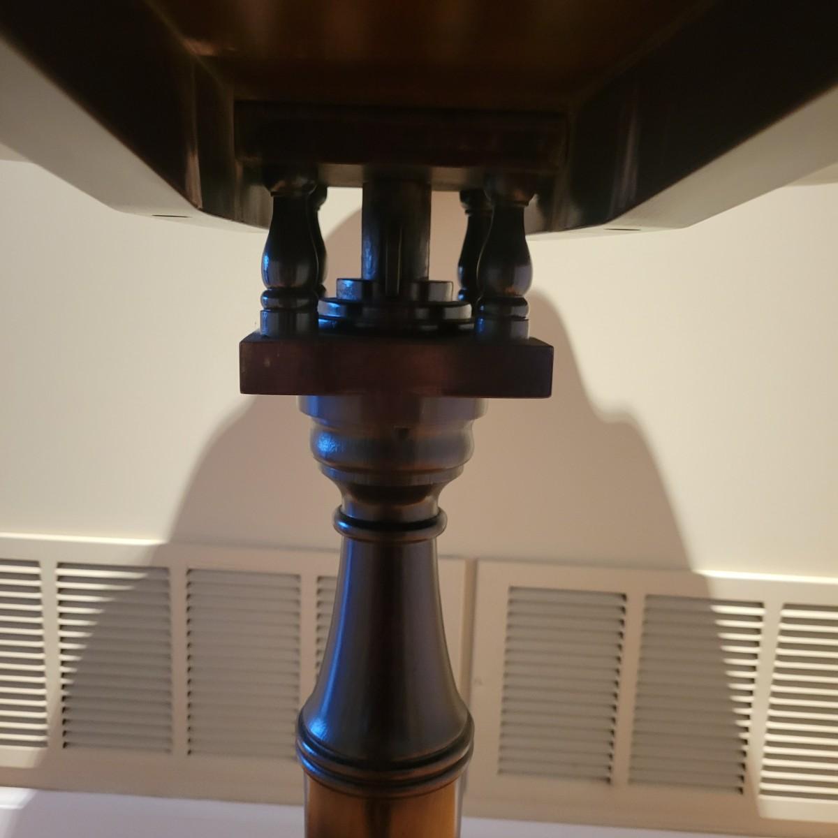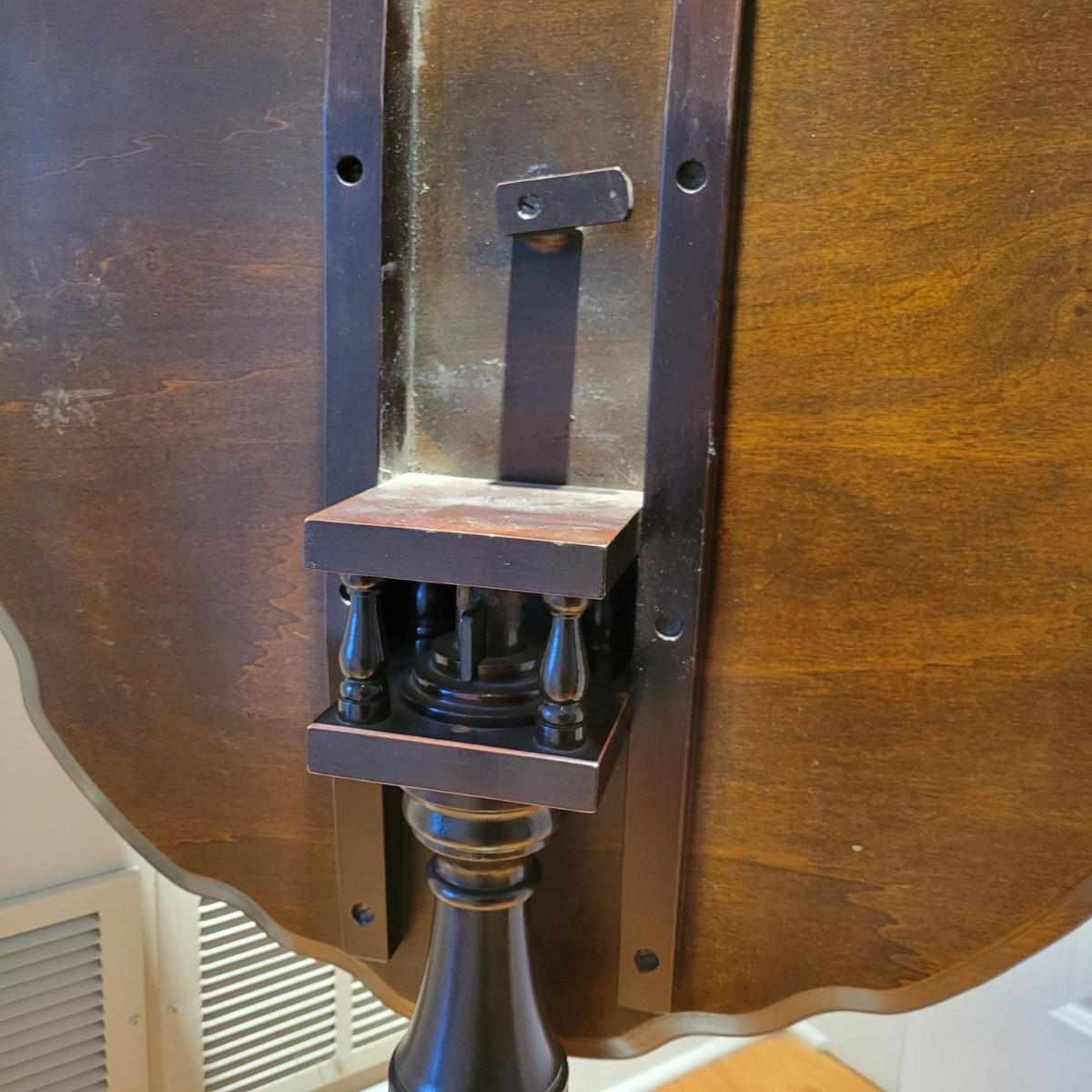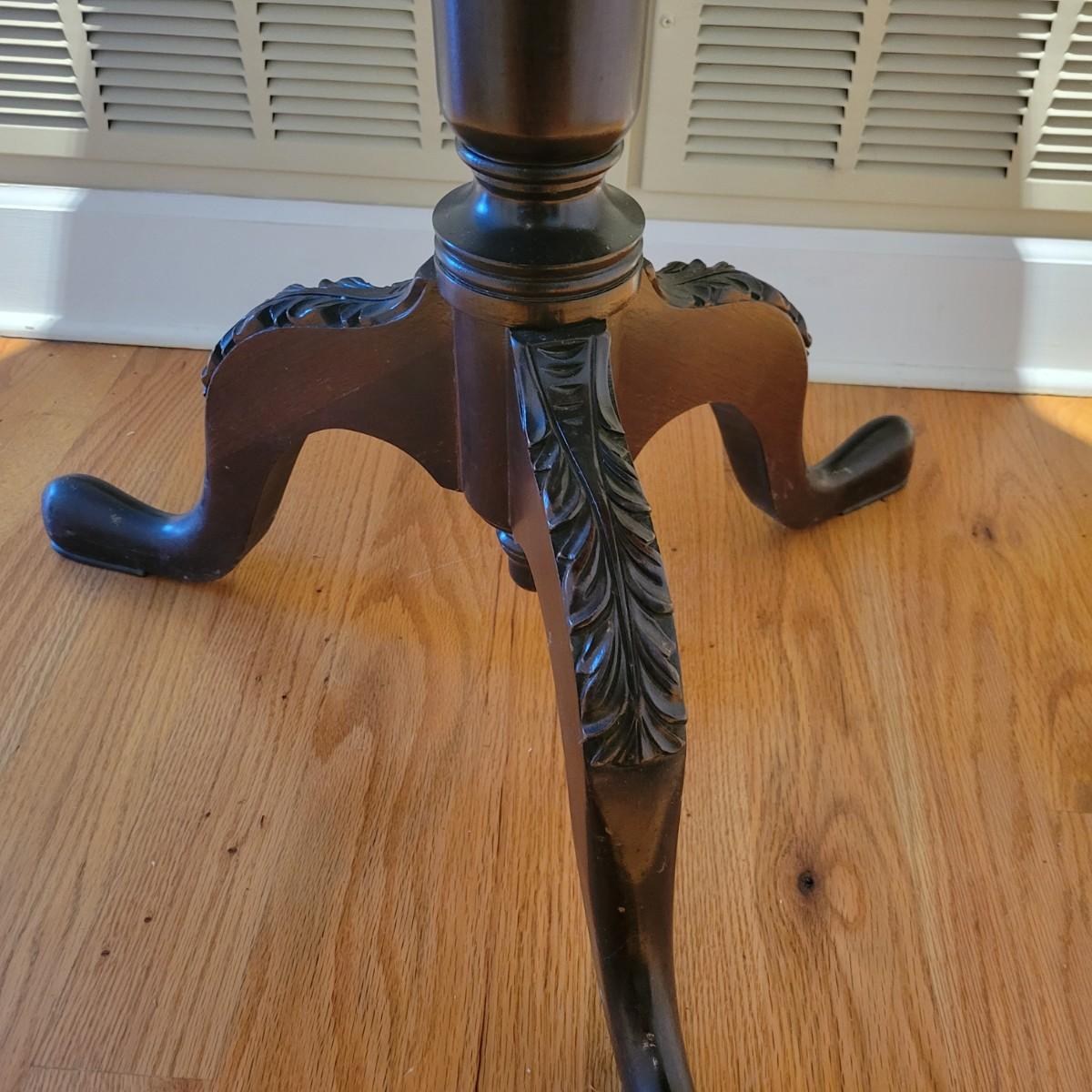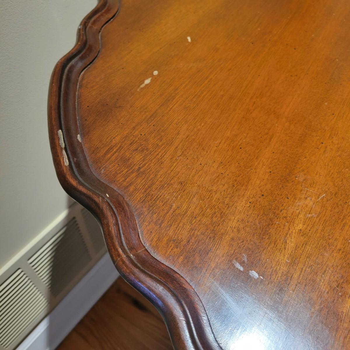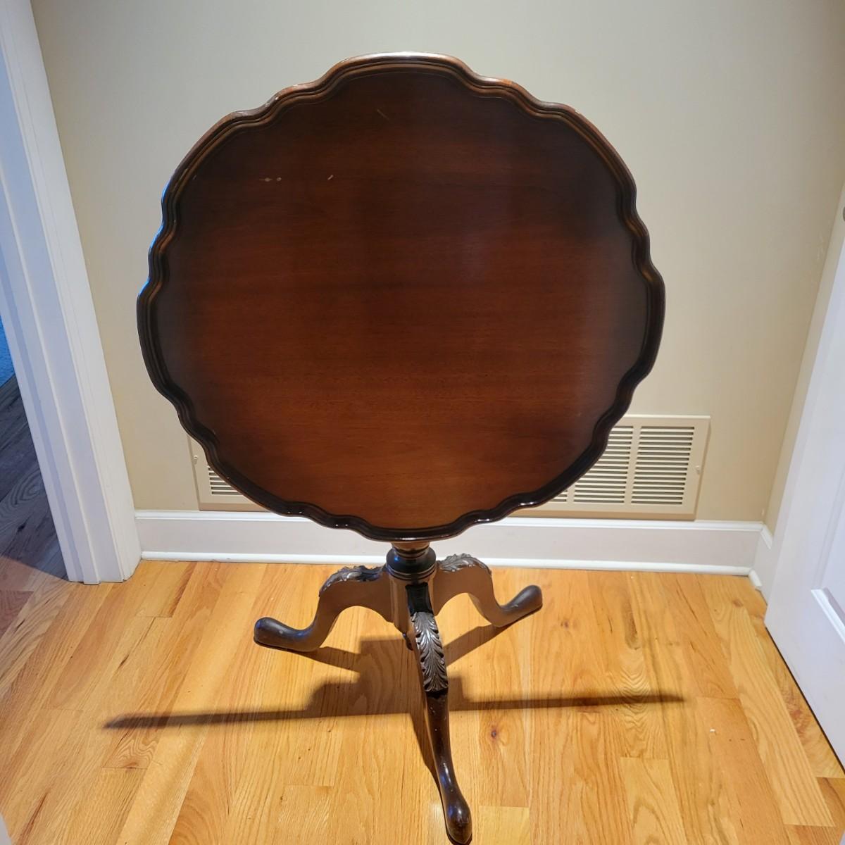 A tilt top table in good condition with some minor blemishes and scratches. This table features a scalloped edge and has a convenient tilt top design. It is made of solid wood and has rich medium stain. Measures approximately 30"D x 30"H. Local pickup only