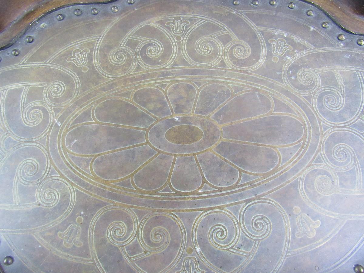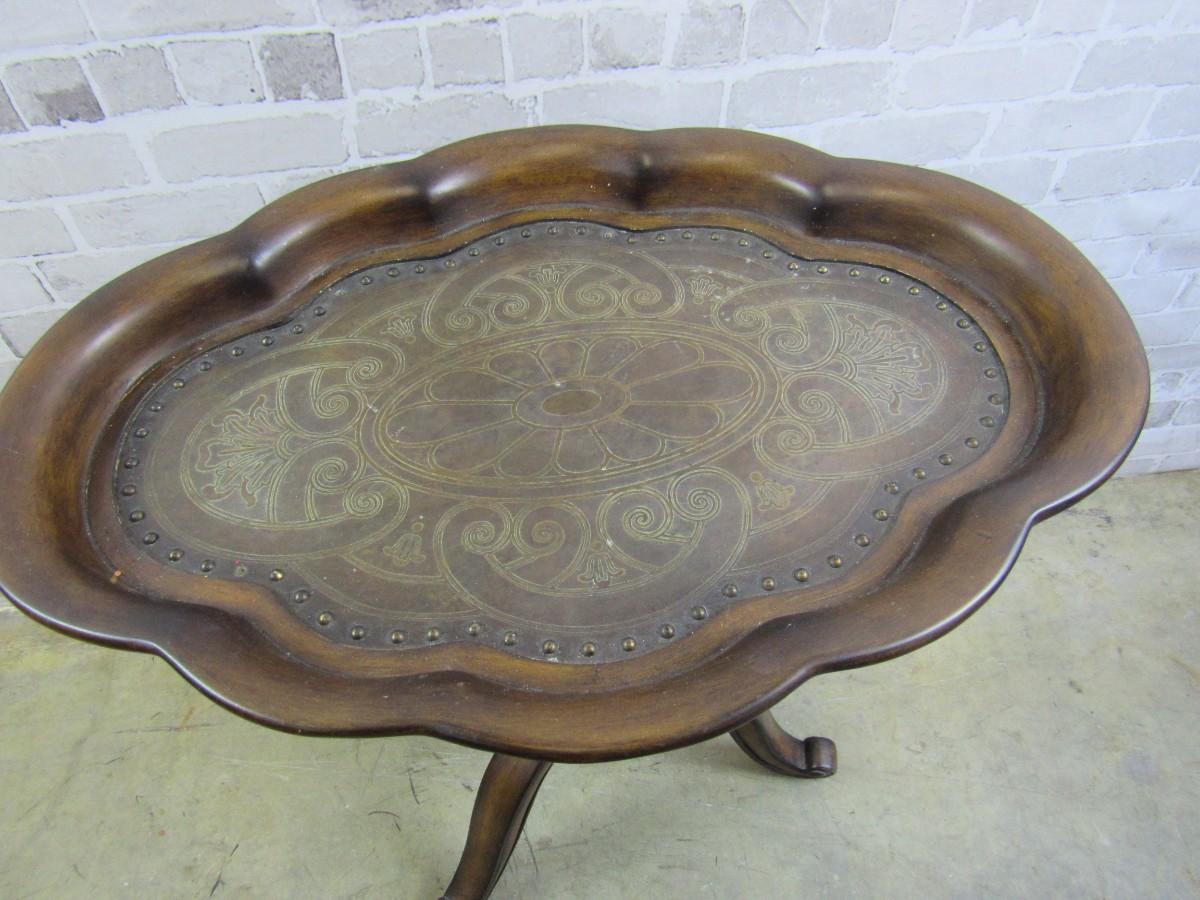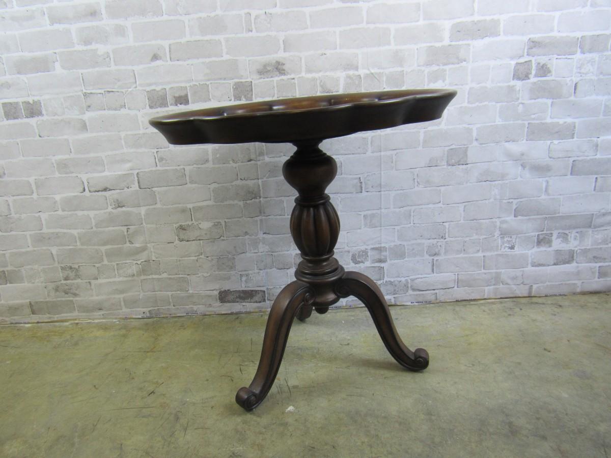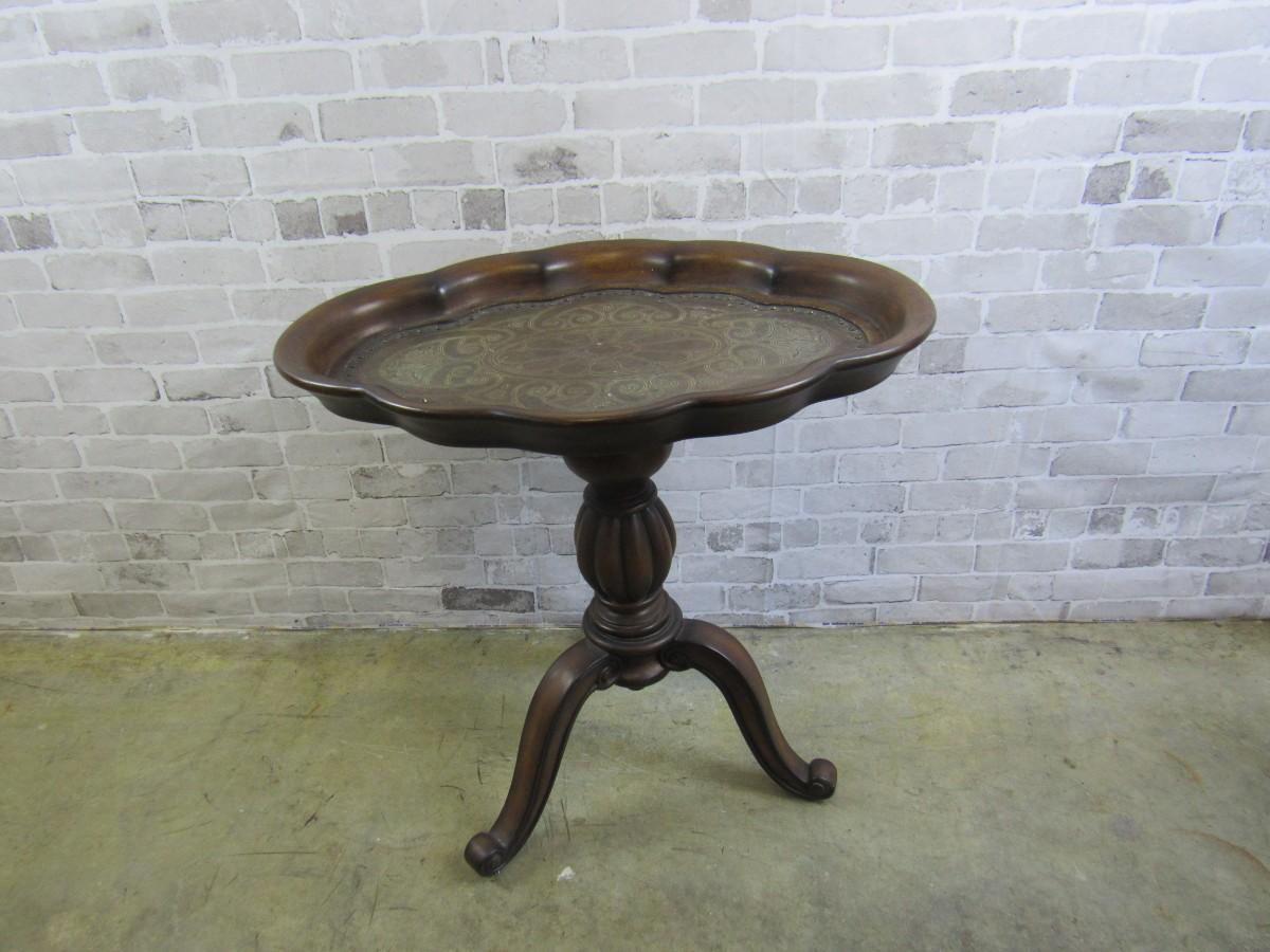 Scalloped Edge Accent Table with metal Inset Top & Nail Head Trim. 26" wide x 18" deep x 26 1/2" high.