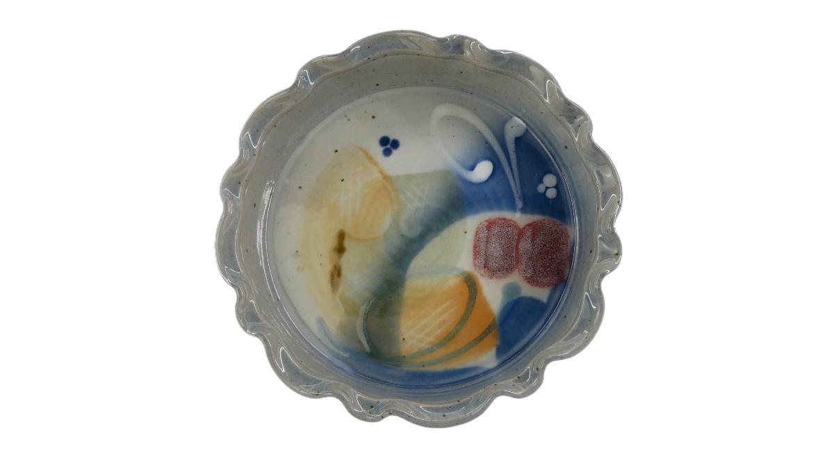 Asian influenced art pottery dish with scalloped, crimped edges. Beautiful design and glaze! Measures 9.5" in diameter and 2" deep. Weighs 1 lb 11 oz. No issues found. (D4)