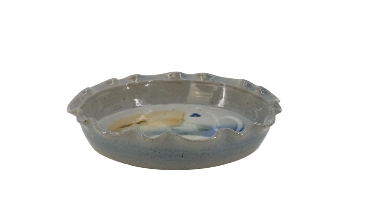 Asian influenced art pottery dish with scalloped, crimped edges. Beautiful design and glaze! Measures 9.5" in diameter and 2" deep. Weighs 1 lb 11 oz. No issues found. (D4)