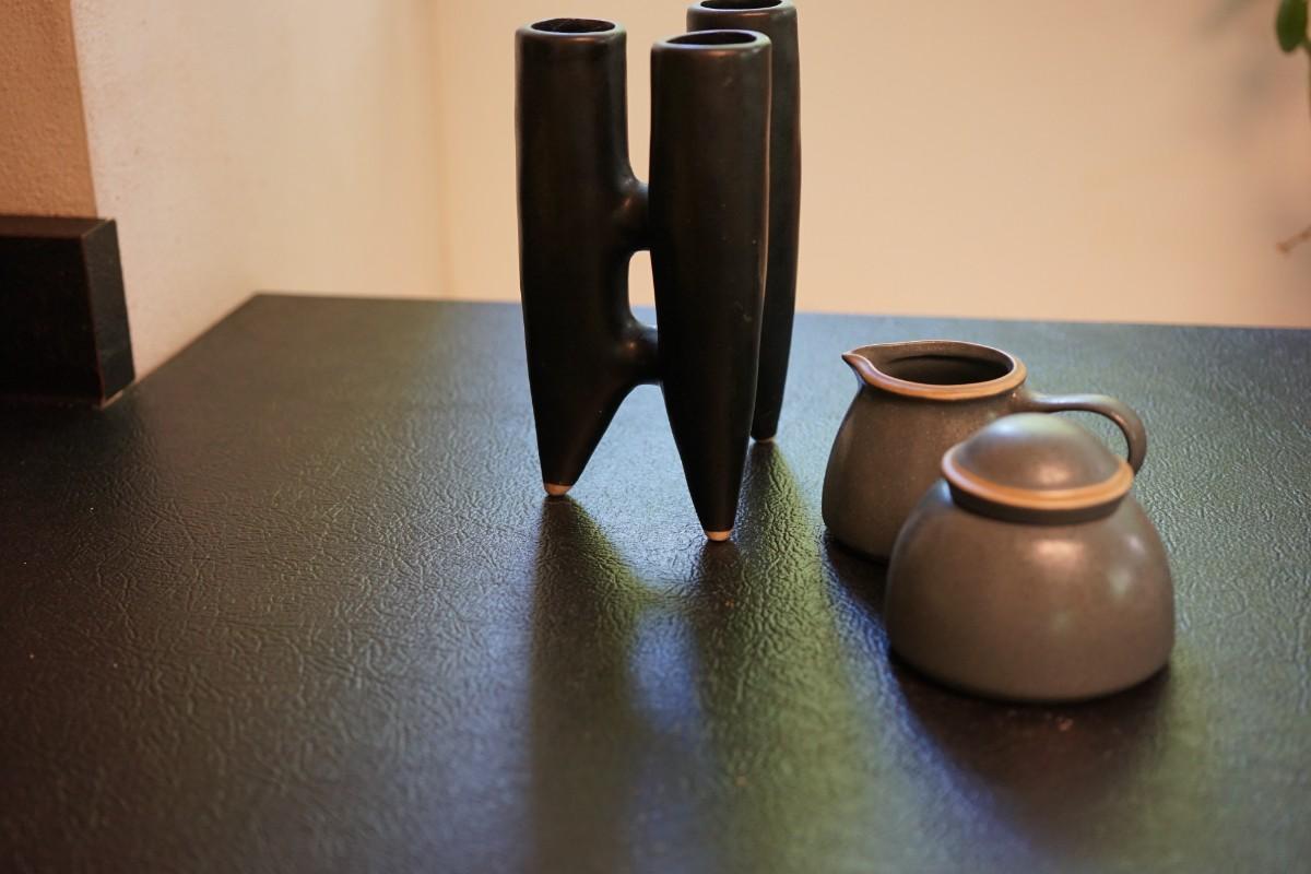 SCANDINAVIAN CERAMIC CANDLEHOLDER OF THREE FORMS/ DANSK CREAMER AND SUGAR