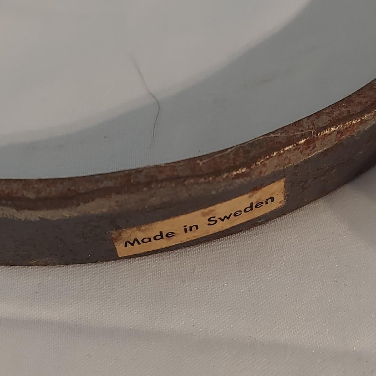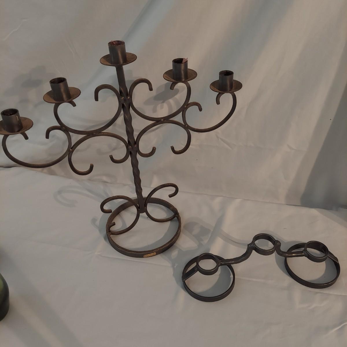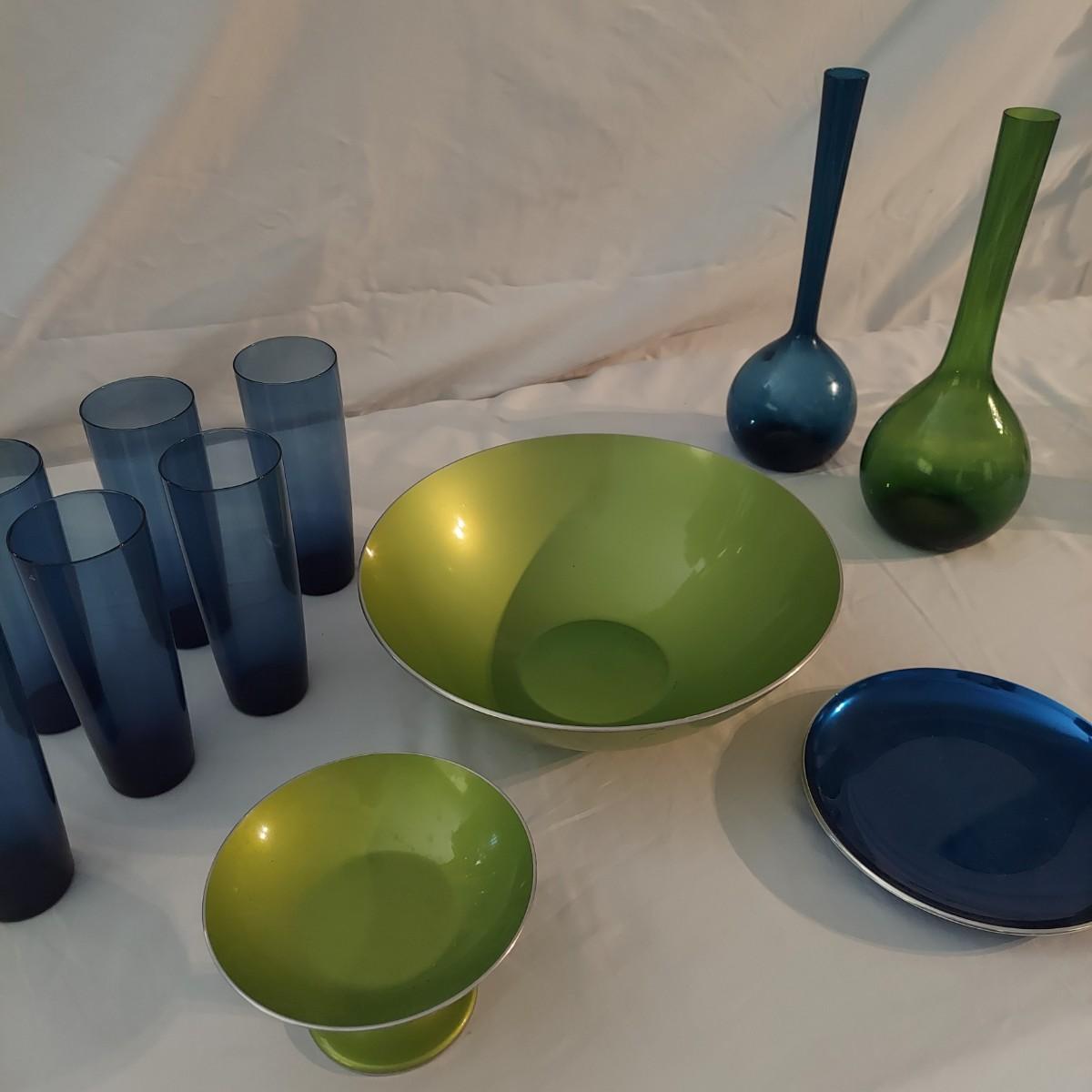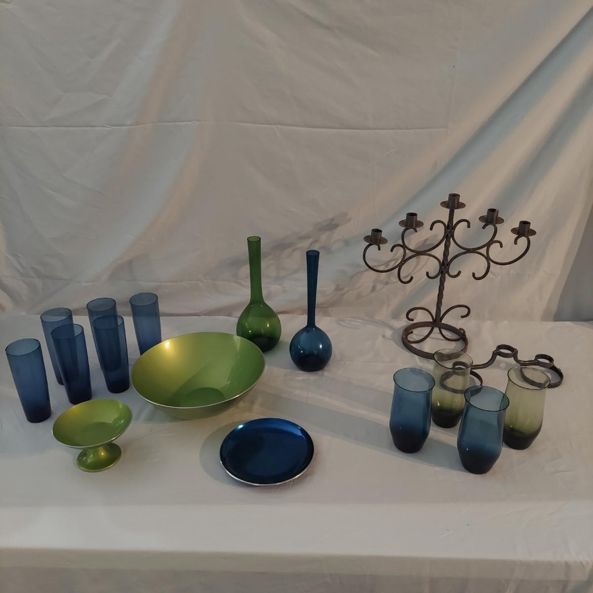 Lot includes two glass bud vases marked Aseda Sweden, two metal bowls marked Emalox Norway, a metal plate marked Olden Norway and two iron candle holders marked made in Sweden. Also include two sets of delicate glassware in a similar style to the vases. The vases measure 12"H. The large candle holder is 16" x 15"H. More measurements shown. Please see photos for details. Shipping available.