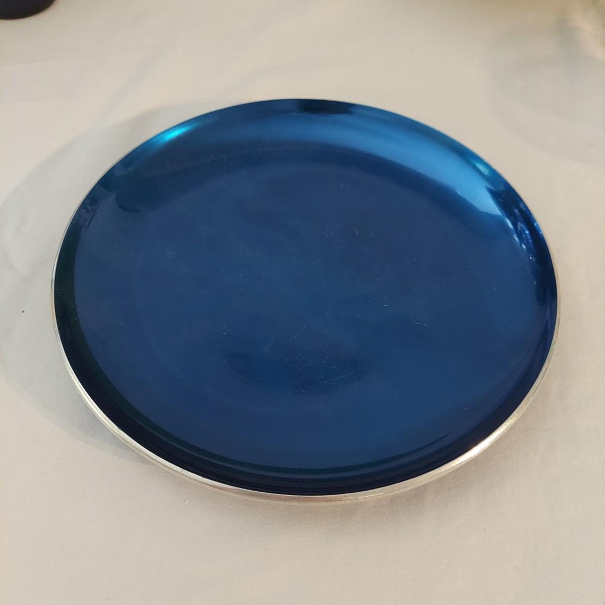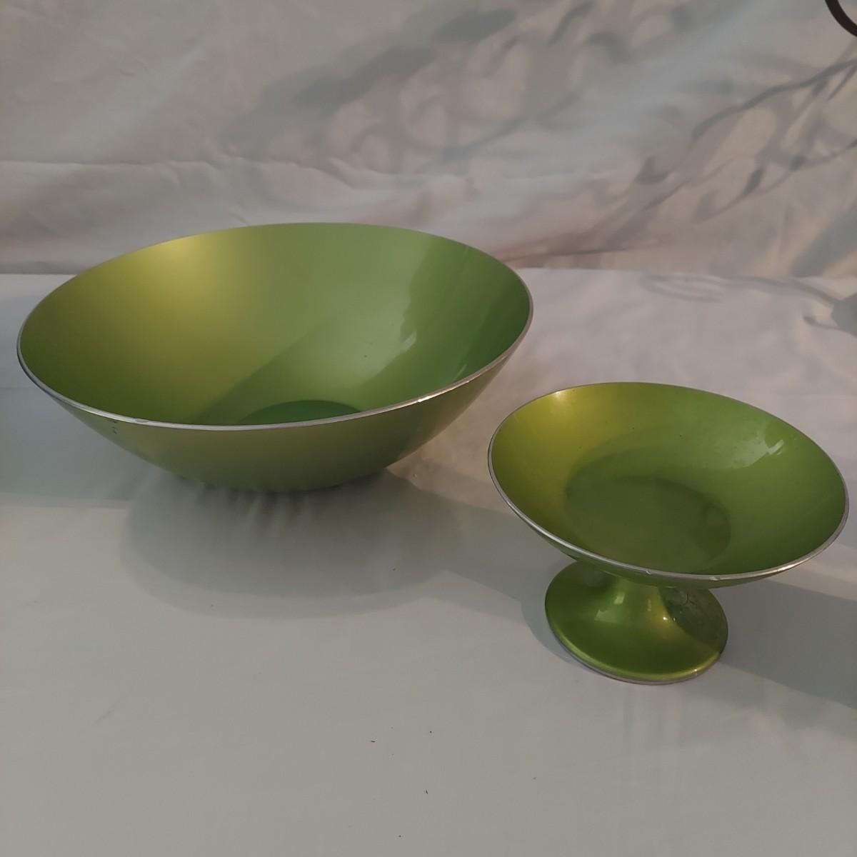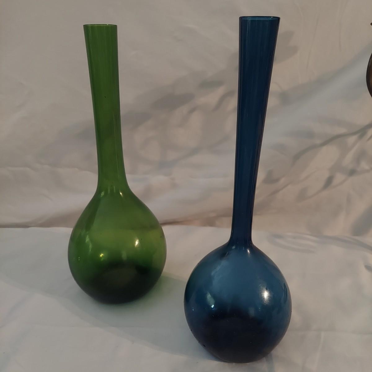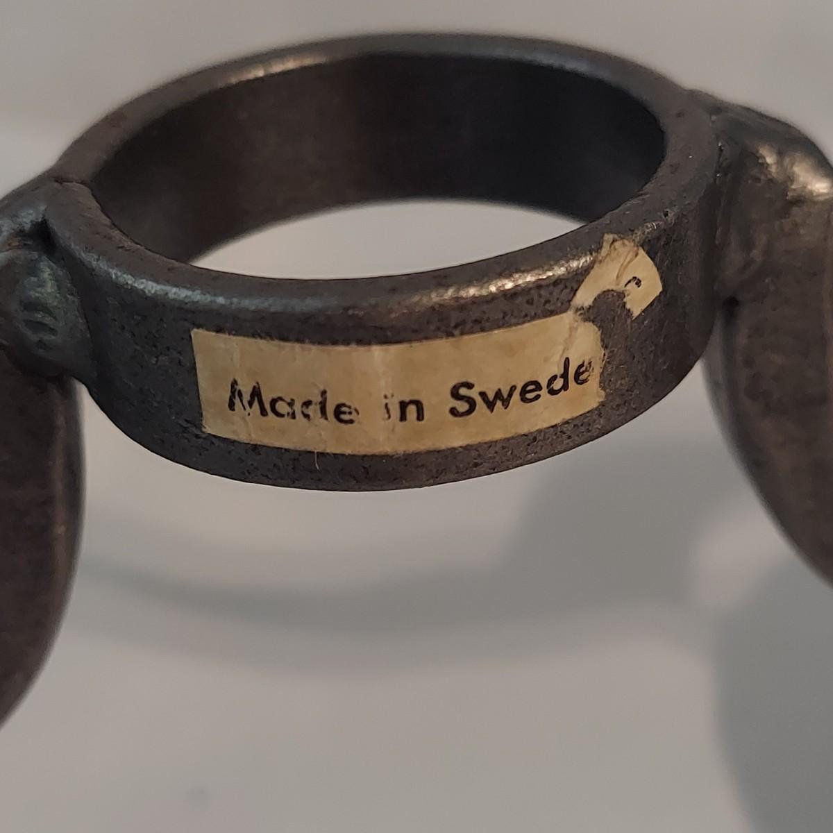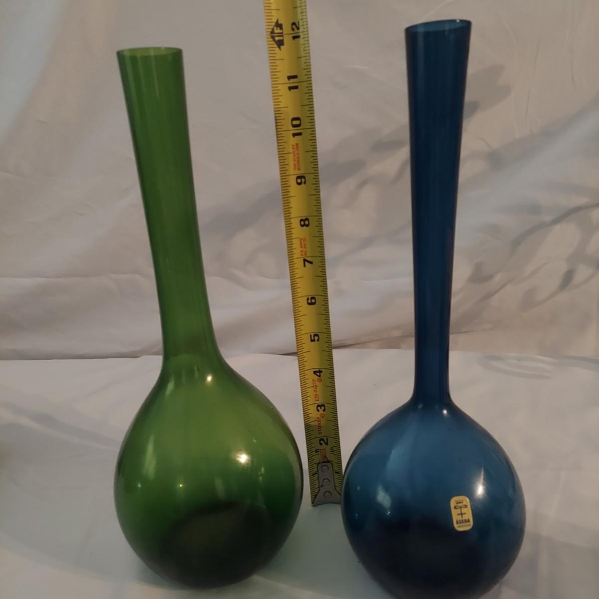 Lot includes two glass bud vases marked Aseda Sweden, two metal bowls marked Emalox Norway, a metal plate marked Olden Norway and two iron candle holders marked made in Sweden. Also include two sets of delicate glassware in a similar style to the vases. The vases measure 12"H. The large candle holder is 16" x 15"H. More measurements shown. Please see photos for details. Shipping available.
