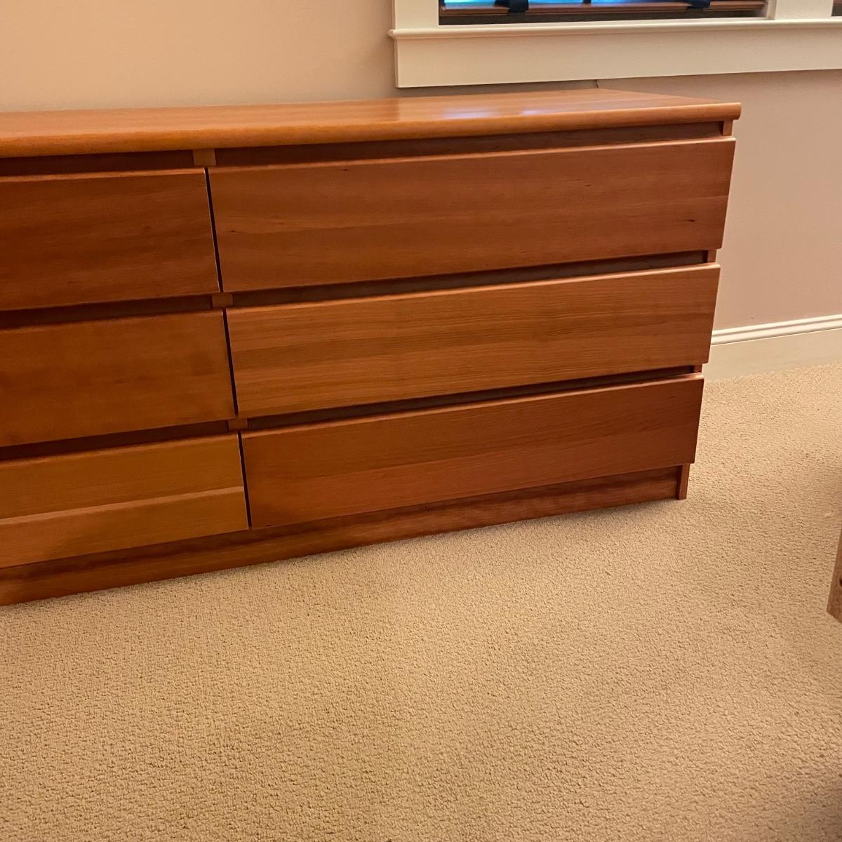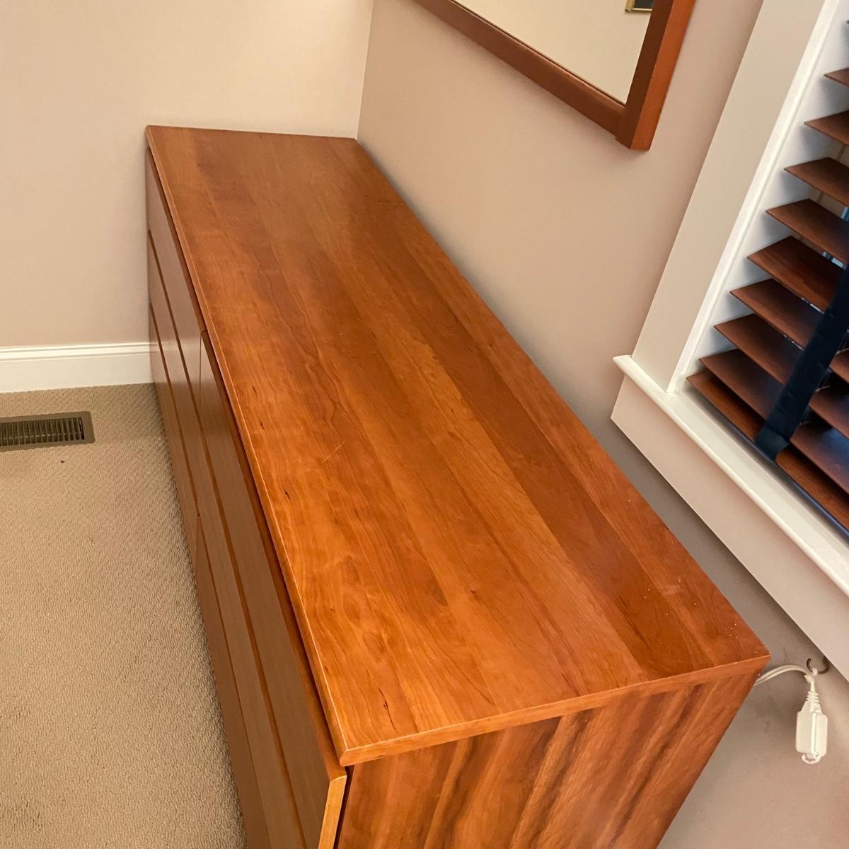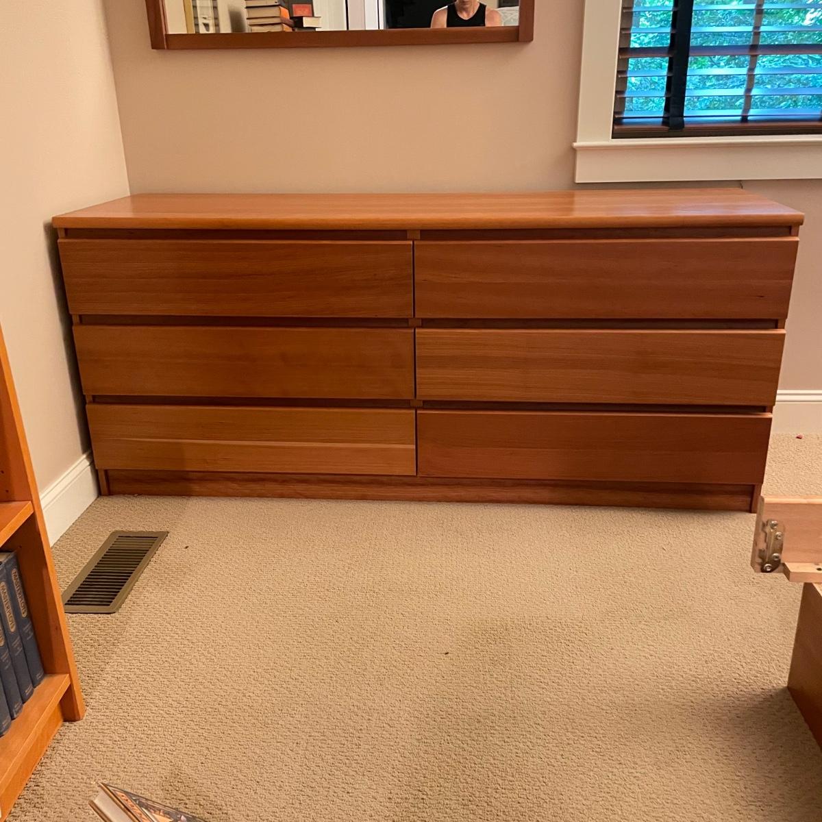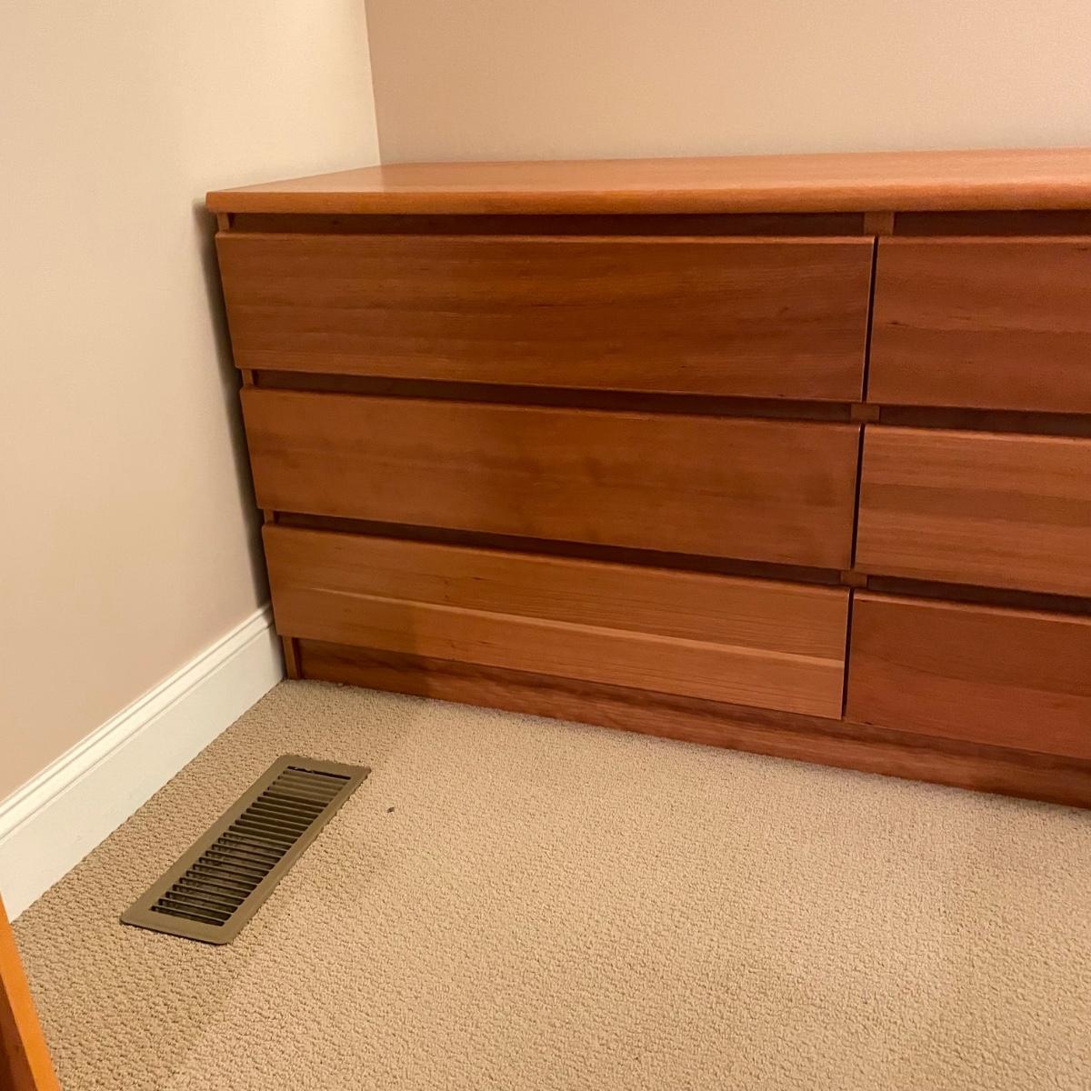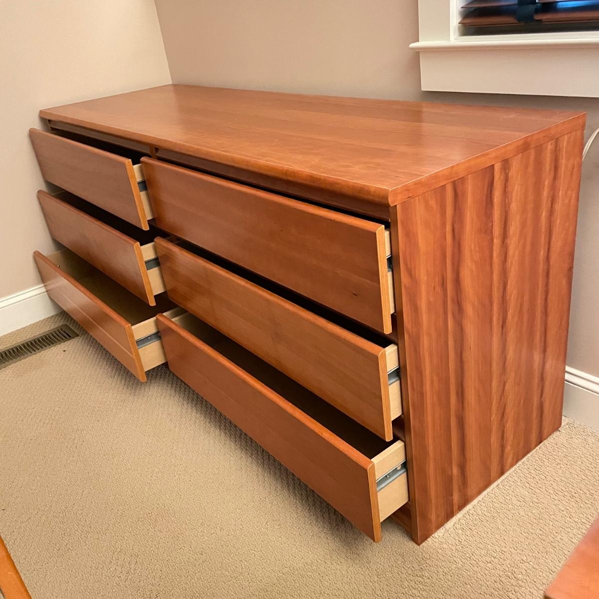 Beautiful warm colored six-drawer wood dresser seems to match the storage bed elsewhere in this auction. Drawers slide easy and piece has very little blemishes. Known blemishes include a scratch on top and what appears to be white paint splatter. Color change on bottom drawer isn’t a blemish, but a difference in wood grain. Wood is likely pressed, dresser is very heavy. See images.