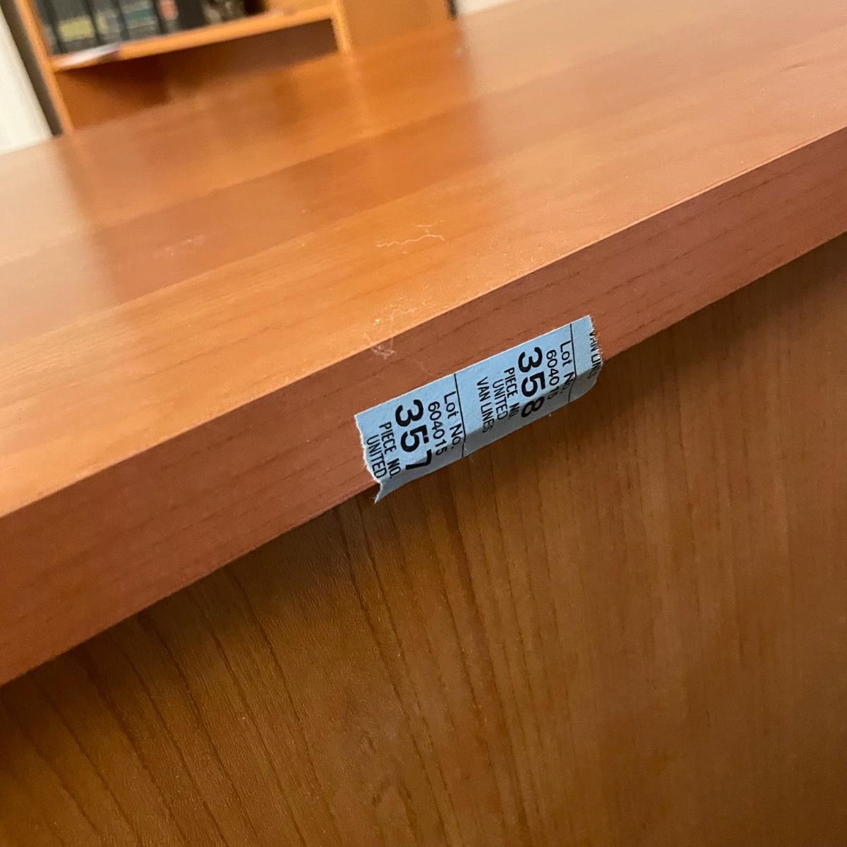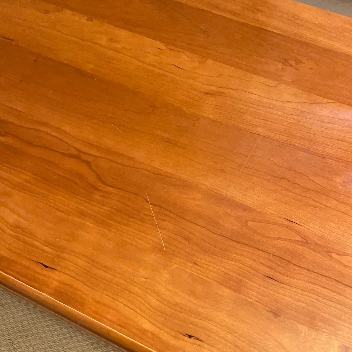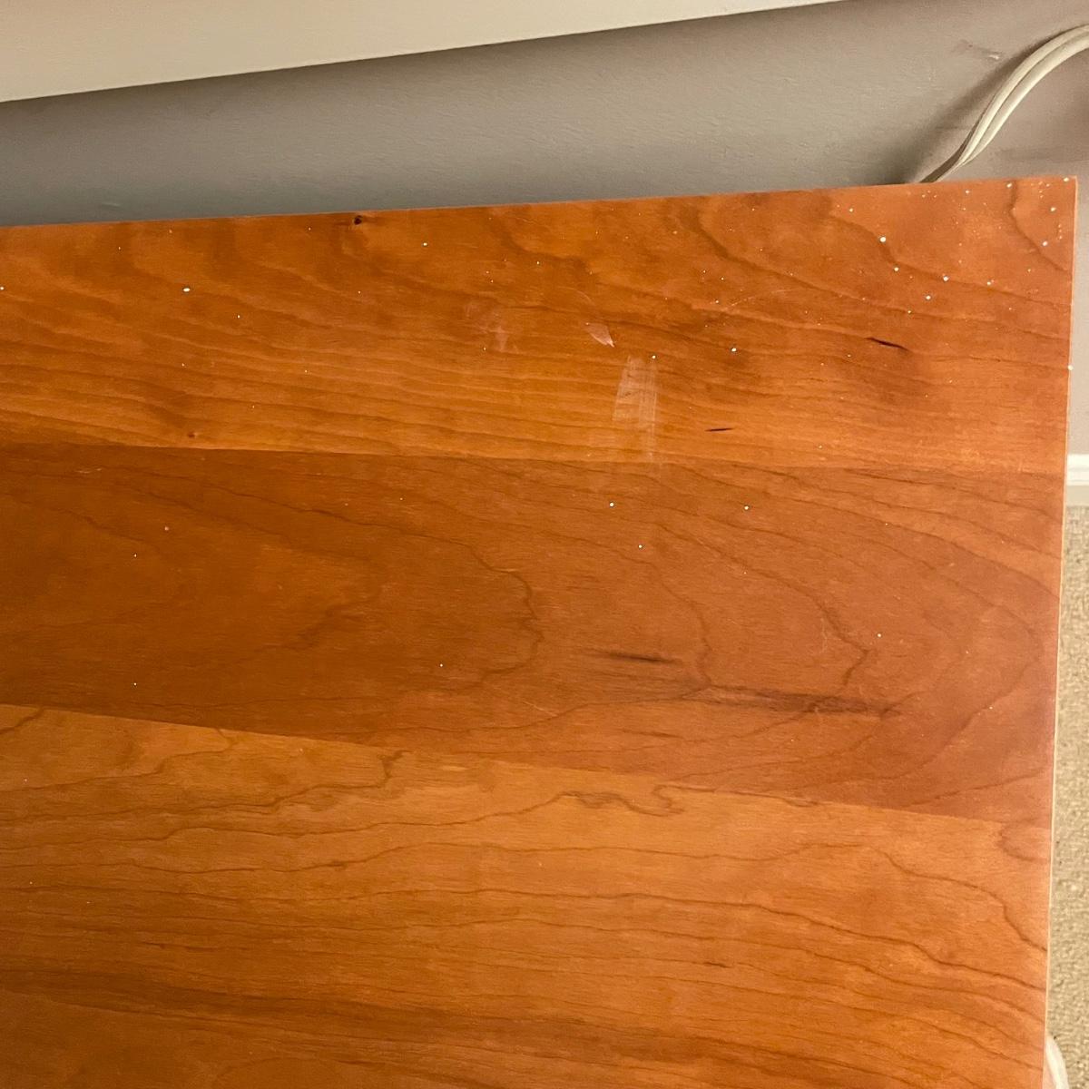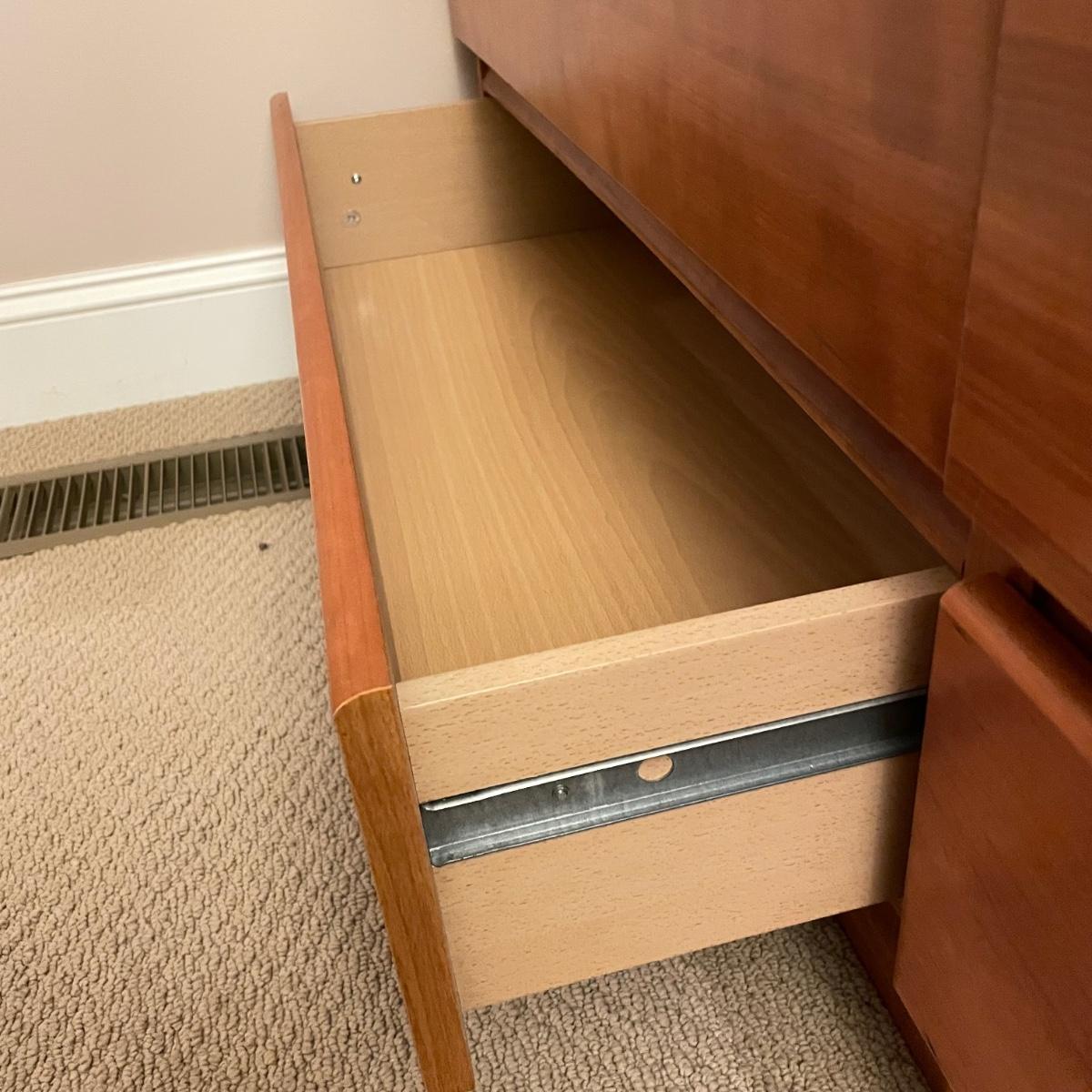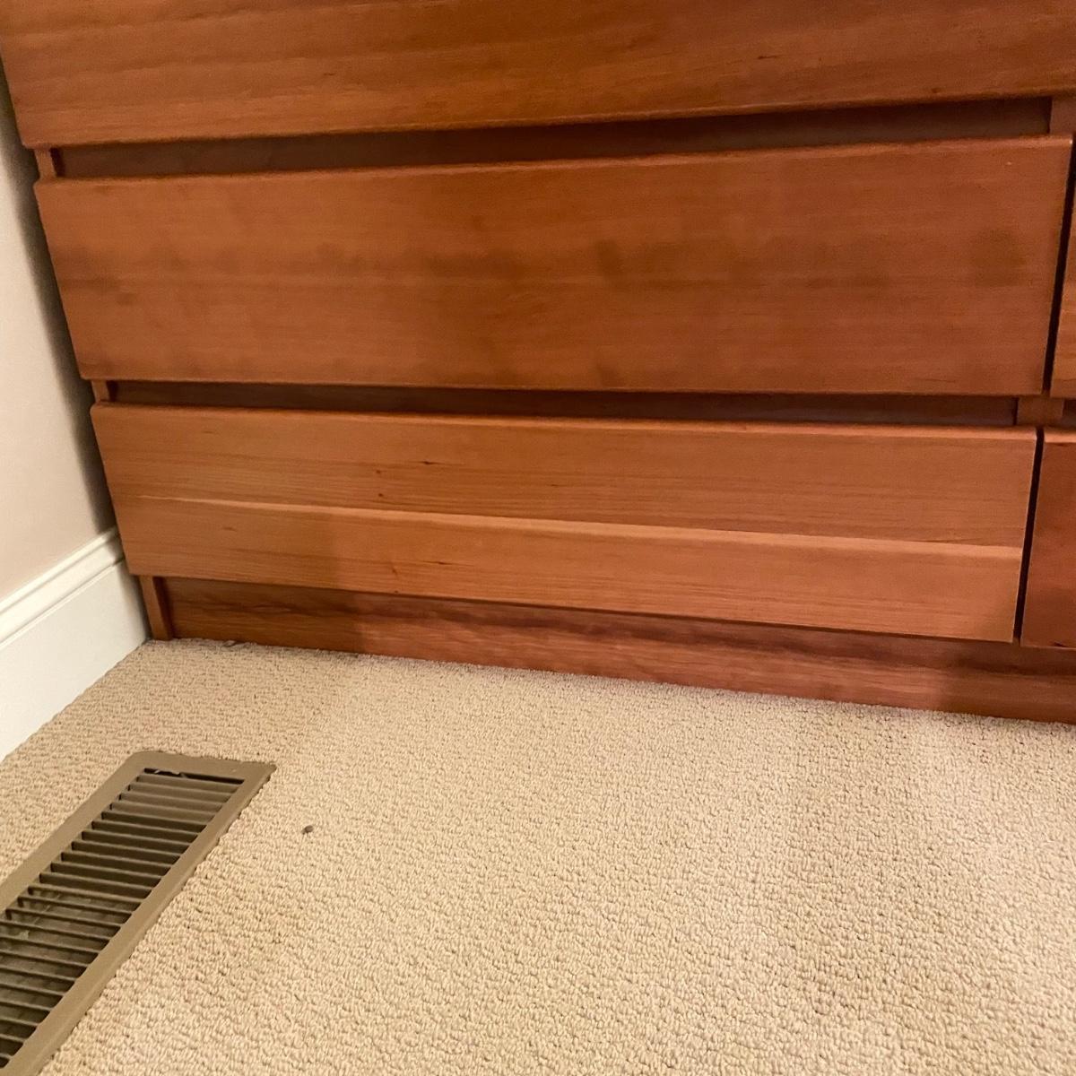 Beautiful warm colored six-drawer wood dresser seems to match the storage bed elsewhere in this auction. Drawers slide easy and piece has very little blemishes. Known blemishes include a scratch on top and what appears to be white paint splatter. Color change on bottom drawer isn’t a blemish, but a difference in wood grain. Wood is likely pressed, dresser is very heavy. See images.