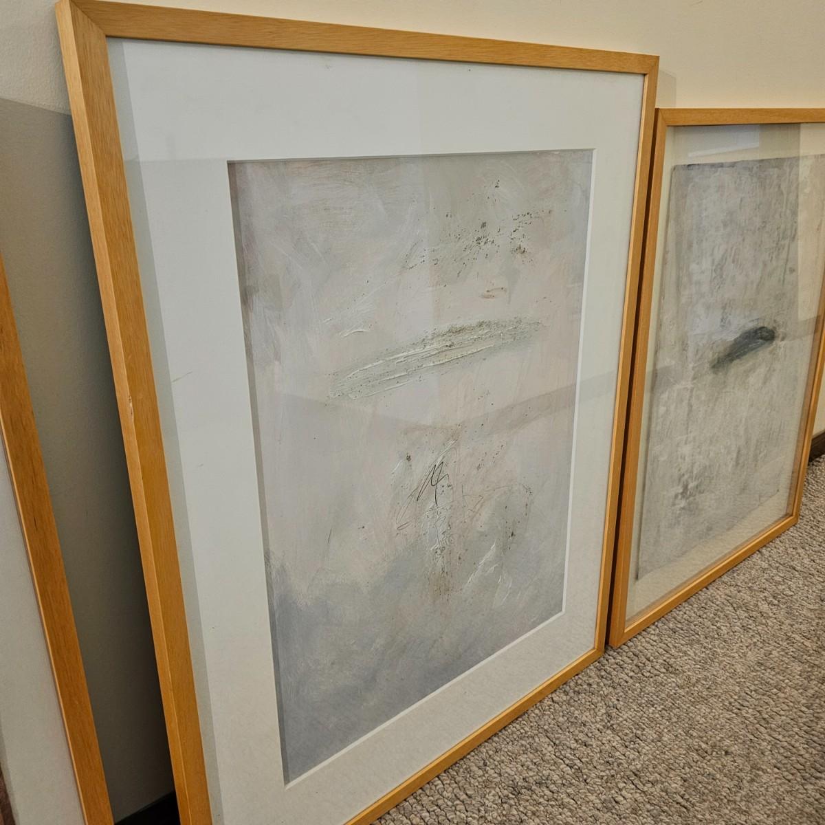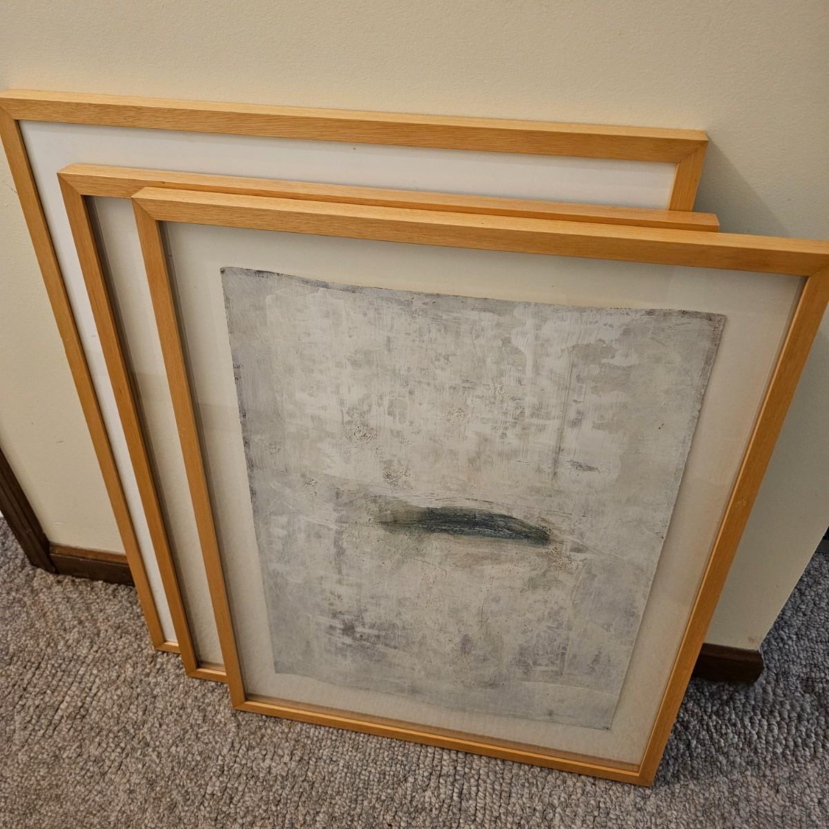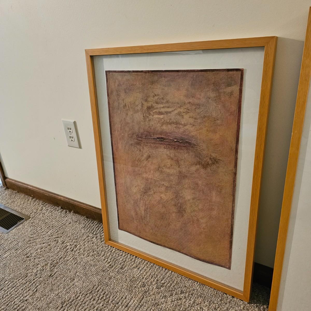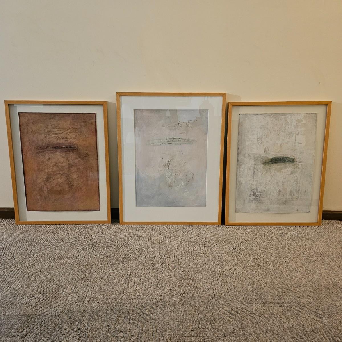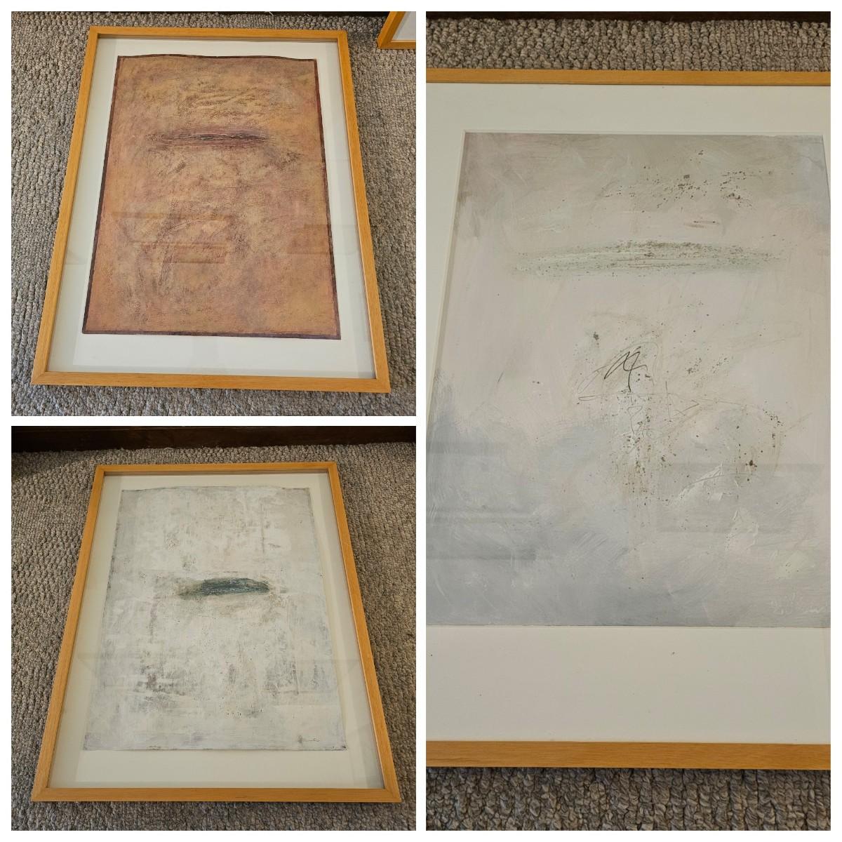 A trio of mixed media images in the 'Scar' series by artist Joyce Blunk. Includes #'s 3, 4 & 7, all are wood framed and under glass. Two smaller frames measure 25" x 32", larger image is 23" x 30". Hangers and name/signatures on backs as well as signatures on front in the media. See photos for details. Shipping available. Shipping can be costly. We suggest contacting our preferred local shipping provider, Postage Express, with dimensions and getting an estimate before bidding: (828) 255-9250 or shipping@postageexpressnc.com.