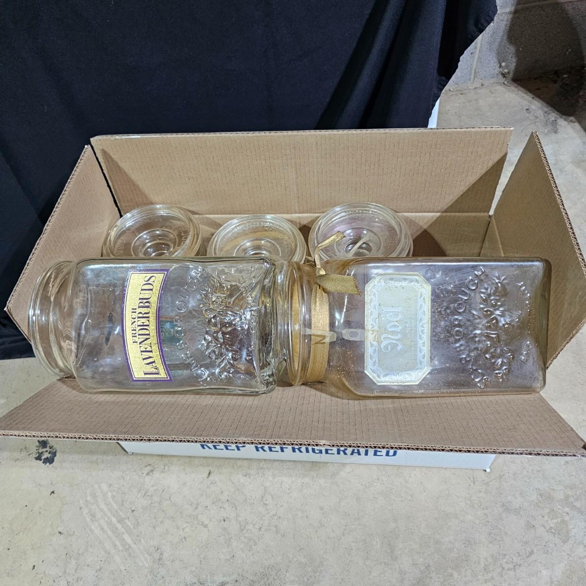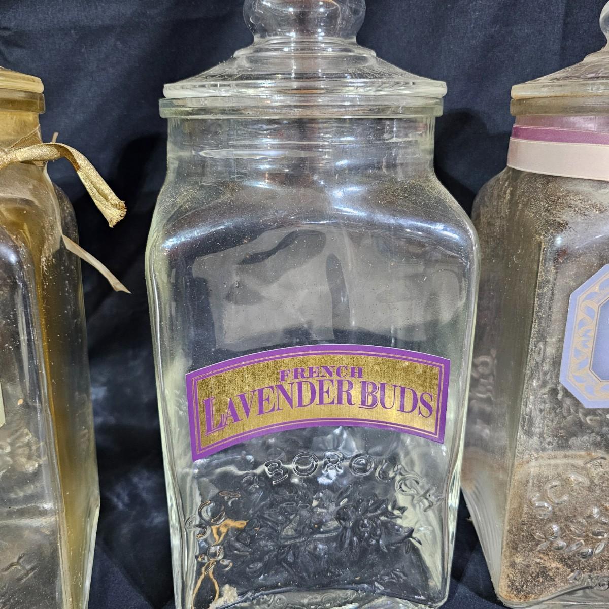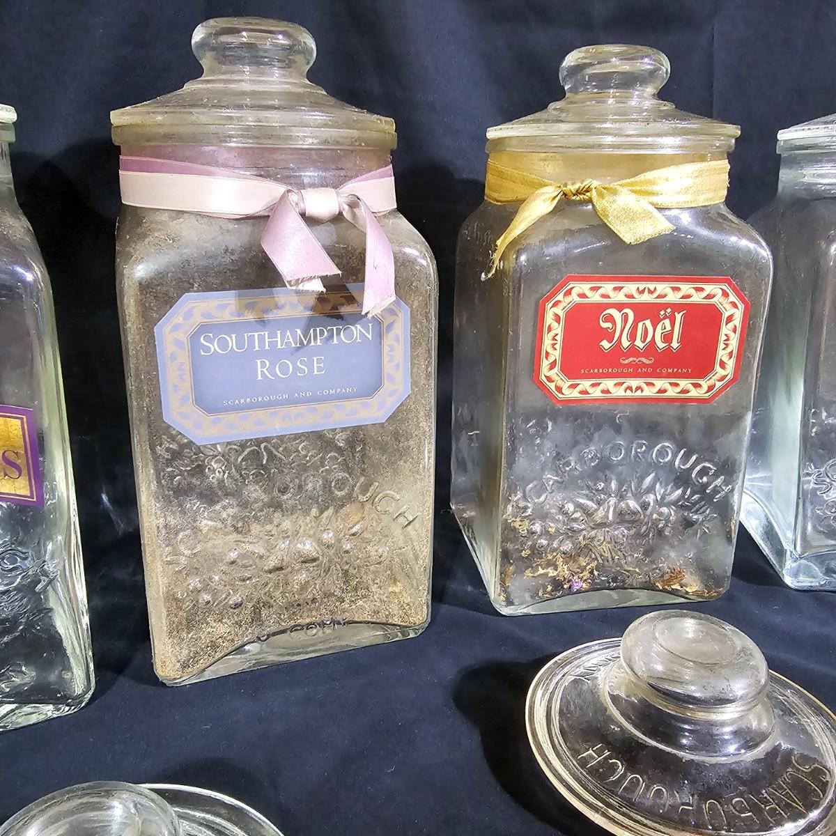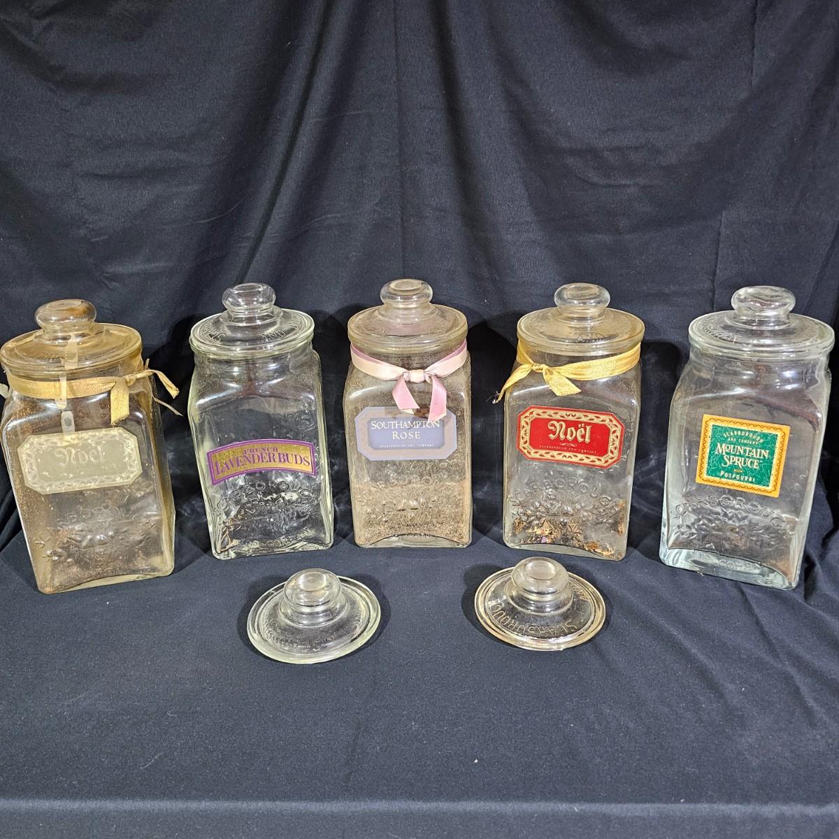 Five large apothecary jars from Scarborough & Company, appear to have held potpourri and other fragrant items. Jars have pressed logo of Company in the glass and on the lids. Jars measure 6.5"SQ x 13.5"H. Also includes two extra lids. See photos for details. Shipping available.