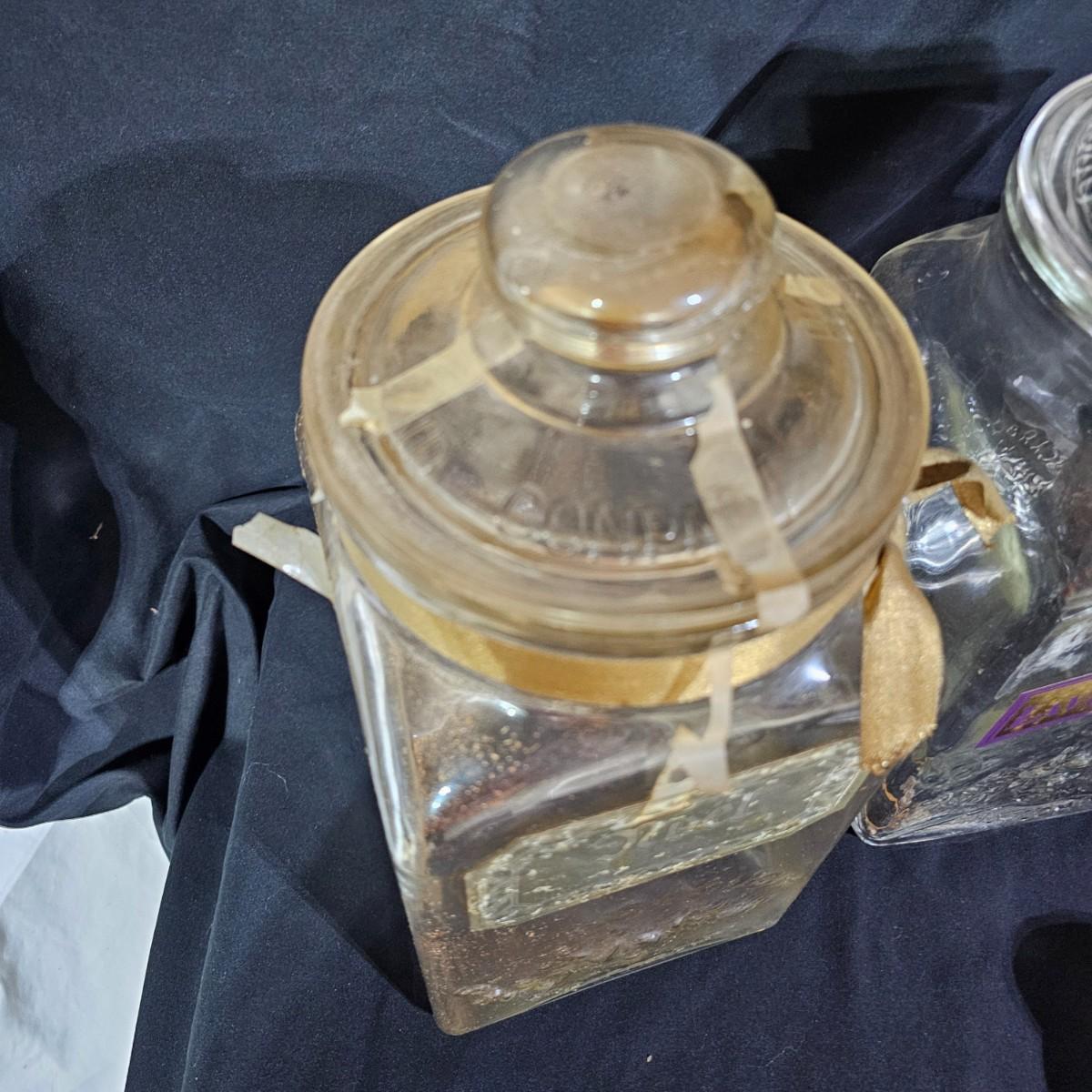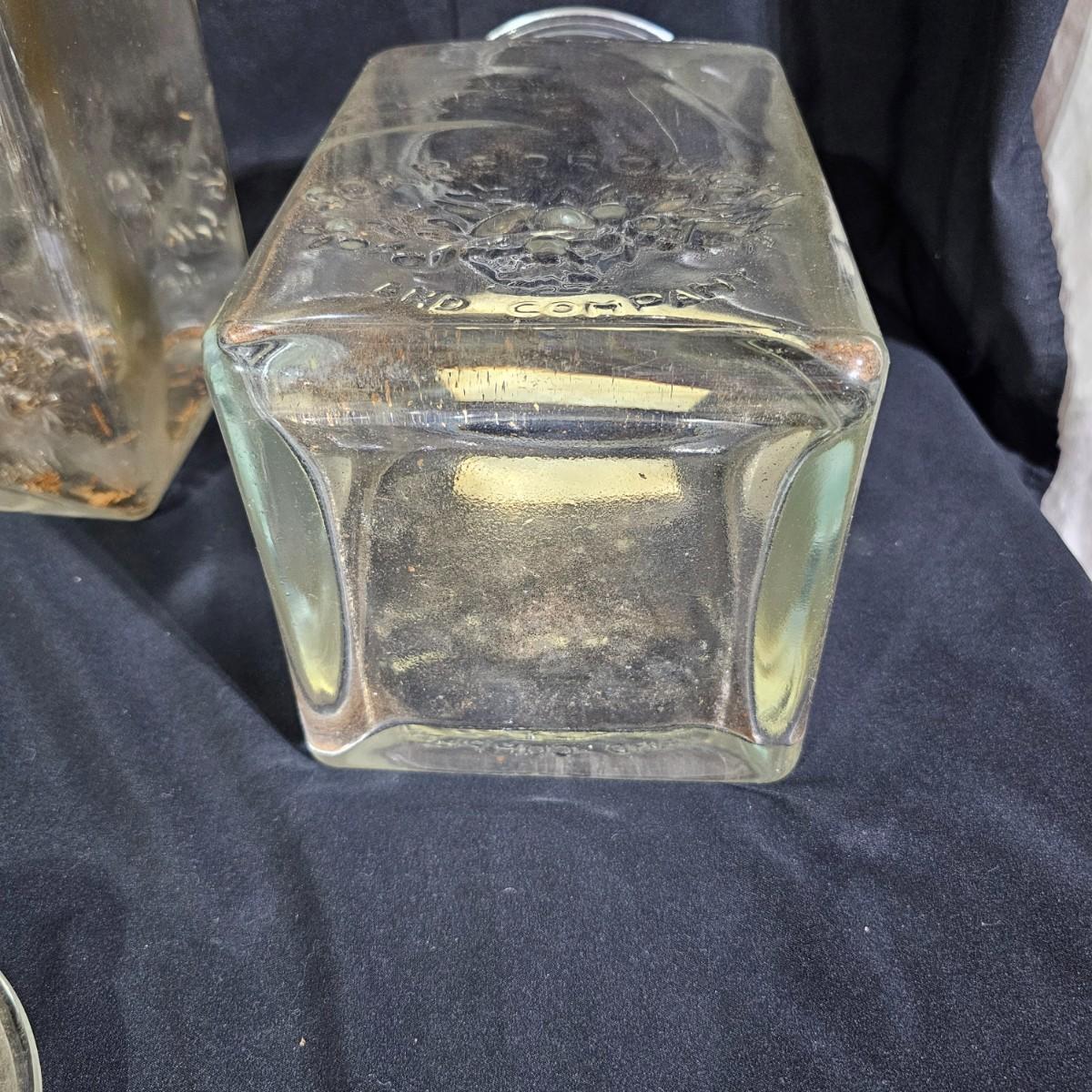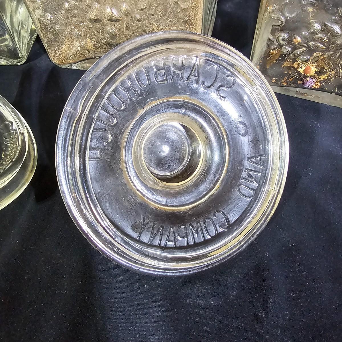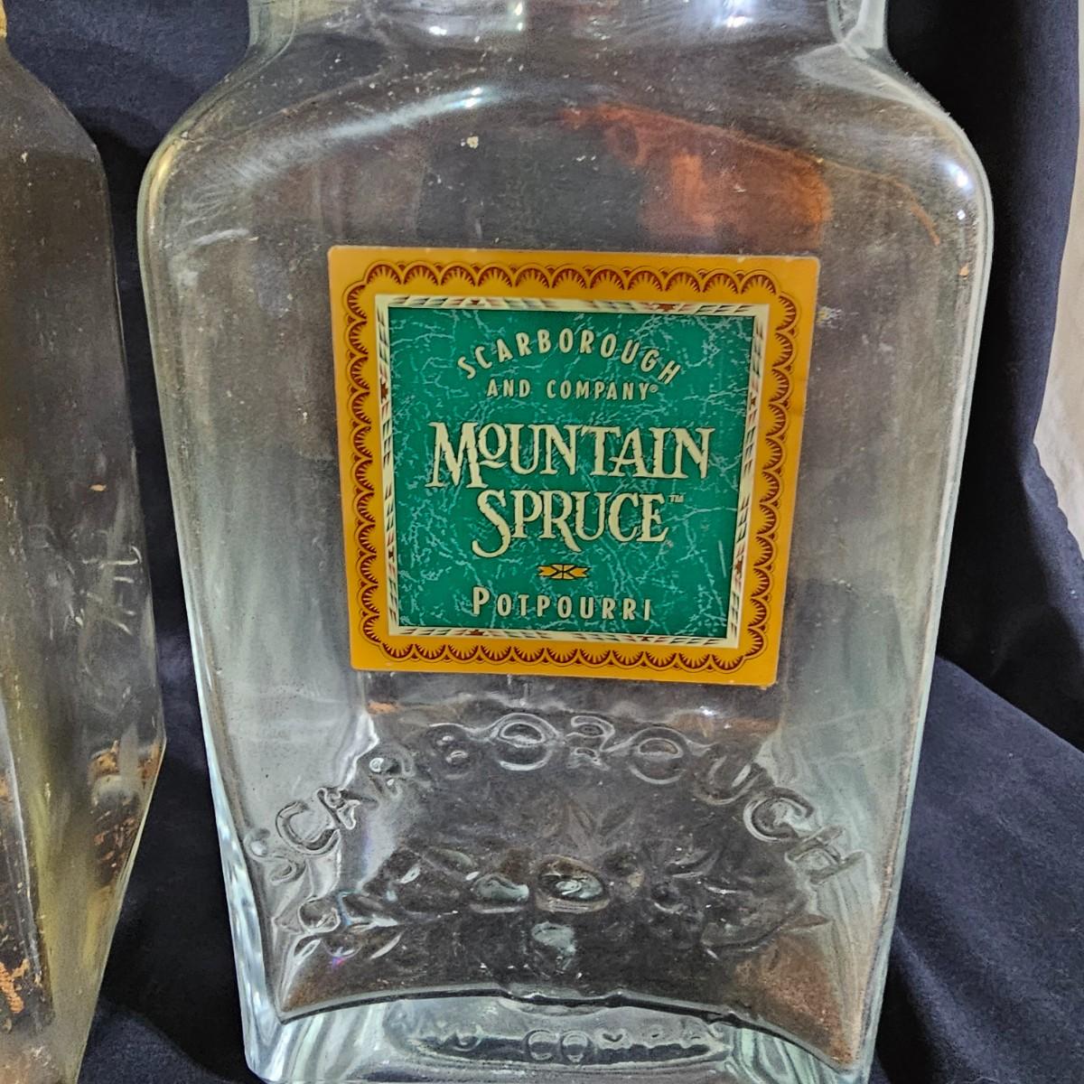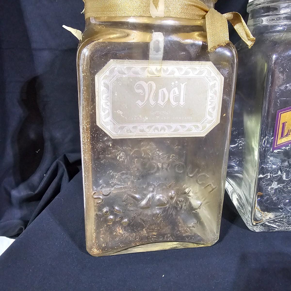 Five large apothecary jars from Scarborough & Company, appear to have held potpourri and other fragrant items. Jars have pressed logo of Company in the glass and on the lids. Jars measure 6.5"SQ x 13.5"H. Also includes two extra lids. See photos for details. Shipping available.