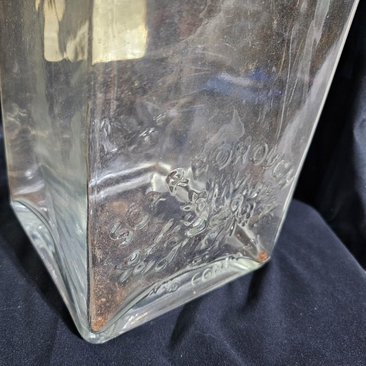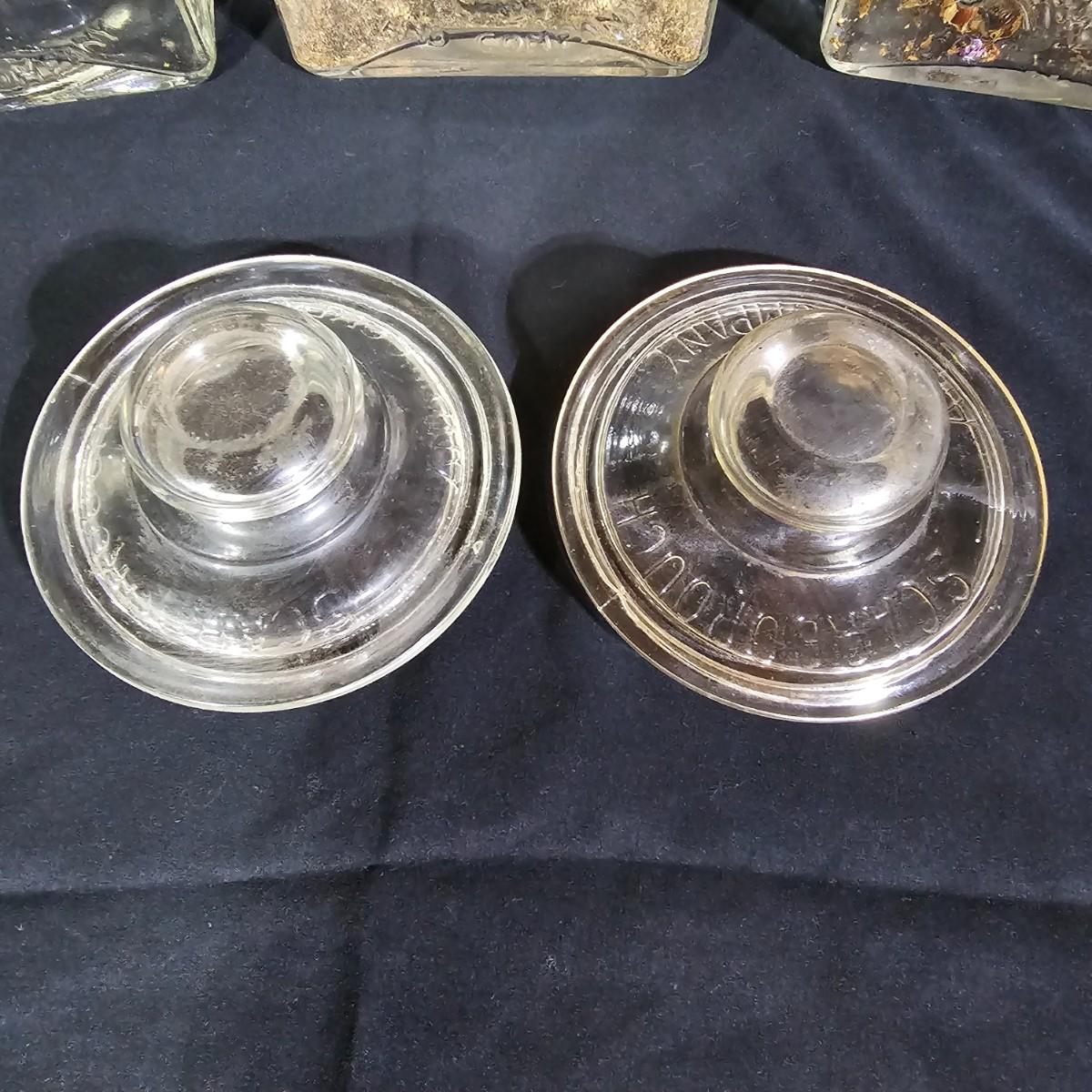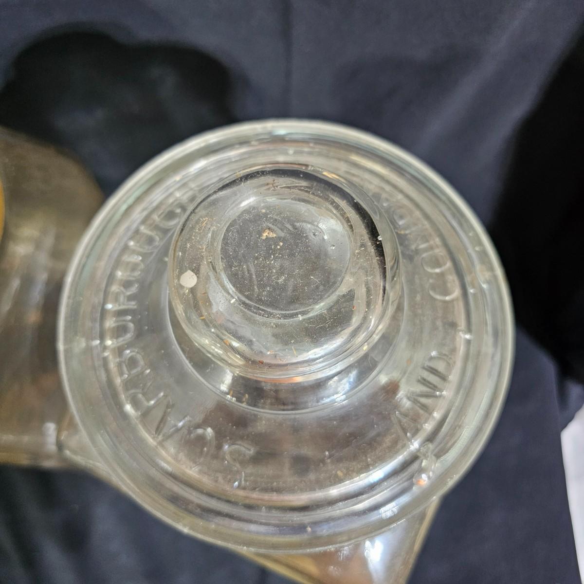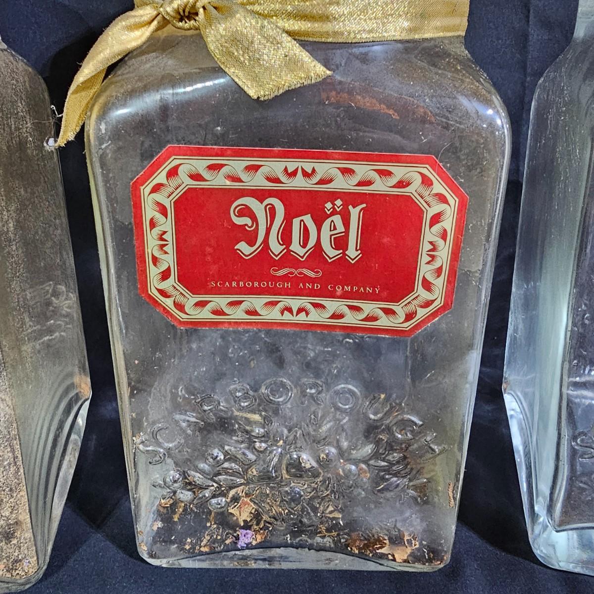 Five large apothecary jars from Scarborough & Company, appear to have held potpourri and other fragrant items. Jars have pressed logo of Company in the glass and on the lids. Jars measure 6.5"SQ x 13.5"H. Also includes two extra lids. See photos for details. Shipping available.