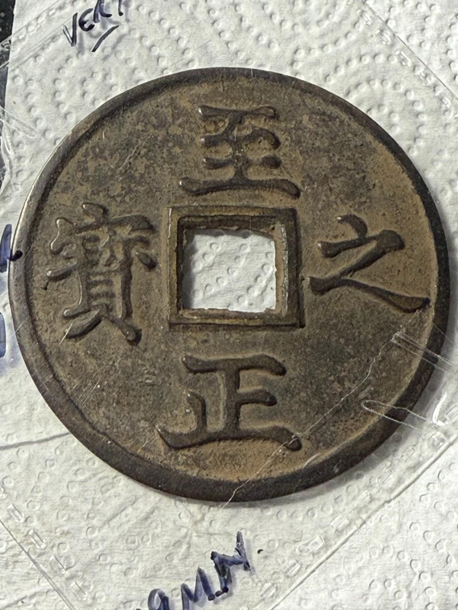 SCARCE ANCIENT YUAN DYNASTY (TOGHON TEMUR 1333-1368) QIAN FROM 1350 MOTHER COIN 2-3/4" IN DIAM. IN VG PREOWNED CONDITION.