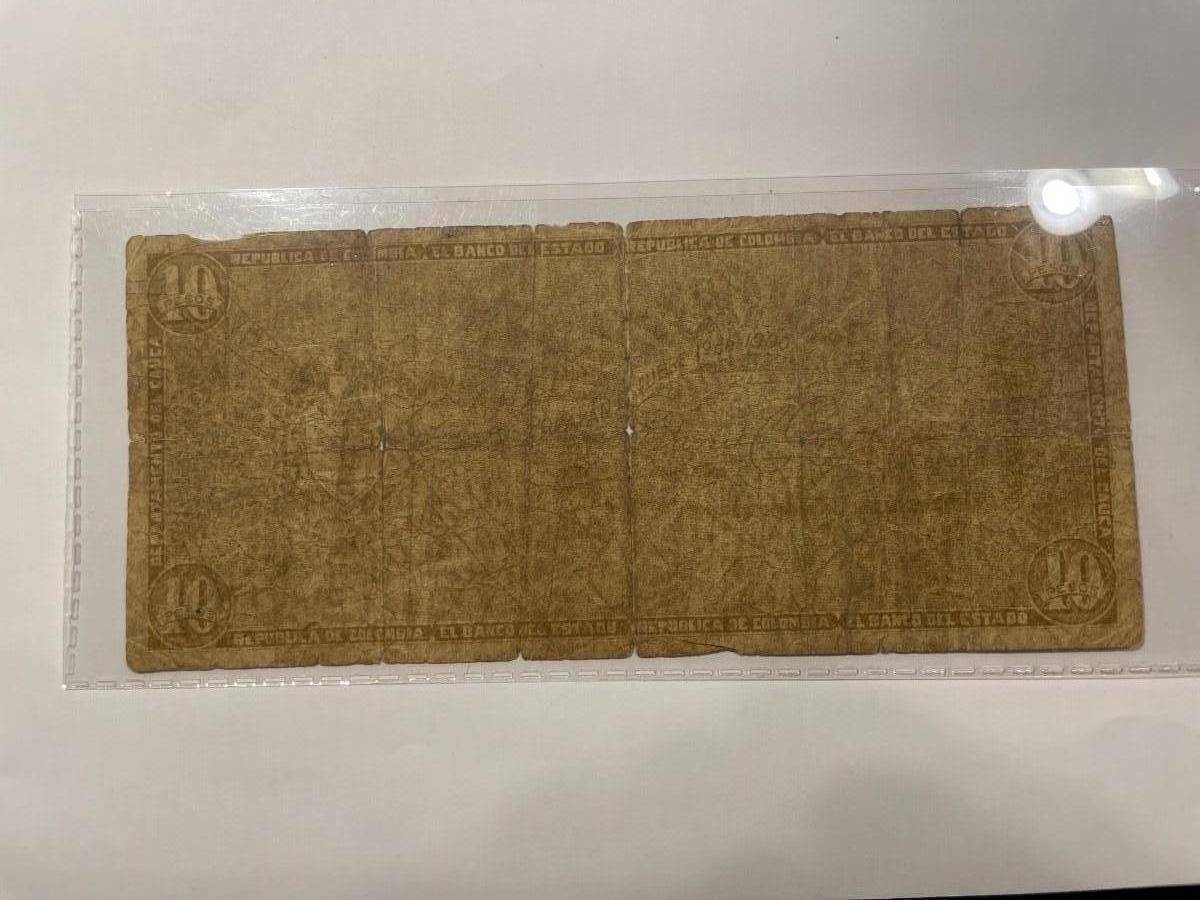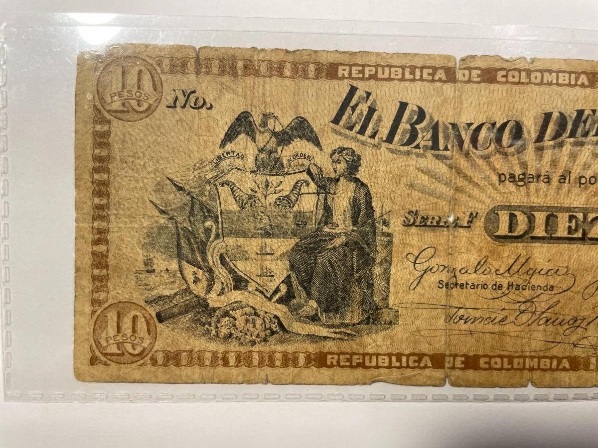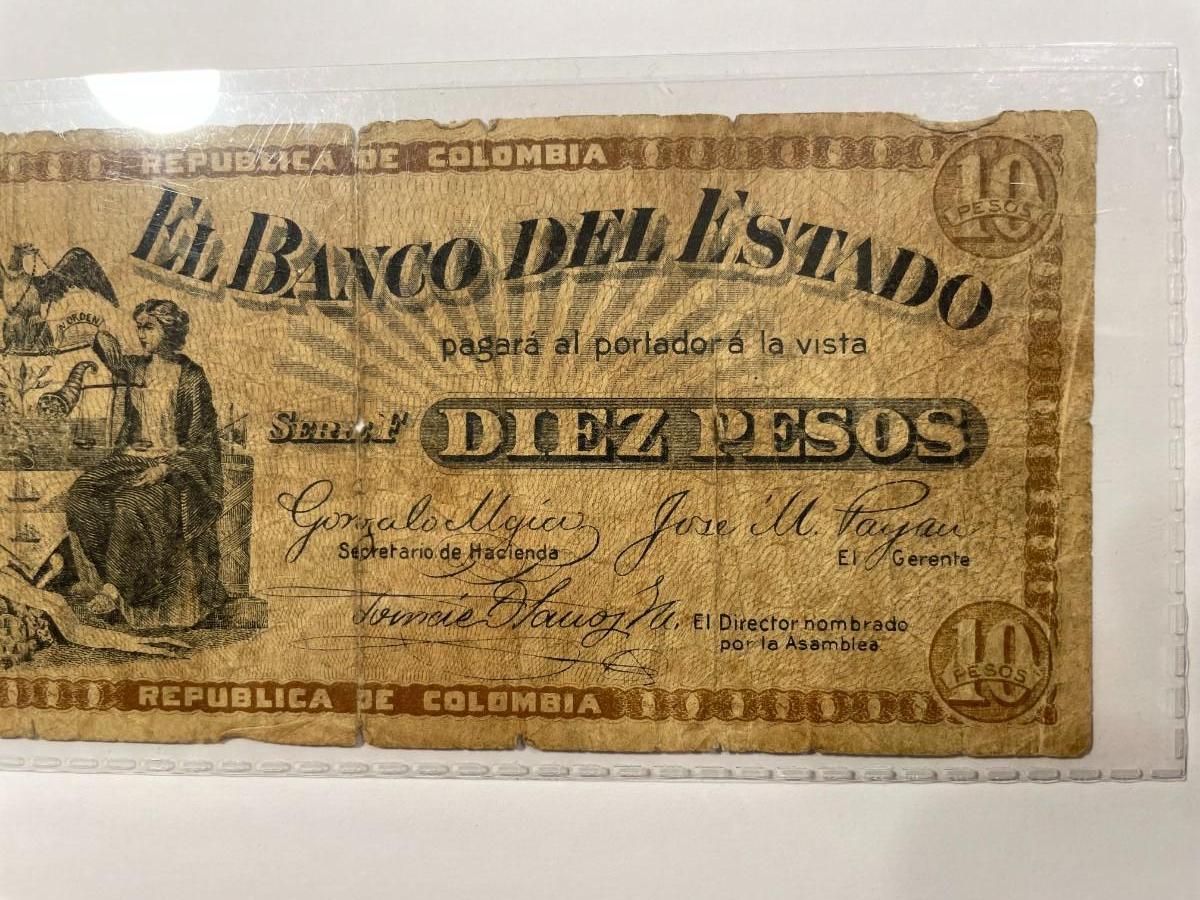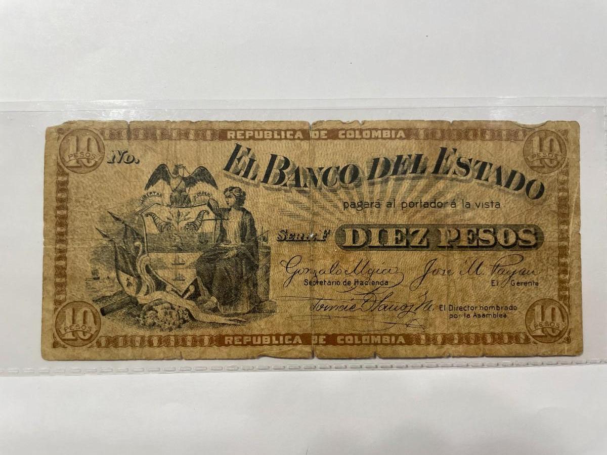 SCARCE COLOMBIA BANCO DEL ESTADO 10 PESOS c1900 BANKNOTE/CURRENCY IN HEAVY CIRCULATED CONDITION AS PIC'D. FREE DOMESTIC SHIPPING.