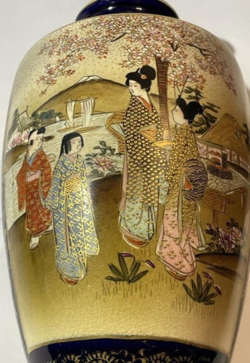 Scarce Japanese Cobalt-Ground Meiji Period (1868-1912) Satsuma Signed Base Vase w/2 Panels 7" Tall in VG Preowned Condition. $15 Domestic Inhouse Shipping.