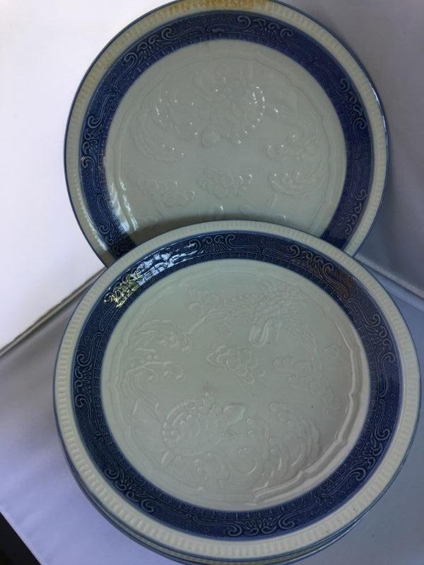 Scarce Lot of 4 Chinese Plates in Relief Blue and White Birds Turtles
