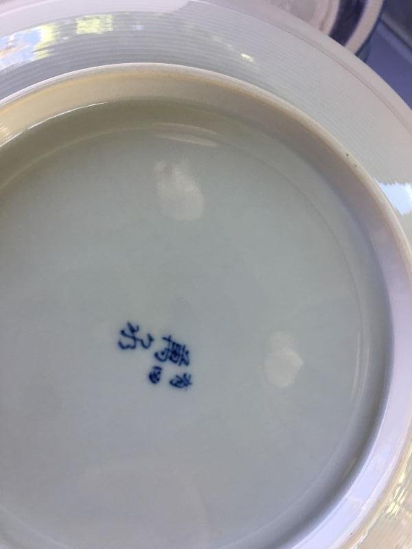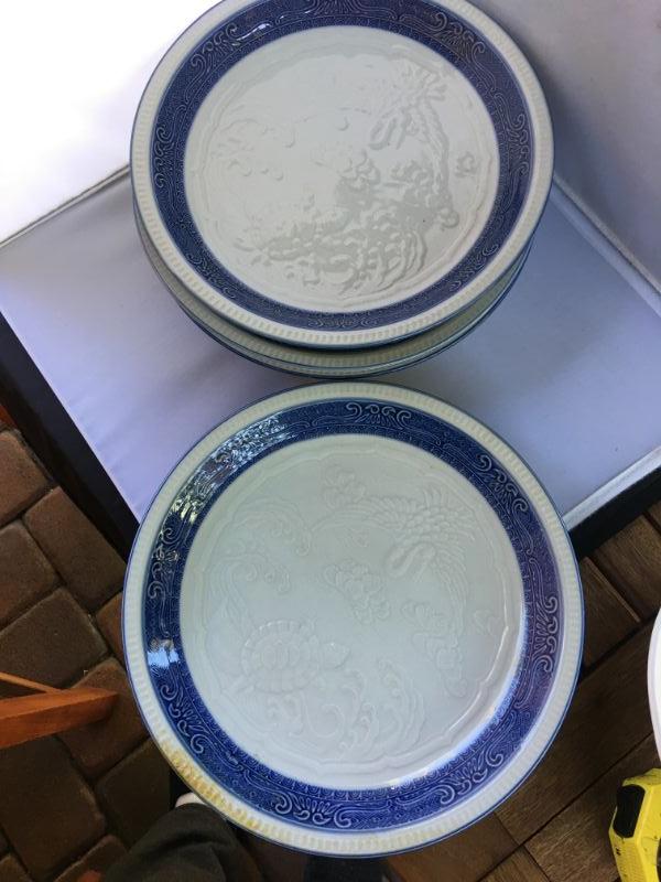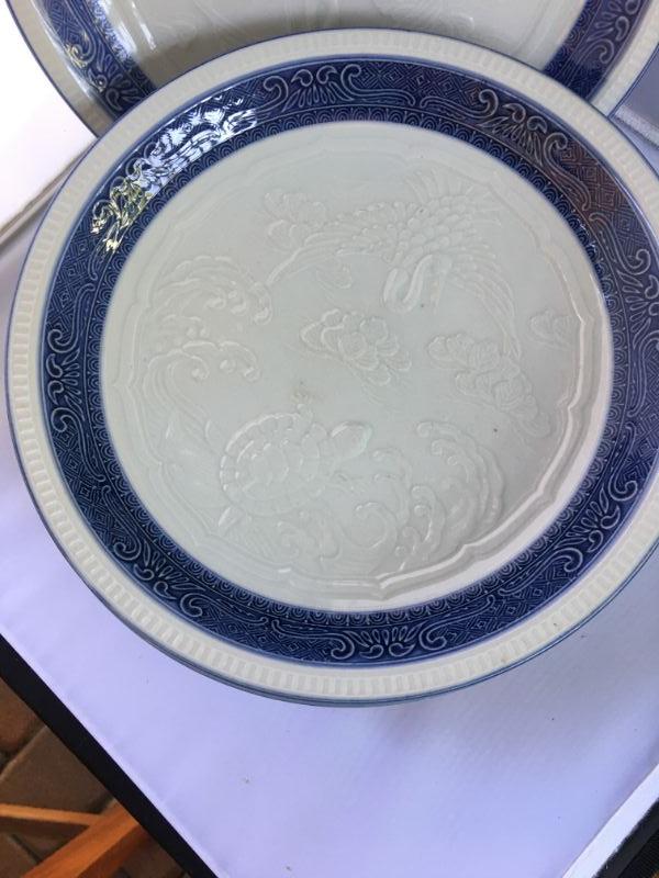 In as new conditions, set of 4 plates made in China, blue and white with in relief stork, turtles and more.