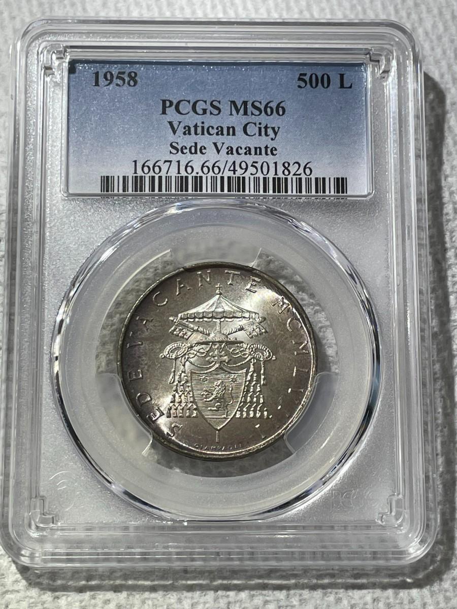 Scarce PCGS Certified VATICAN CITY 1958 MS66 Sede Vacante 500 Lire Silver Commemorative Coin. $5 DOMESTIC SHIPPING.