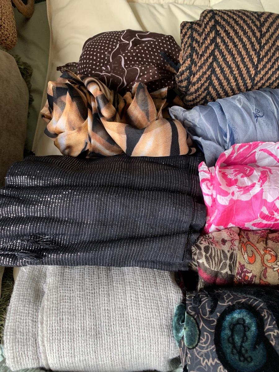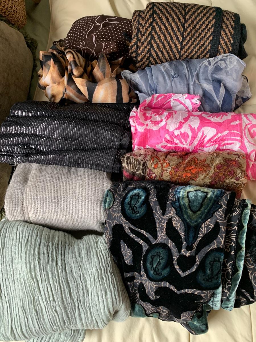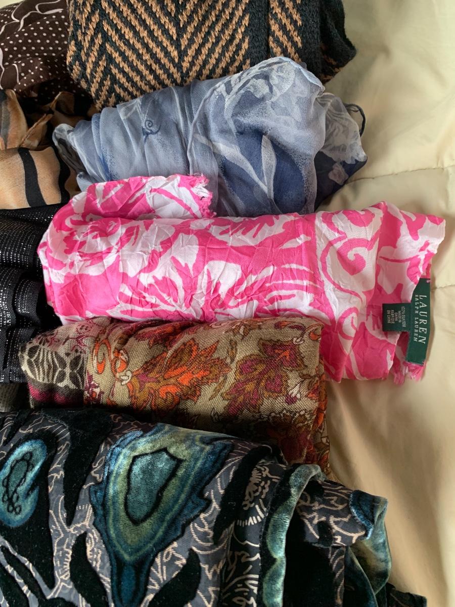 10 scarves, some J Jill, Lauren. Metallic thread, velvet cut out, knit and sheer