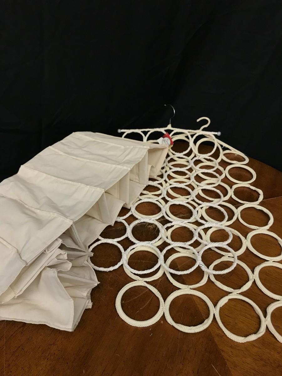 closet organizers: scarf holders, hanging cloth shelves;