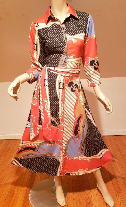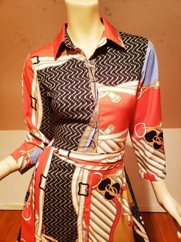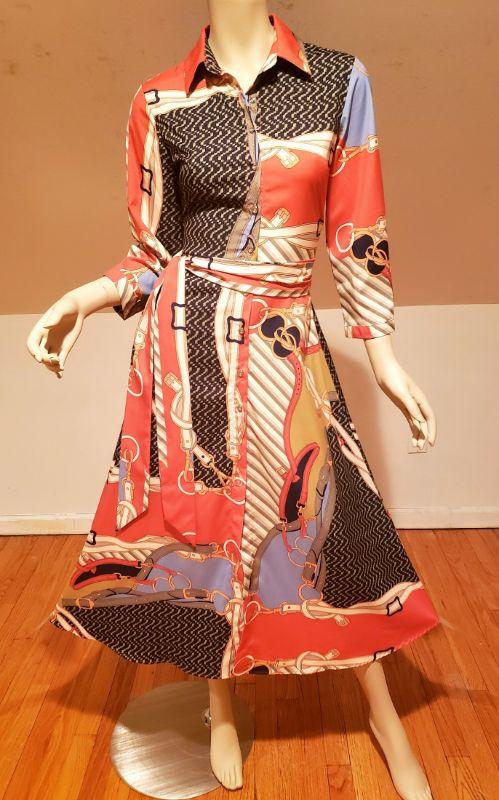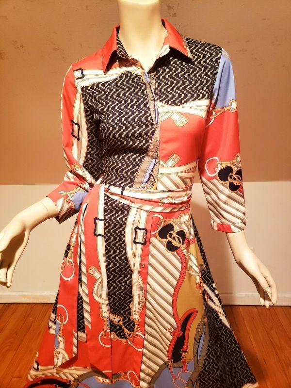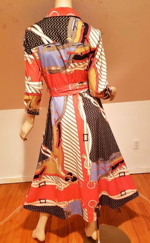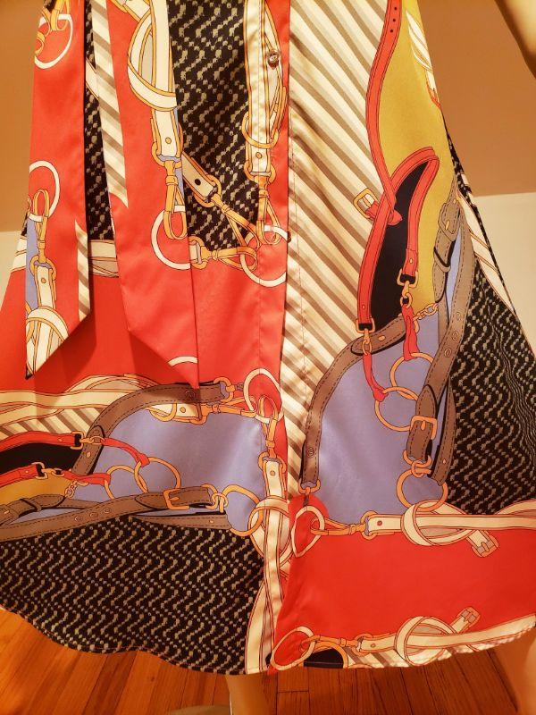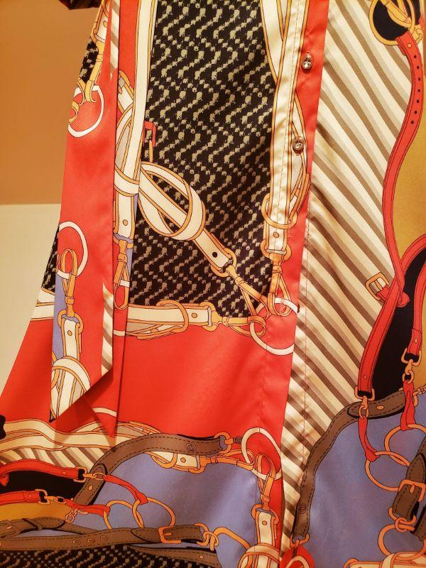 Scarf printed in Gucci Fashion or Hermes print. Tie sash waist with small button front