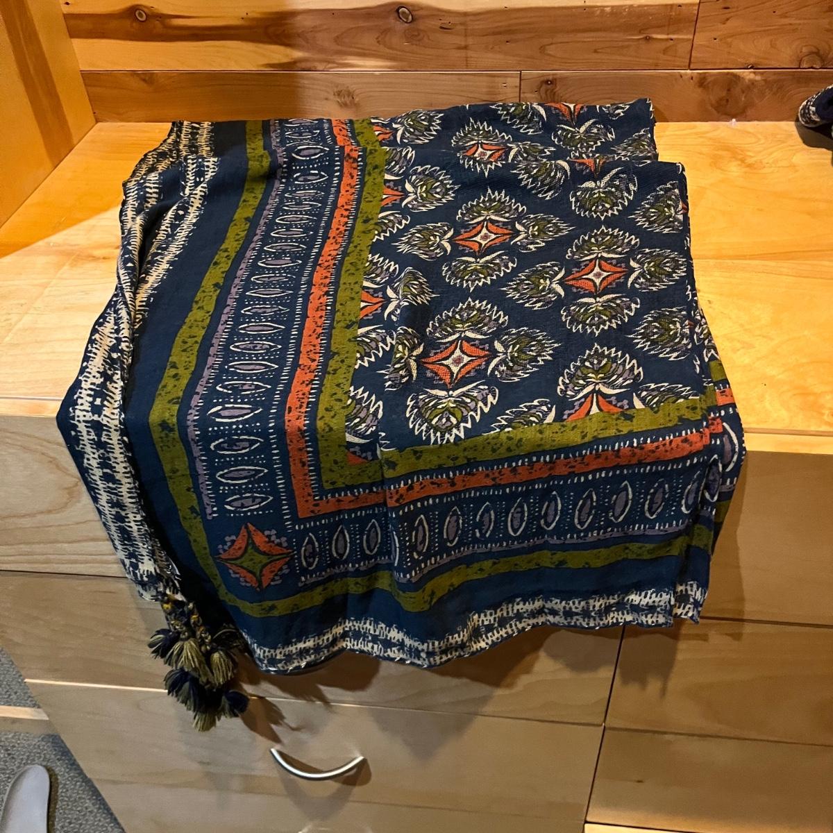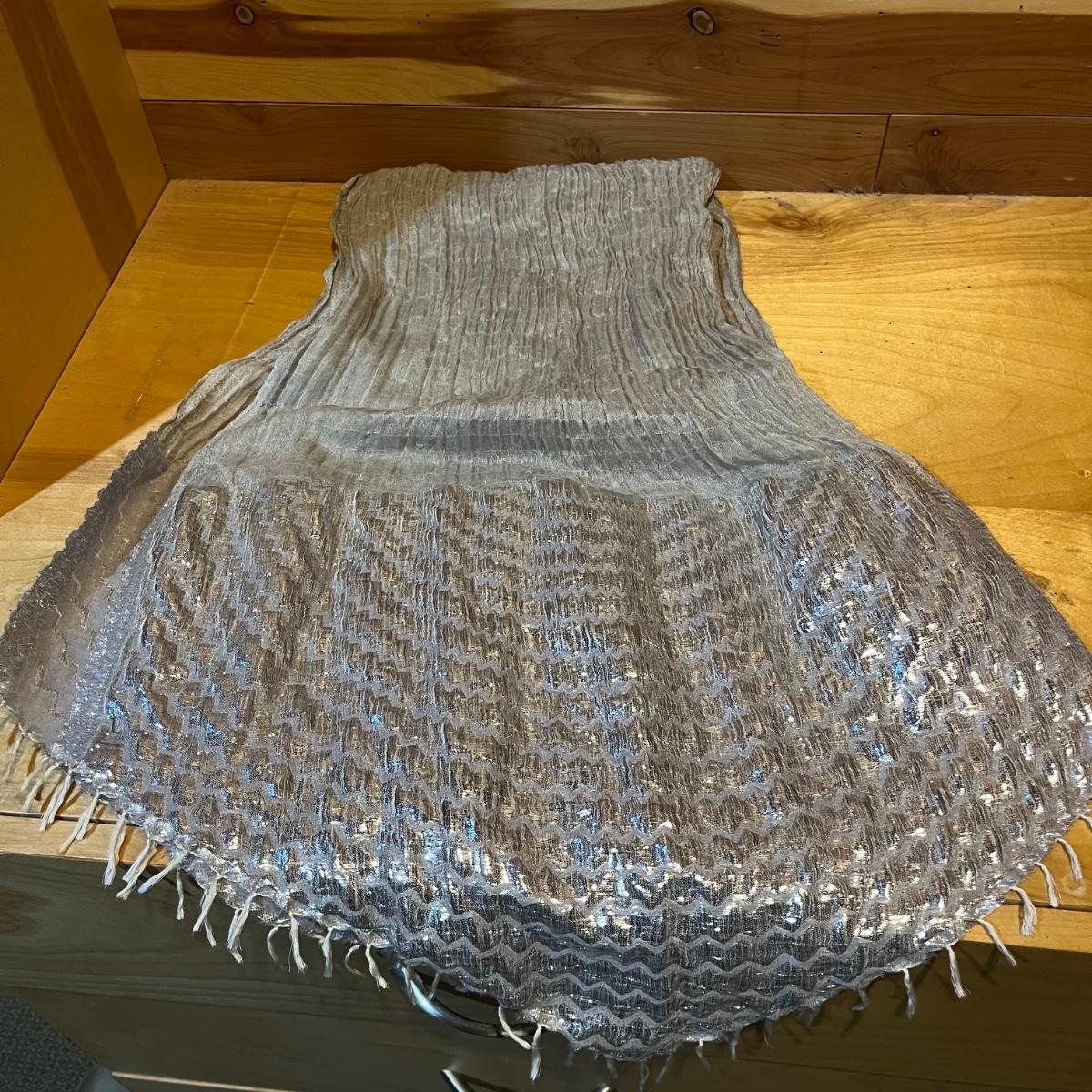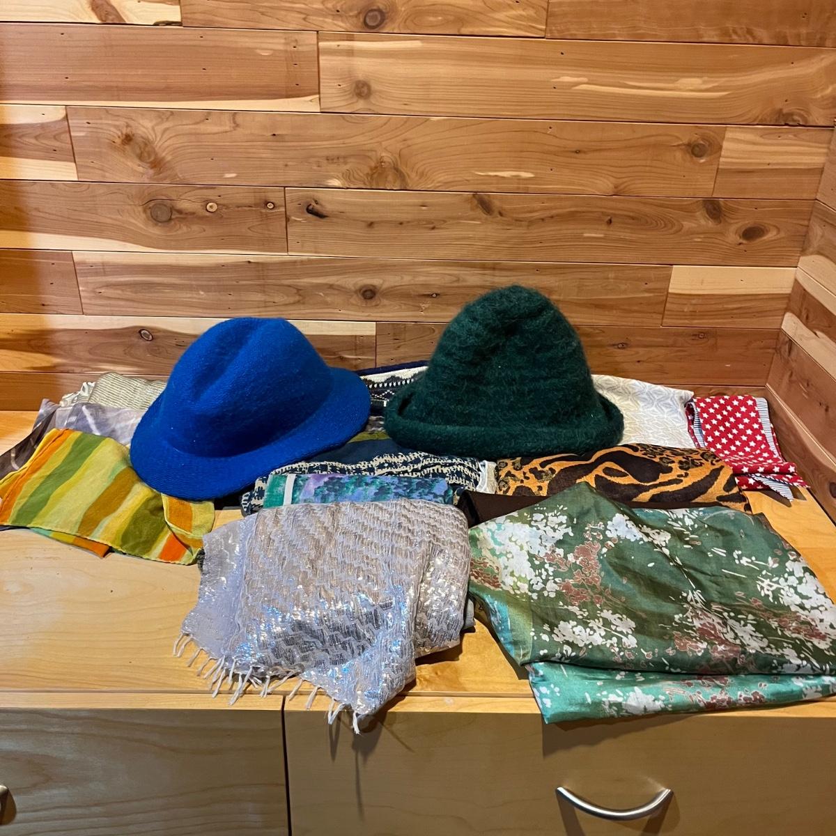 Lot includes two ladies hats and an assortment of scarves. Scarf brands include Eileen Fisher, Boll and Branch, Banaris, and more. Scarves are made from a variety of materials including wool, cotton, pashmina and silk.