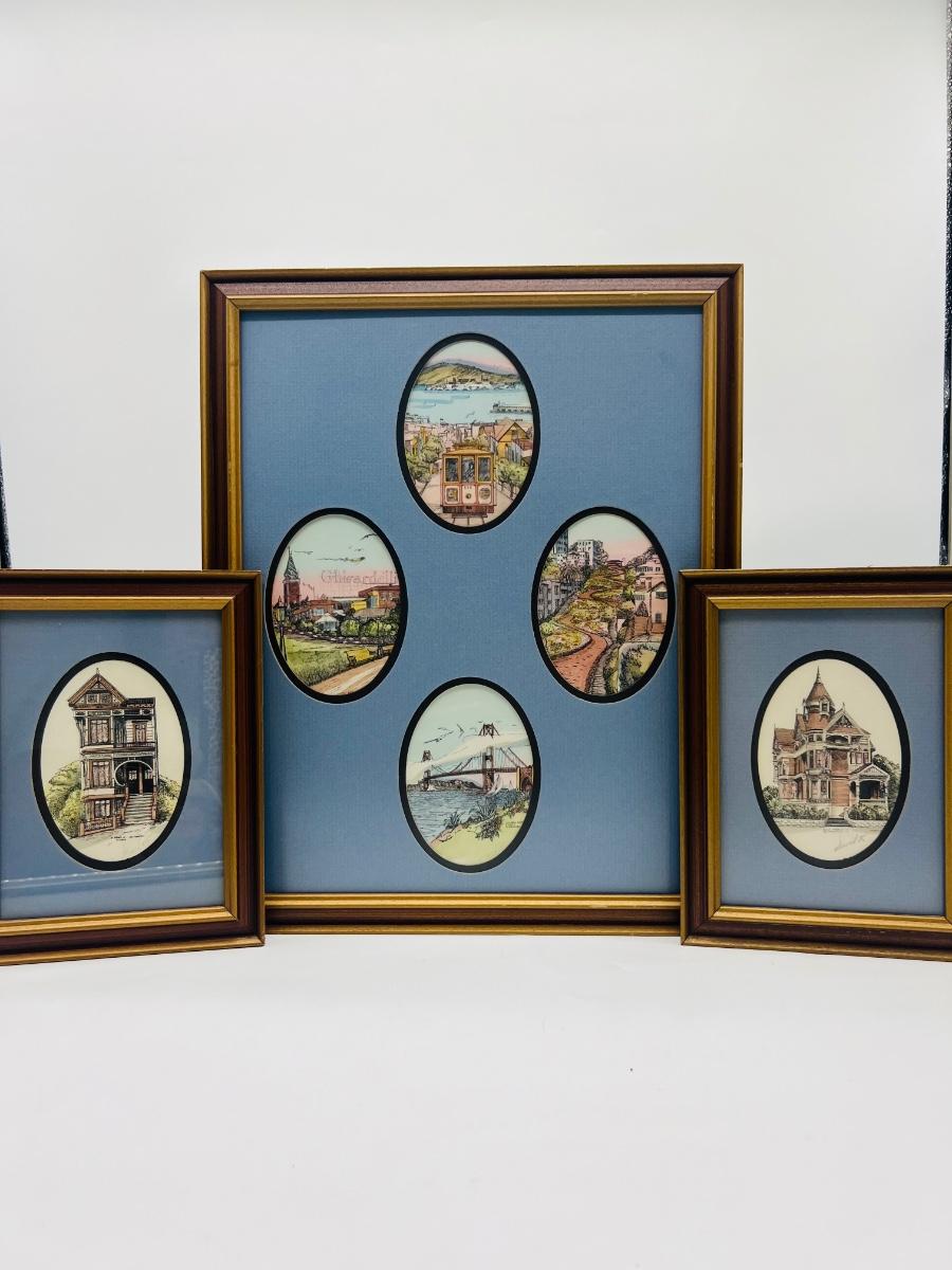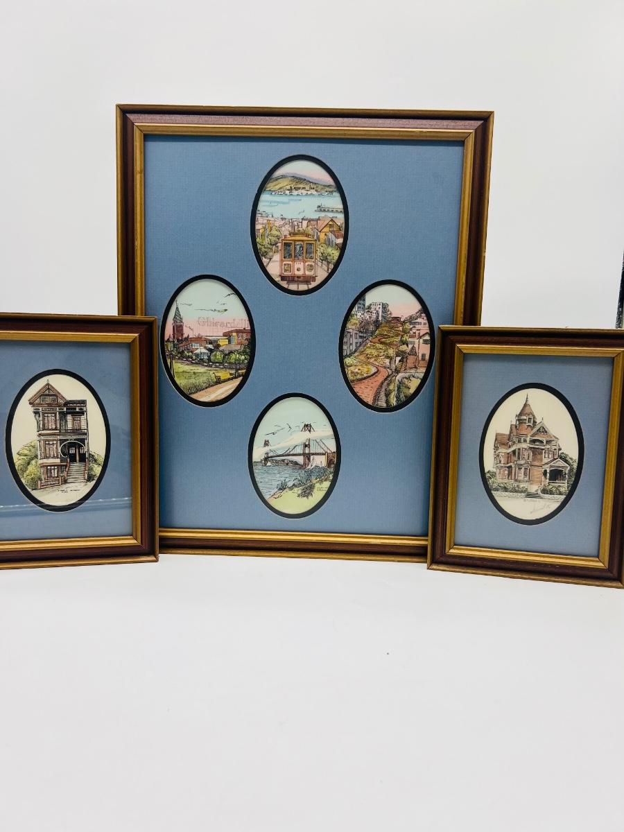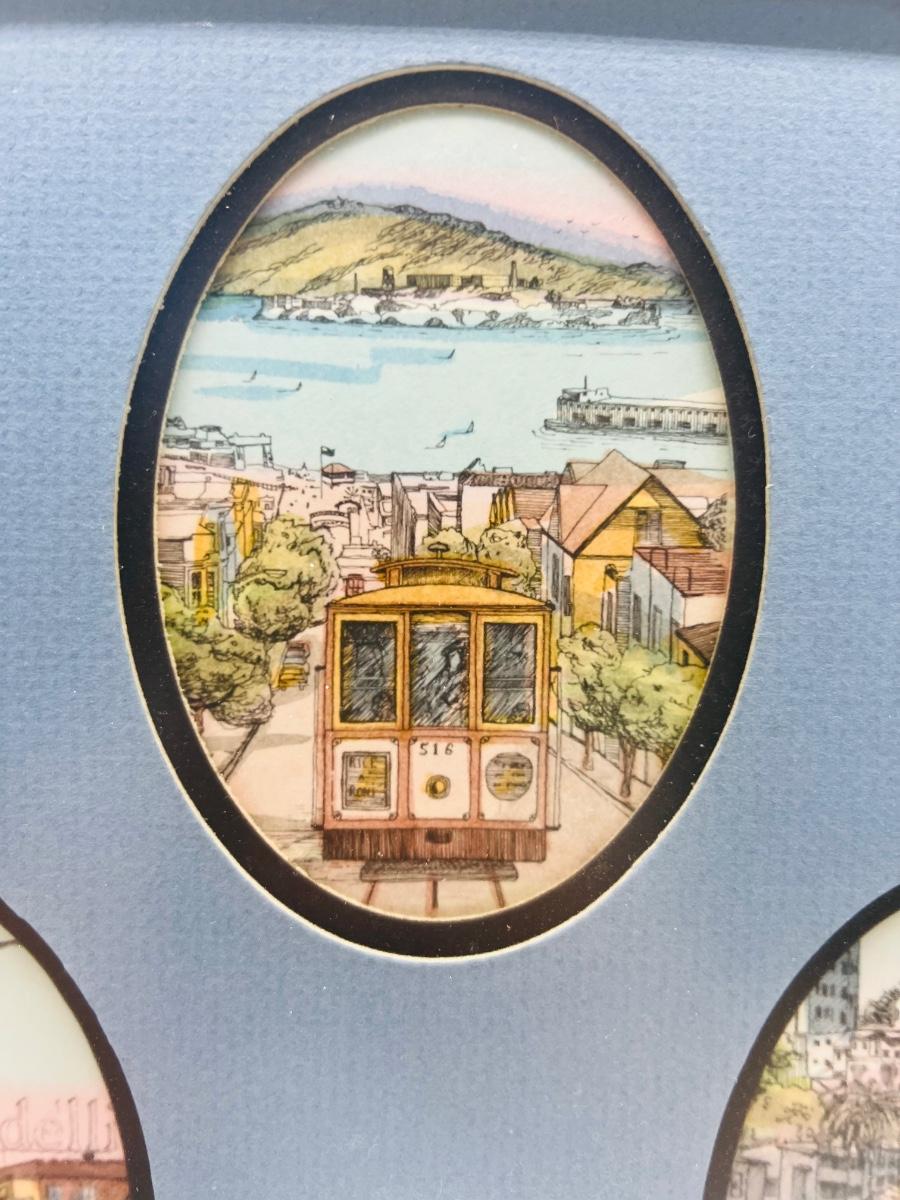 Professionally framed and matted by Changing Times scenes from San Francisco by Eileen David signed 1985 largest measures 13 1/2 inches tall by 12 1/2 inches wide smaller to measure at 8 1/2 tall by 6 1/2 wide