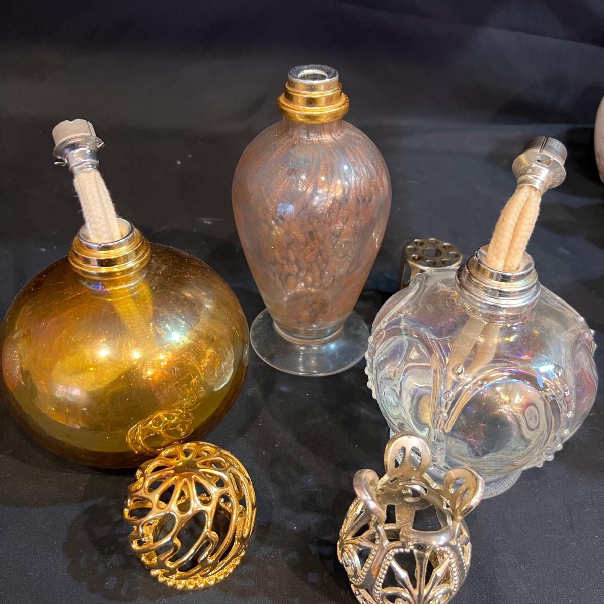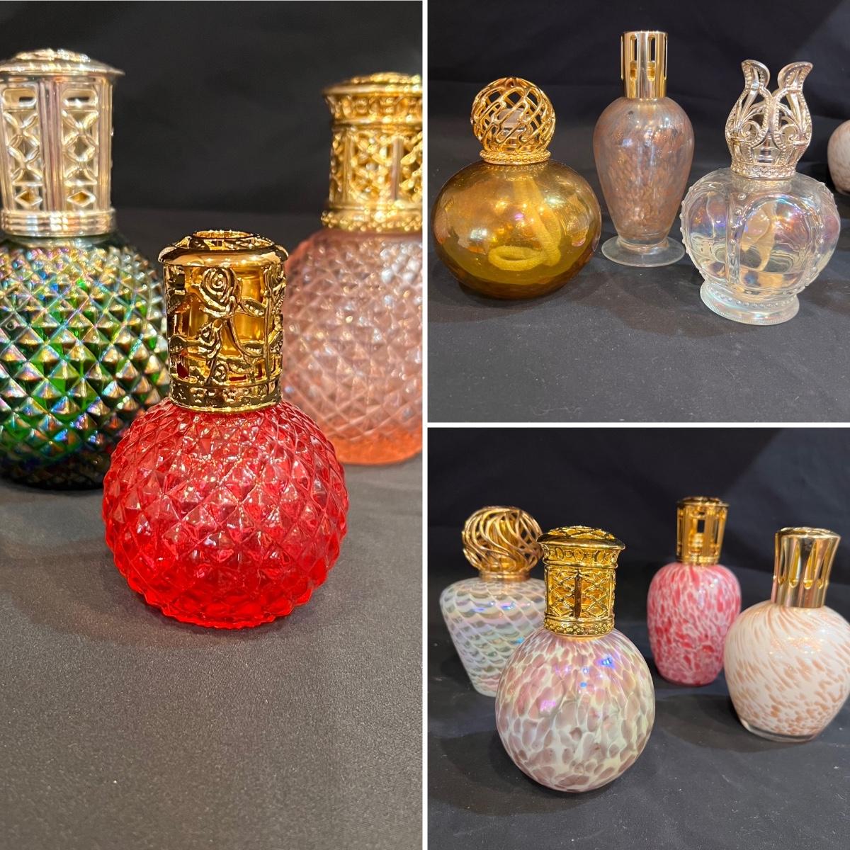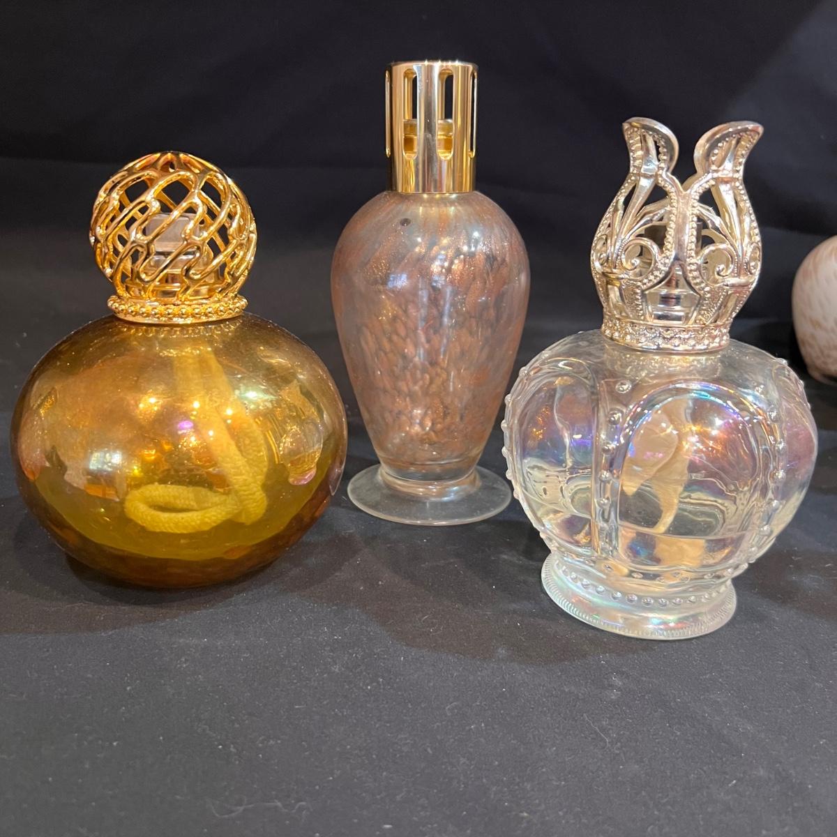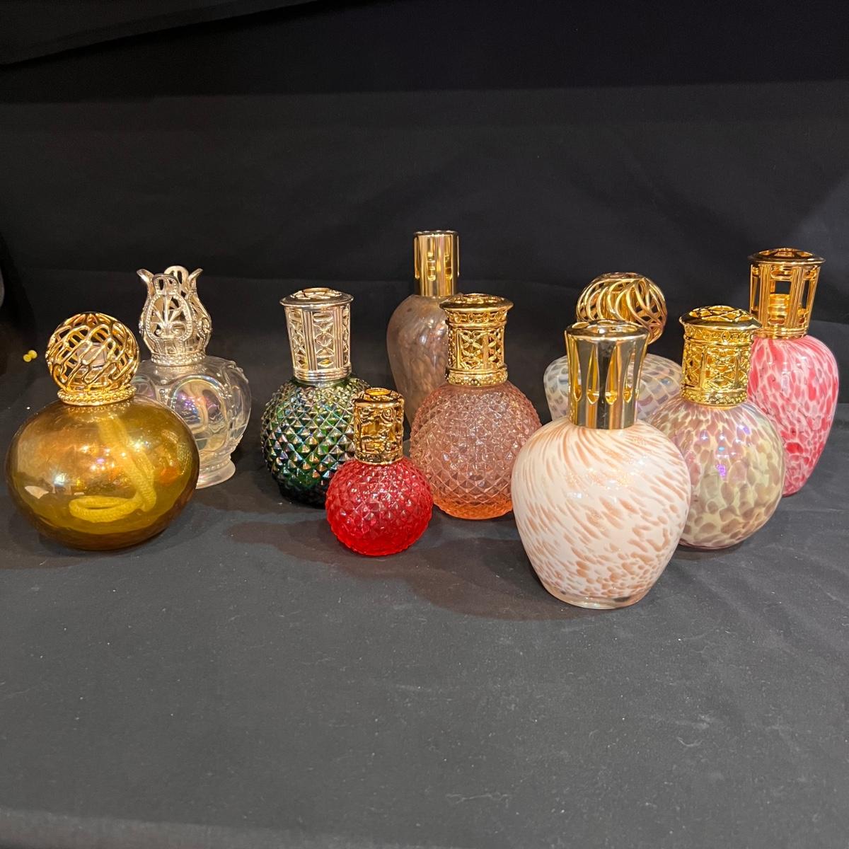 Ten glass fragrance lamps altogether in this pretty lot. See images for any markings found. The three lamps that have a hobnail glass style appear to all be by Scentier but the only marking found on these was on the green one which measures 4”D x 6”H. A few have wicks and please note that the clear glass bottle has a clear unidentified liquid in it.