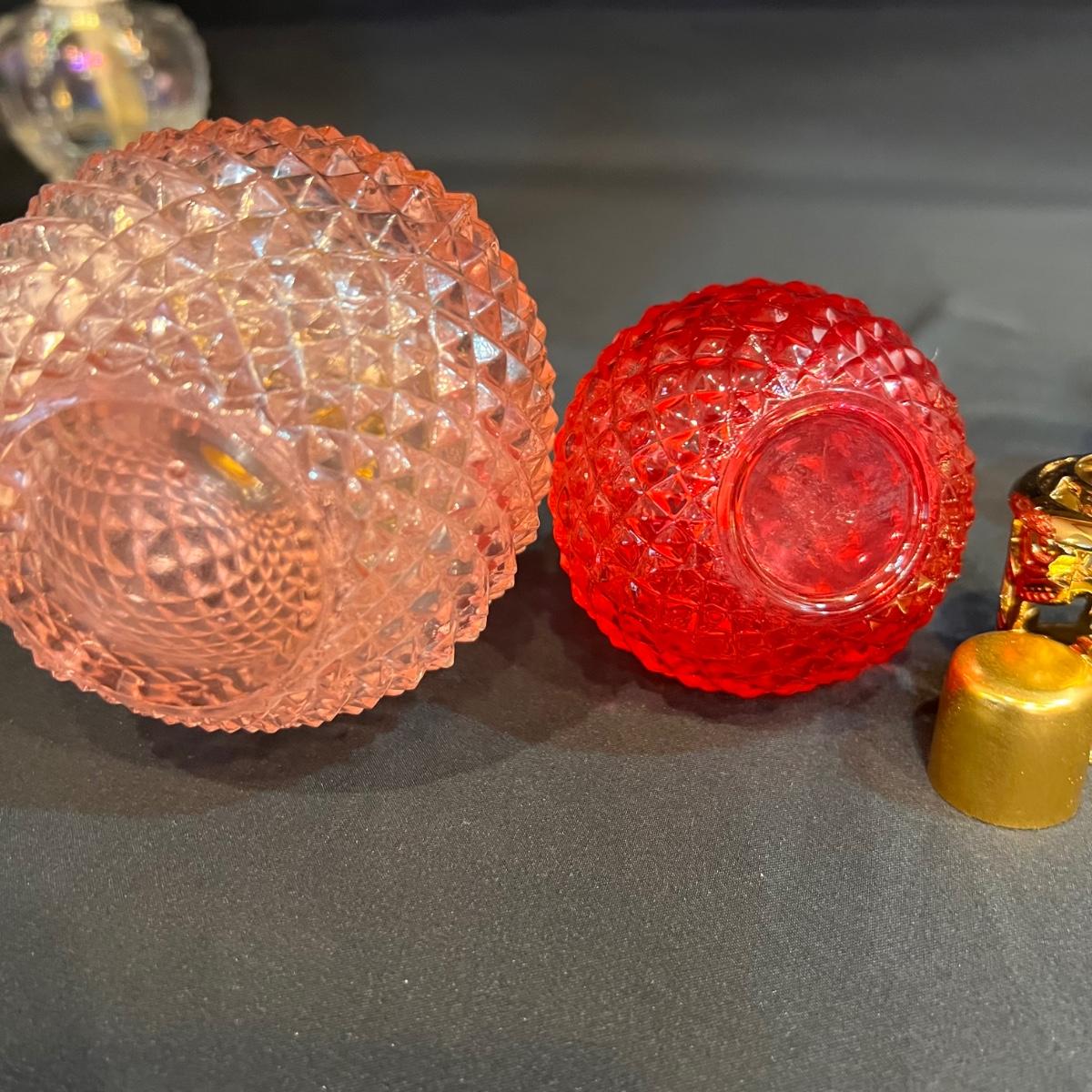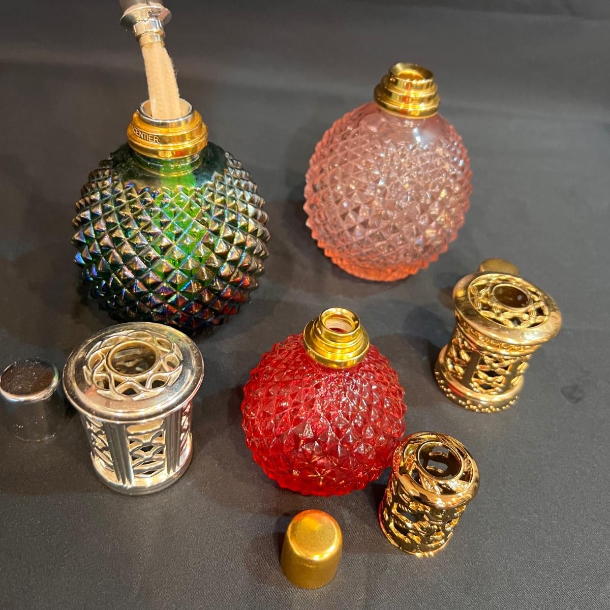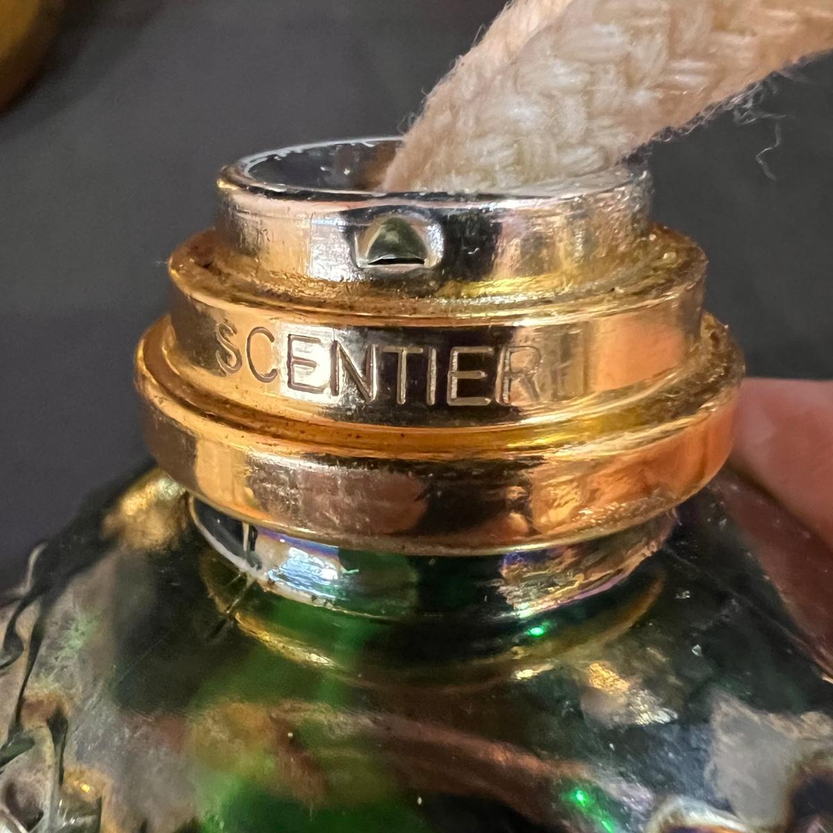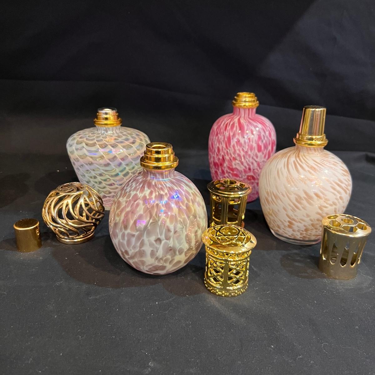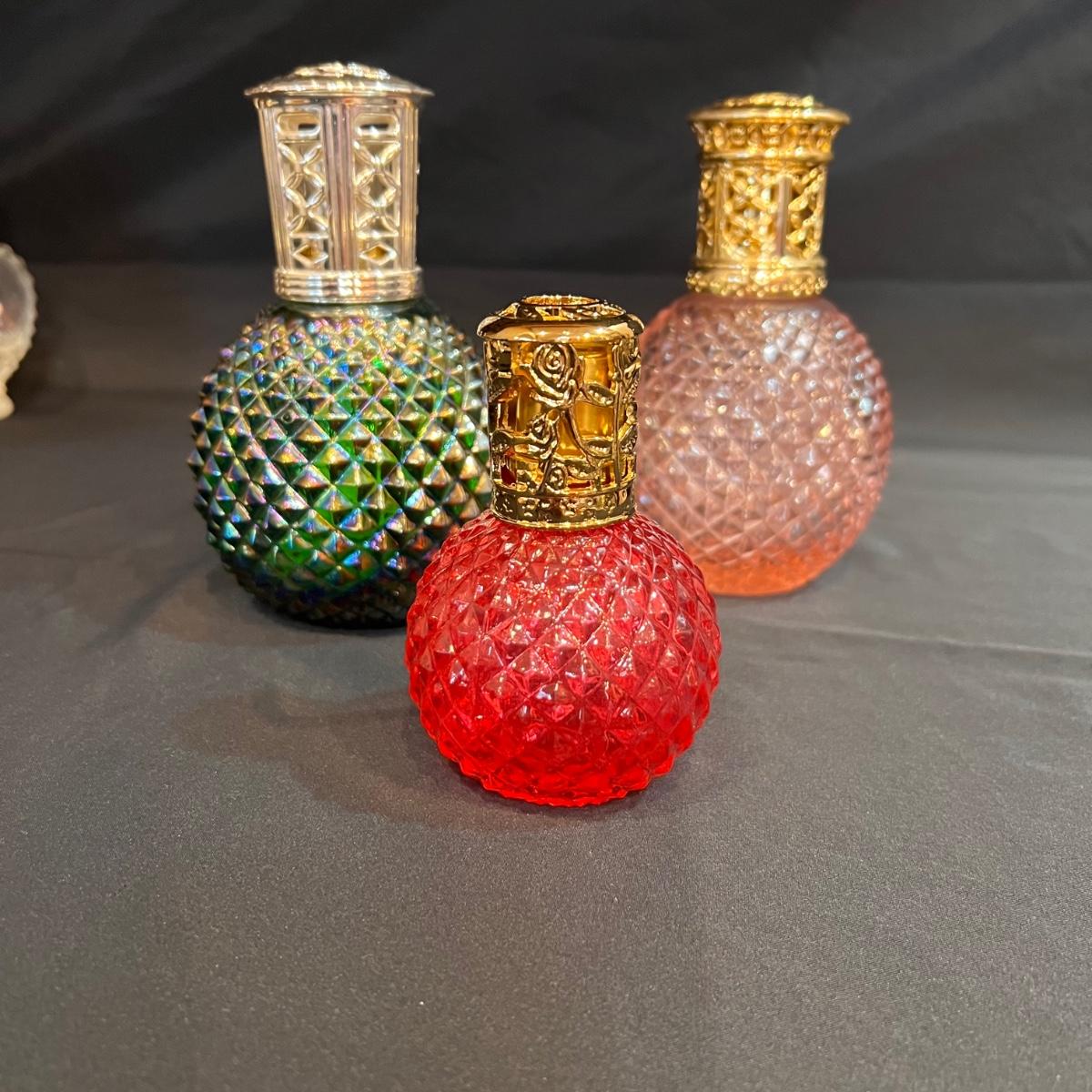 Ten glass fragrance lamps altogether in this pretty lot. See images for any markings found. The three lamps that have a hobnail glass style appear to all be by Scentier but the only marking found on these was on the green one which measures 4”D x 6”H. A few have wicks and please note that the clear glass bottle has a clear unidentified liquid in it.