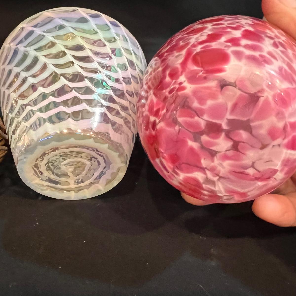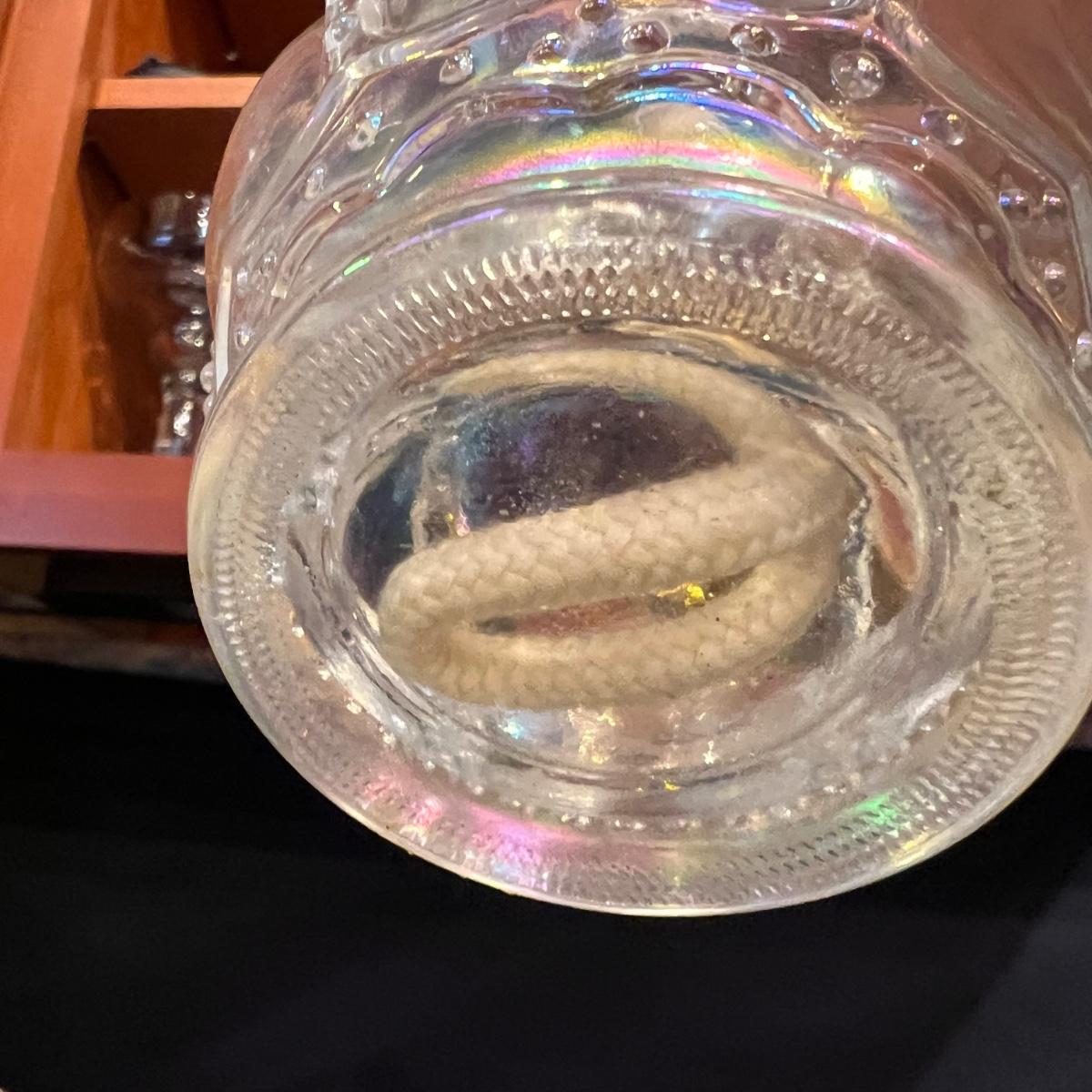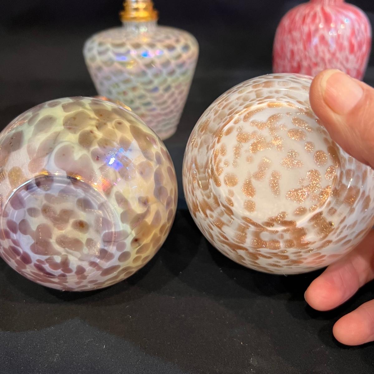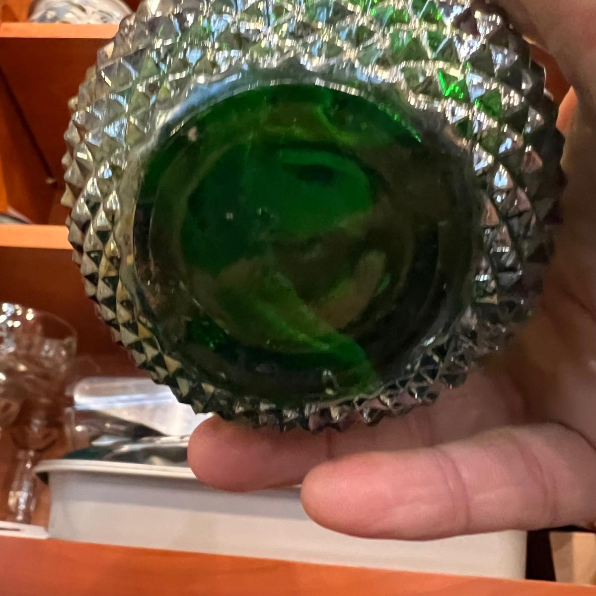Ten glass fragrance lamps altogether in this pretty lot. See images for any markings found. The three lamps that have a hobnail glass style appear to all be by Scentier but the only marking found on these was on the green one which measures 4”D x 6”H. A few have wicks and please note that the clear glass bottle has a clear unidentified liquid in it.