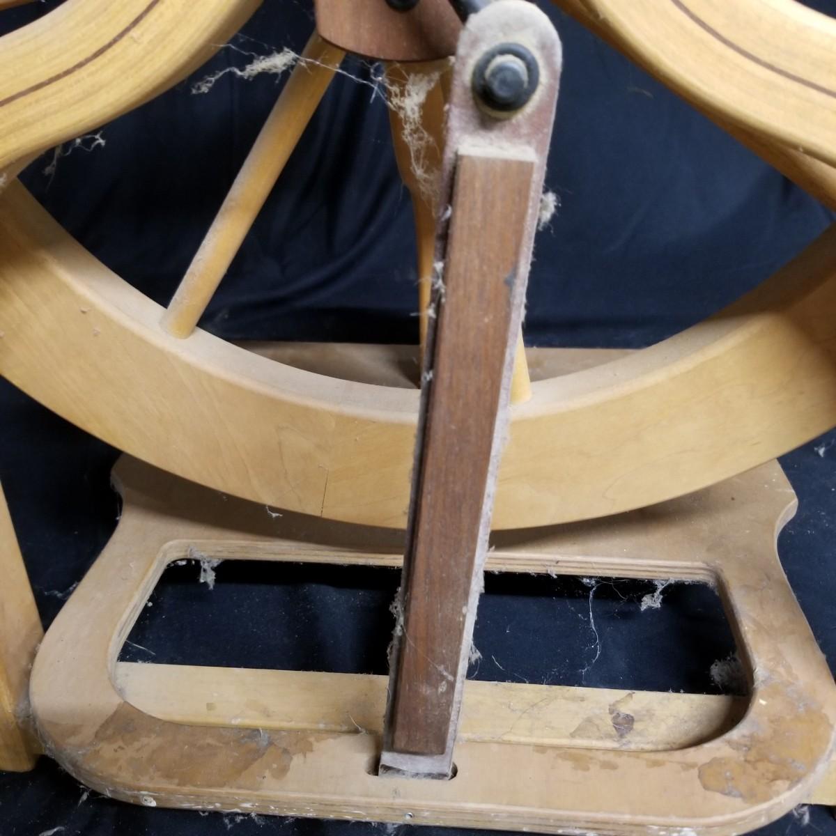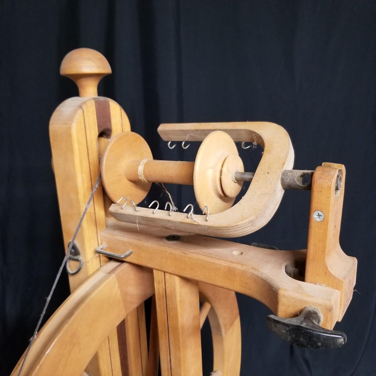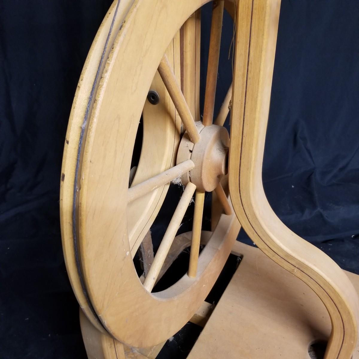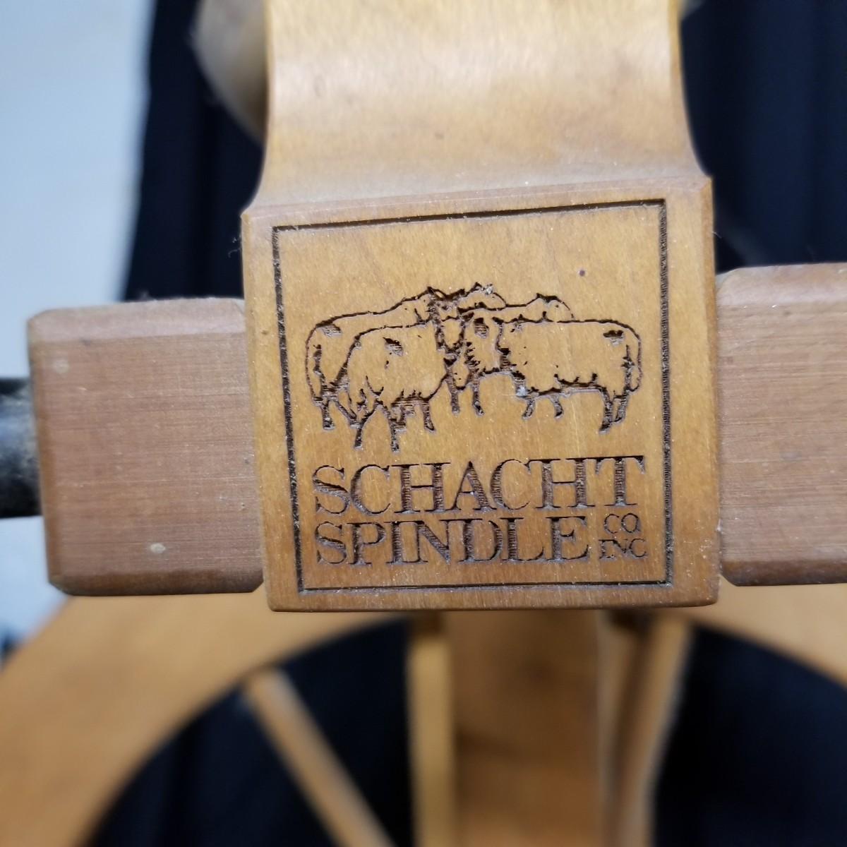 Schacht treadle spinning wheel with four spindle heads. Treadle works smoothly. Wood appears to be maple. Has adjustments for spin tension. Item measures 19.5" x 33" x 17". Wheel is 19.5" d. Local pickup only.