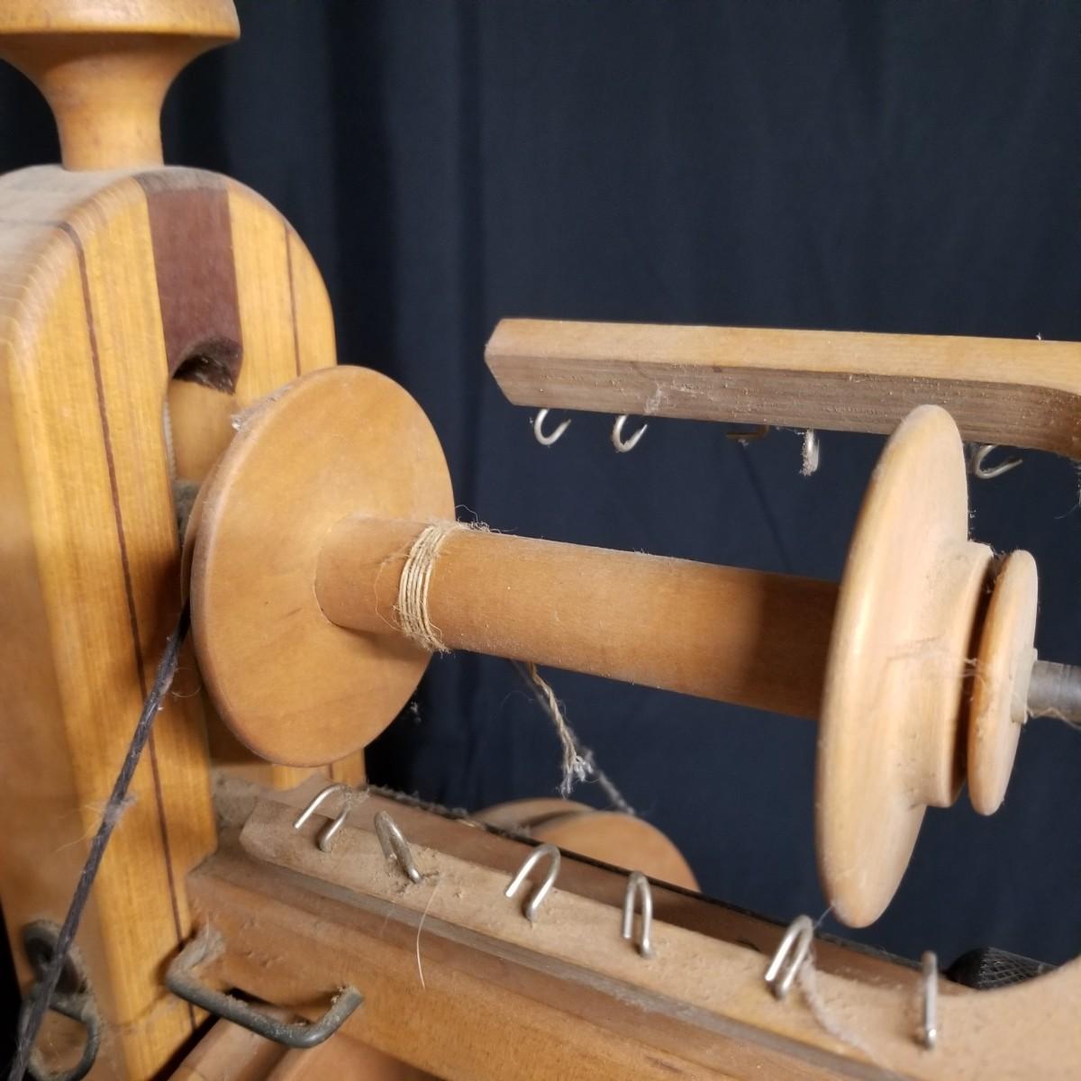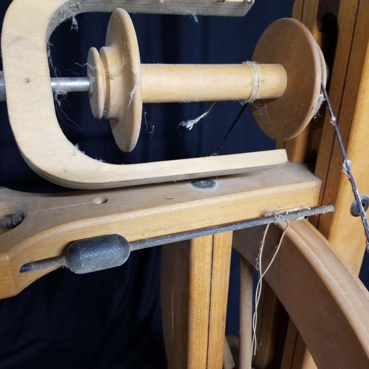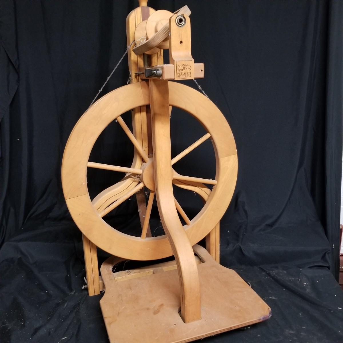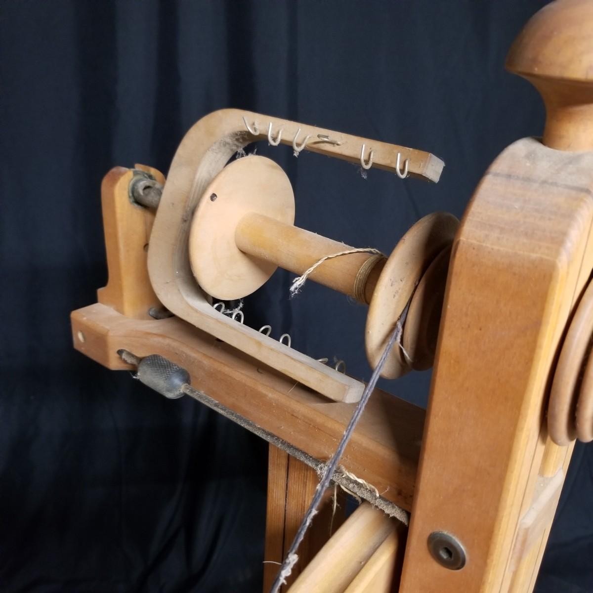 Schacht treadle spinning wheel with four spindle heads. Treadle works smoothly. Wood appears to be maple. Has adjustments for spin tension. Item measures 19.5" x 33" x 17". Wheel is 19.5" d. Local pickup only.