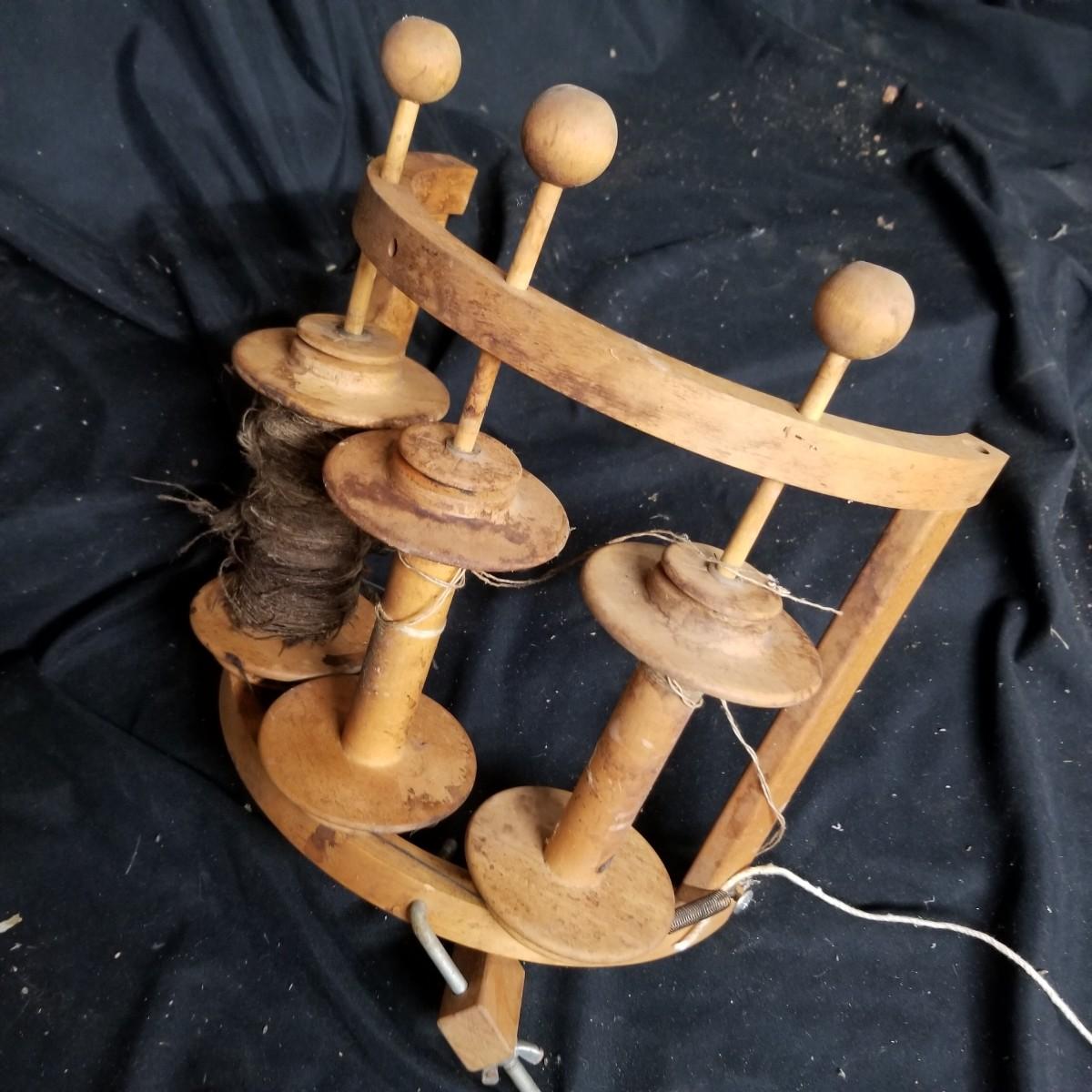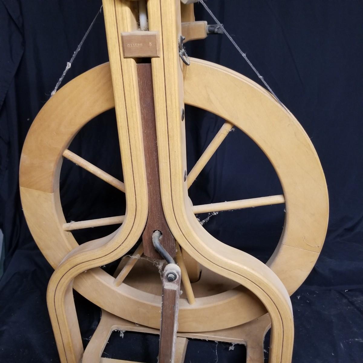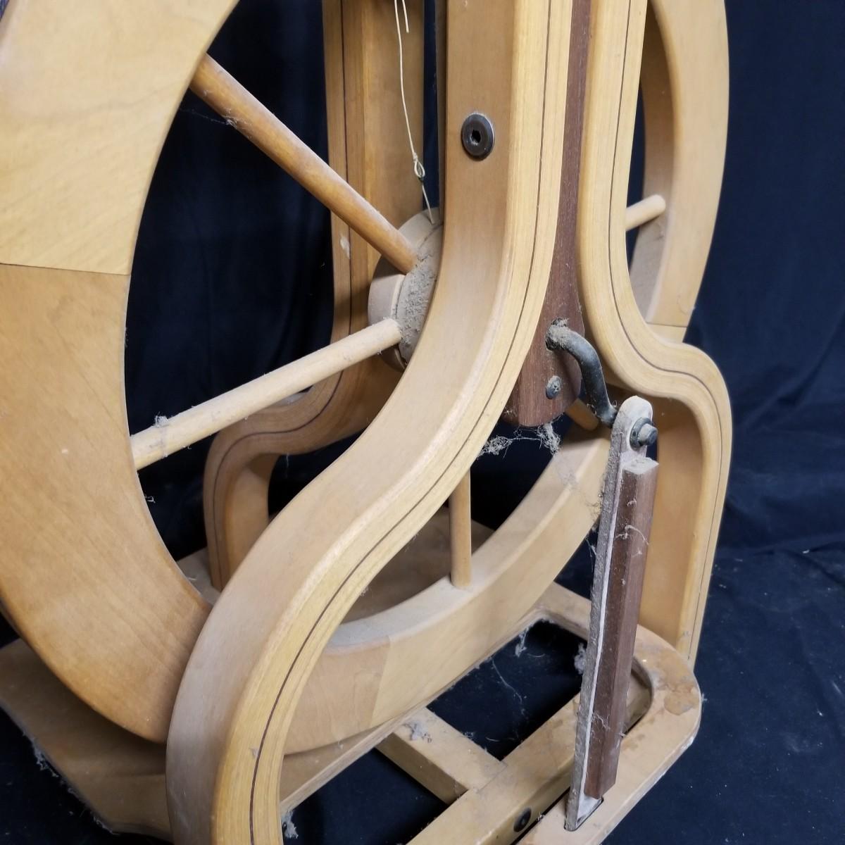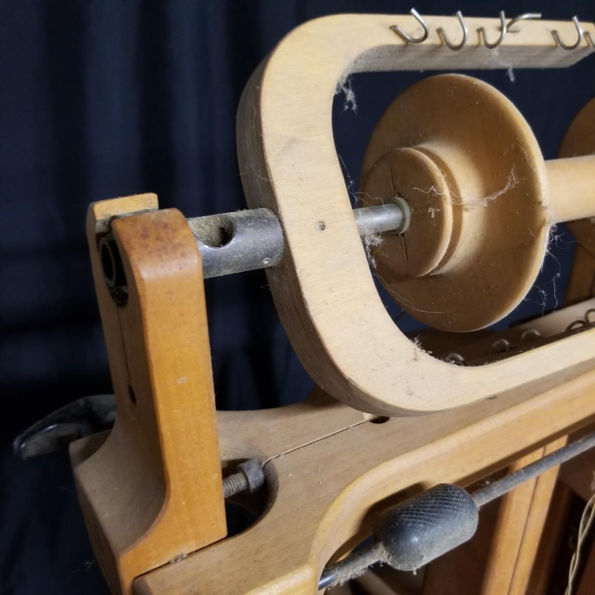 Schacht treadle spinning wheel with four spindle heads. Treadle works smoothly. Wood appears to be maple. Has adjustments for spin tension. Item measures 19.5" x 33" x 17". Wheel is 19.5" d. Local pickup only.