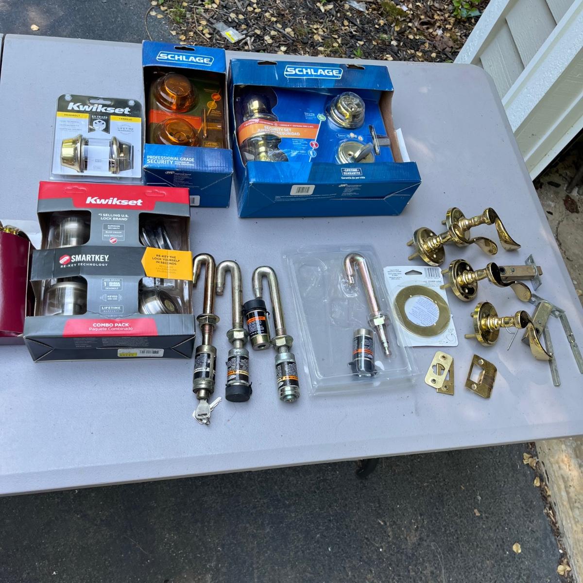 Lot includes Kwikset Deadbolt and combo pack, Schlage Deadbolt and combo pack, interior door handles, Baldwin deadbolt and more.