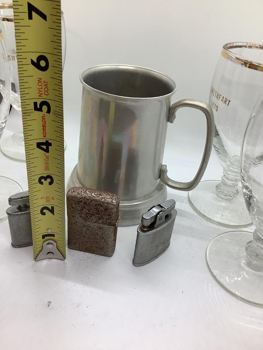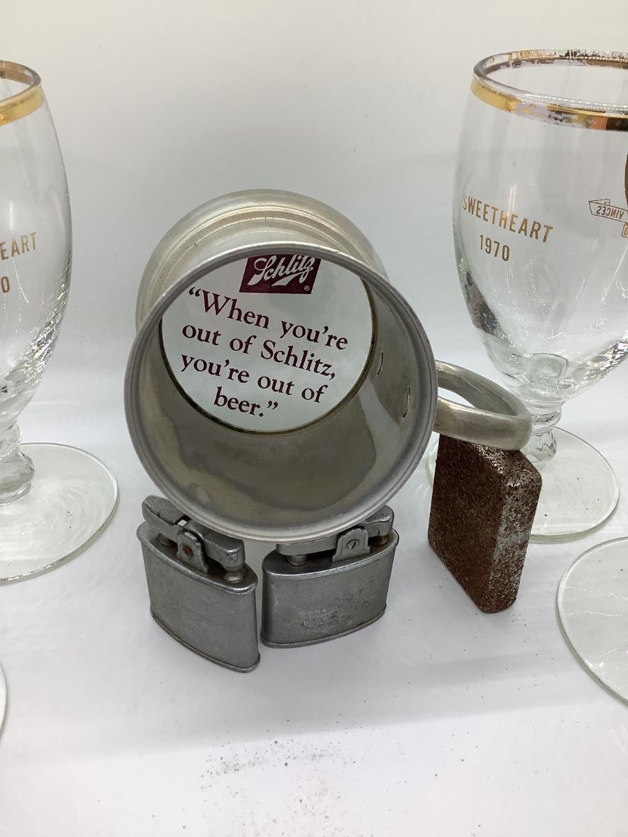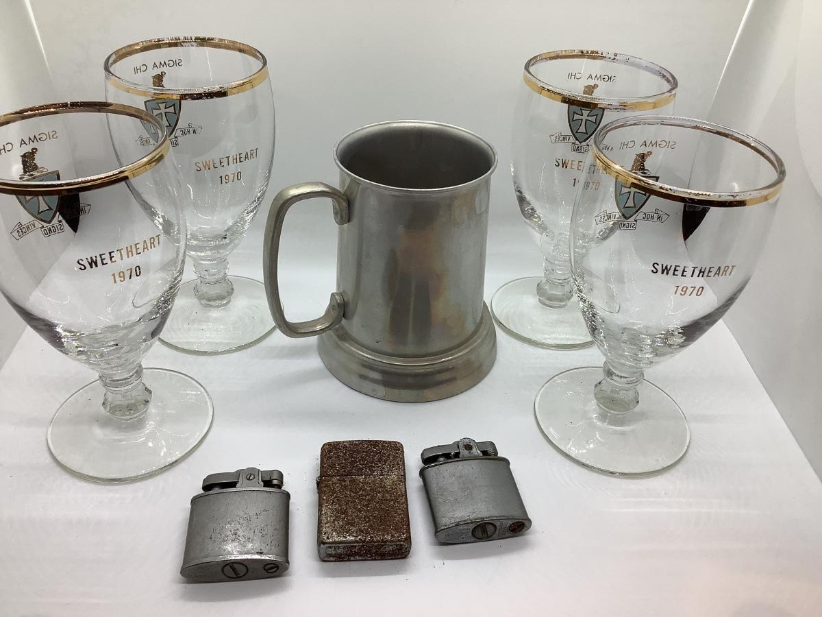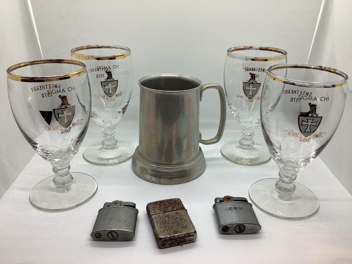 Schlitz mug, 3 lighters, 4 Sigma Chi glasses