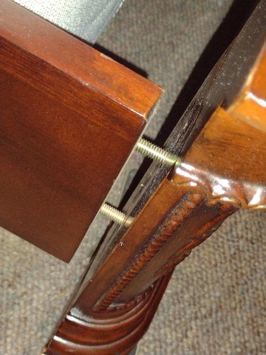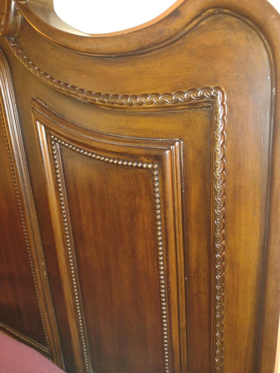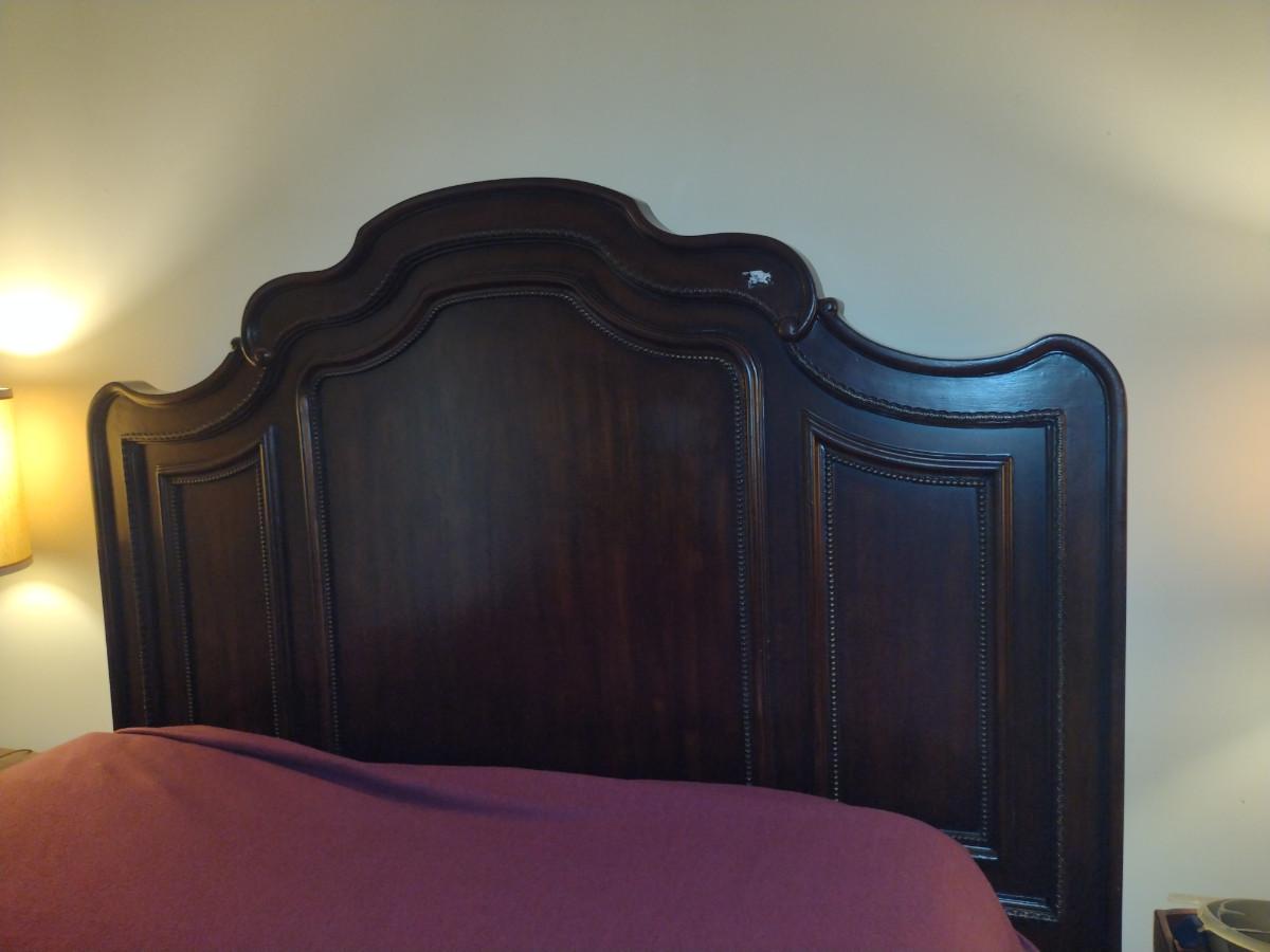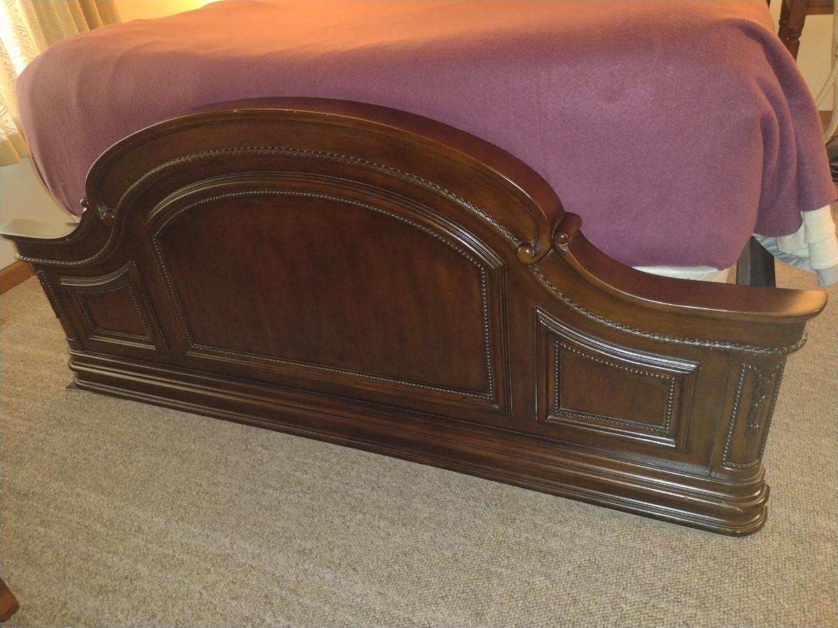 Schnadig Queen Sized Bed with Wooden Head and Foot Boards. Item needs to be repaired- foot board is not attached to side rail. Please see all pictures for condition.