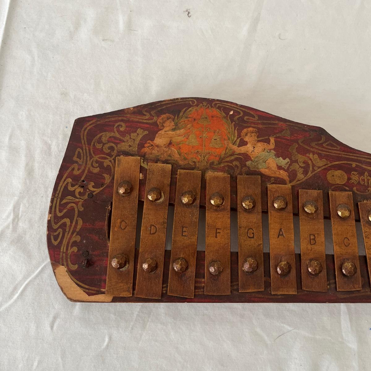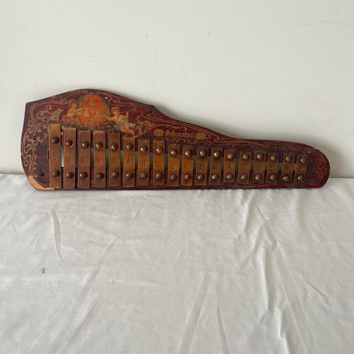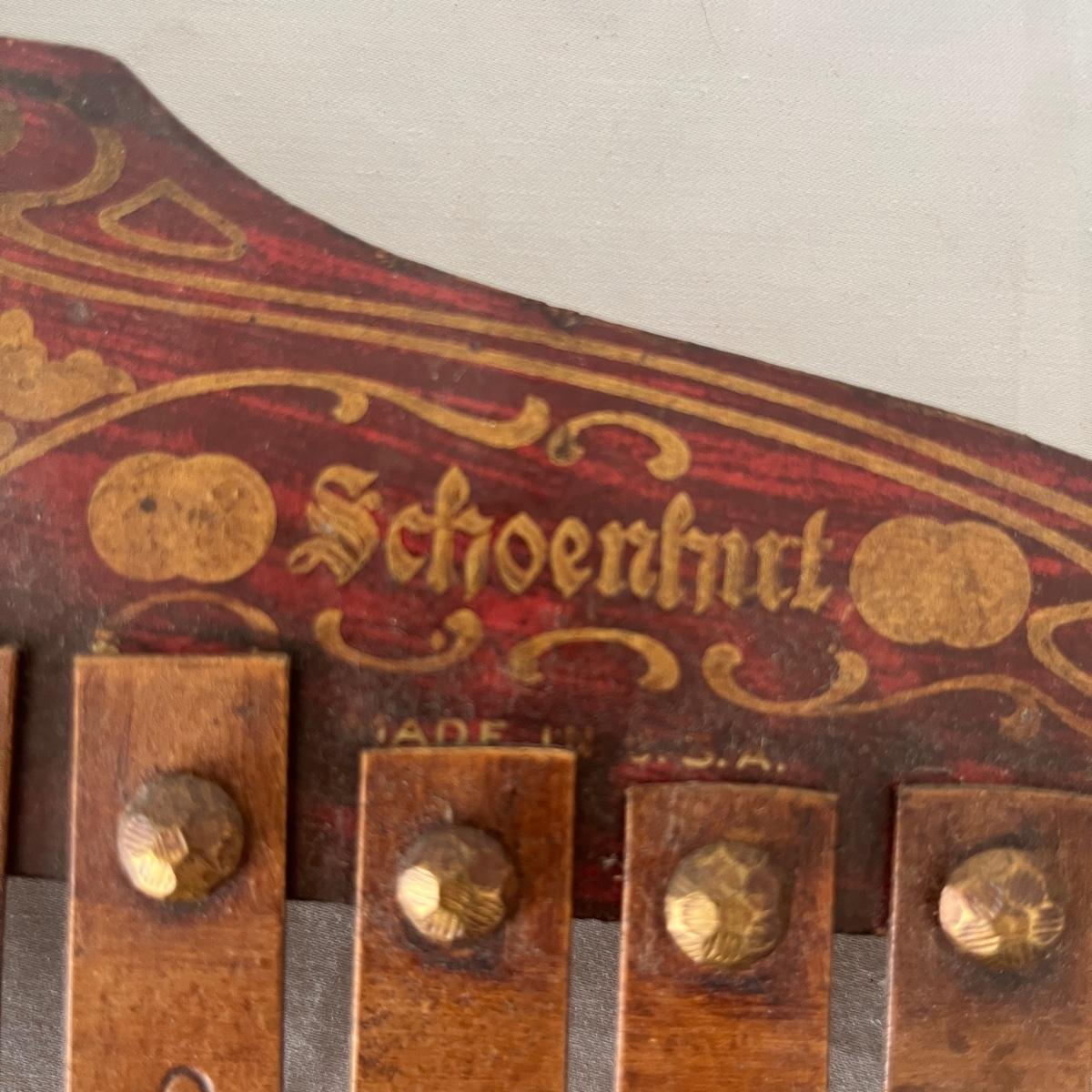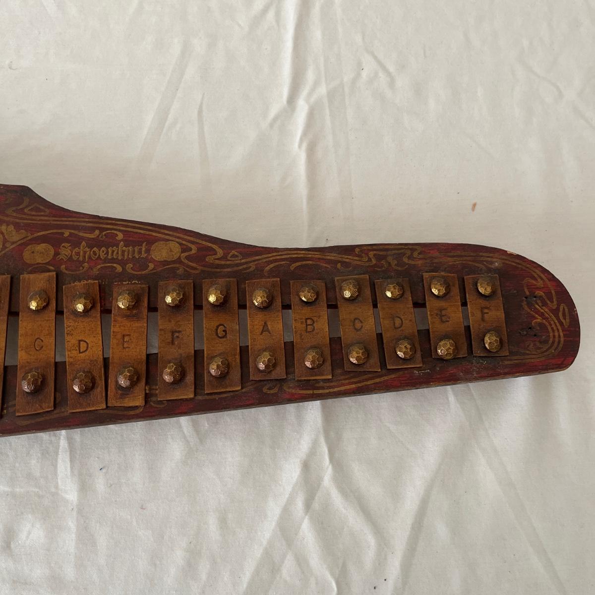Lot includes a Shoenhut metallophone toy 18 key xylophone with a wooden base that measures 20.5” x 6.5” x 1.5”H. Xylophone has a piece of chipped veneer missing, see pictures.