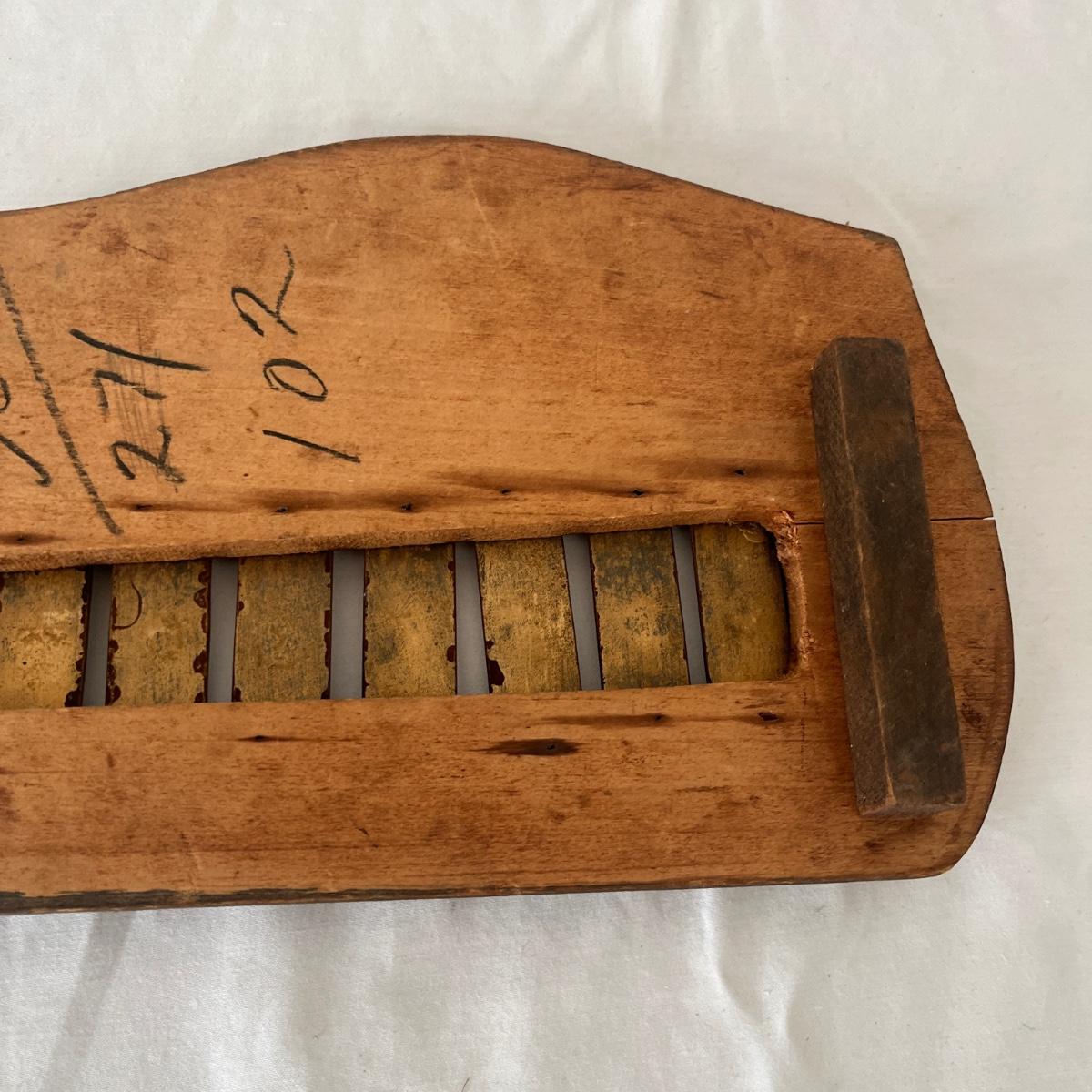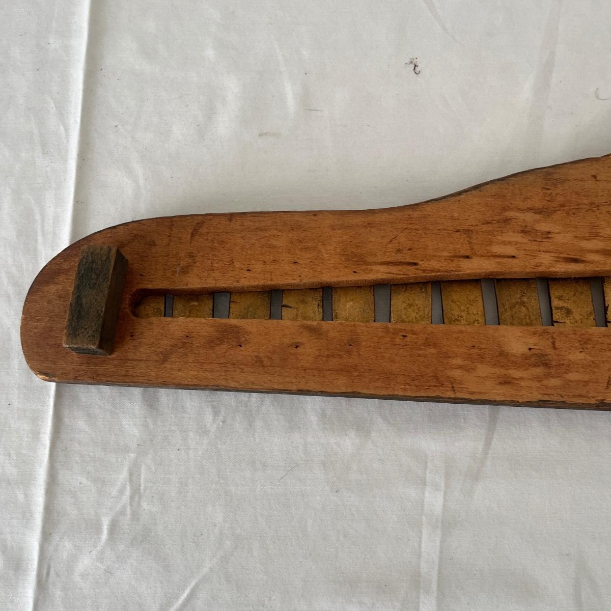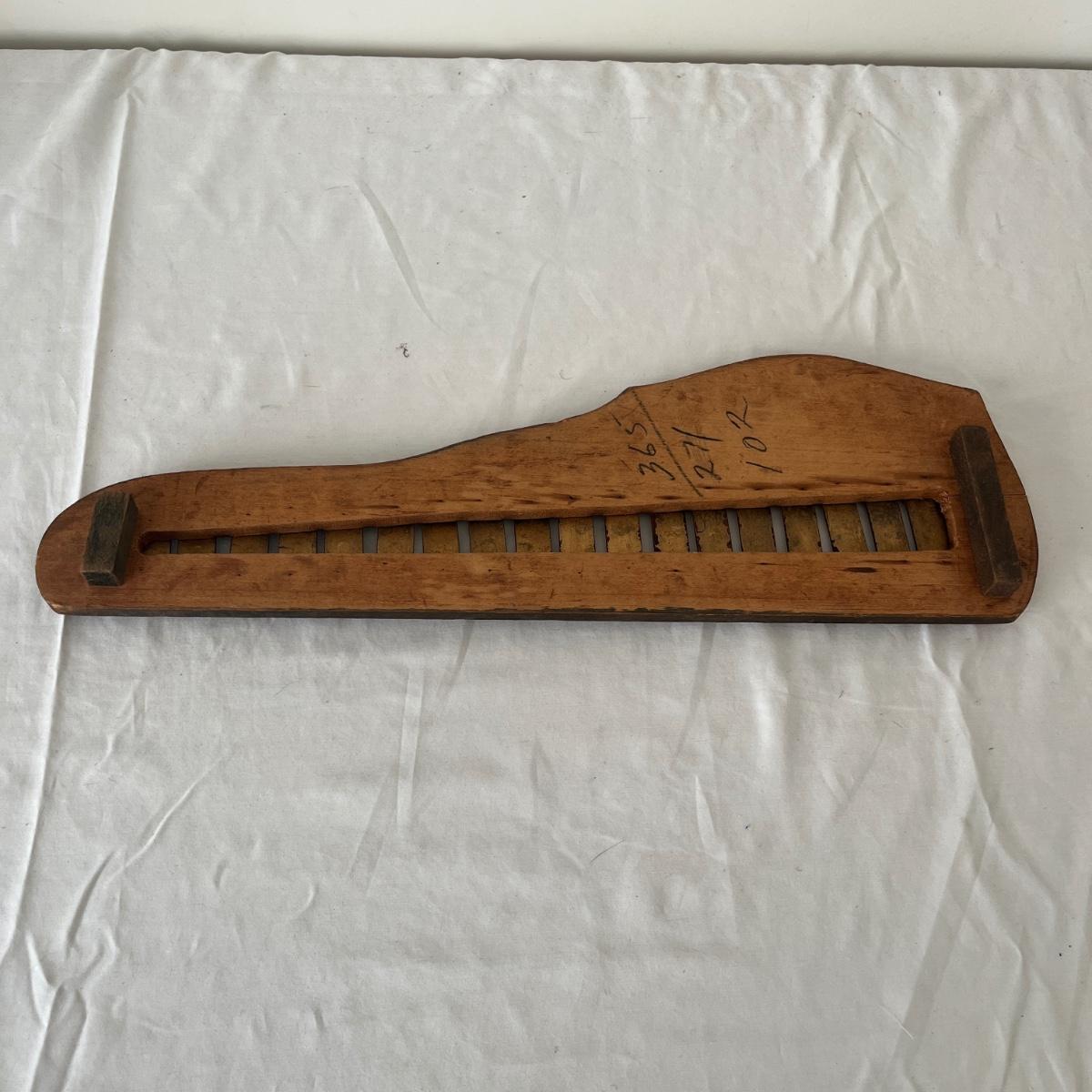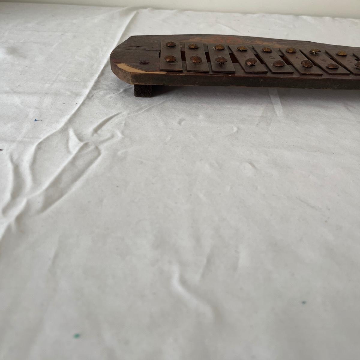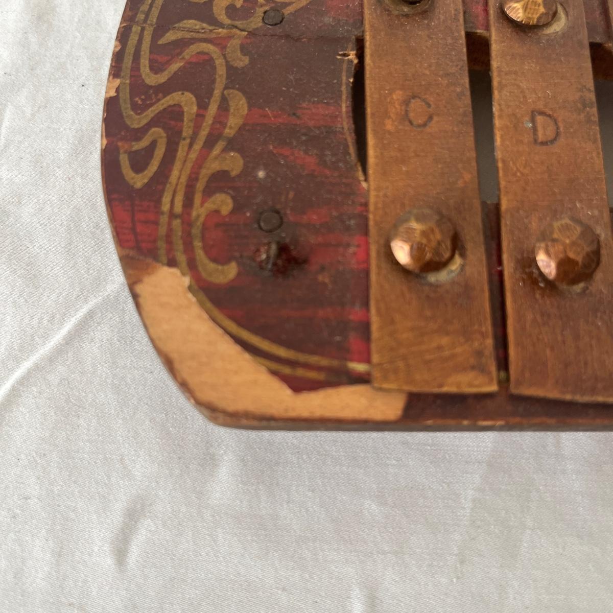 Lot includes a Shoenhut metallophone toy 18 key xylophone with a wooden base that measures 20.5” x 6.5” x 1.5”H. Xylophone has a piece of chipped veneer missing, see pictures.