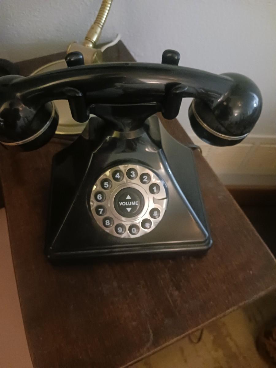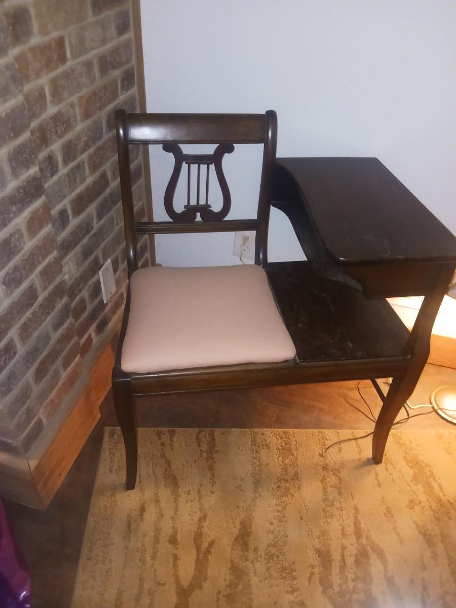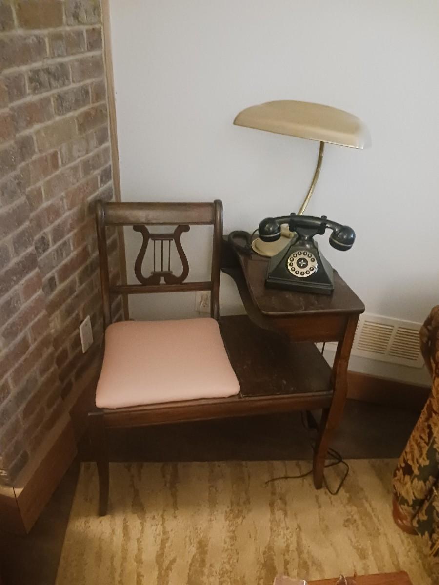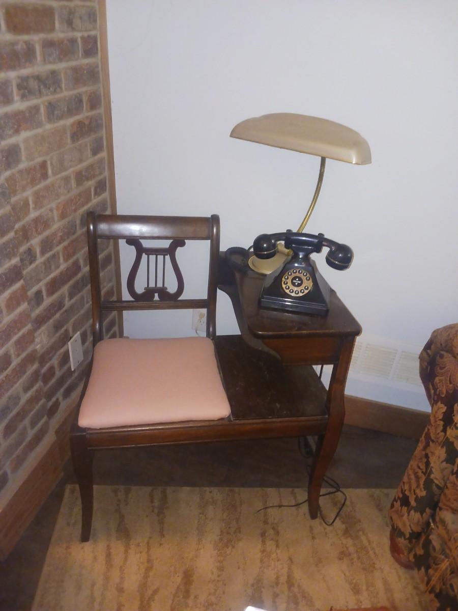 HARP BACK TELEPHONE CHAIR WITH REPROD ANTIQUE PHONE AND RETRO LAMP