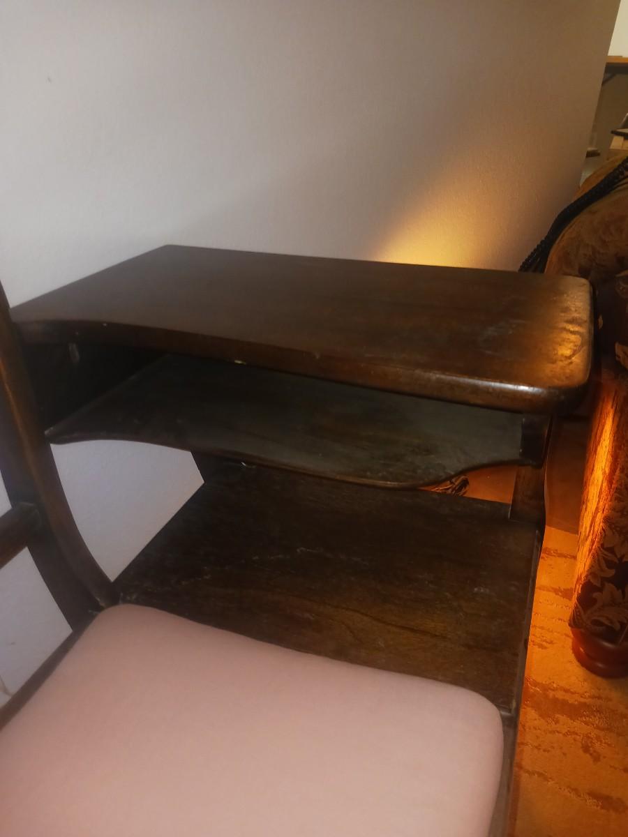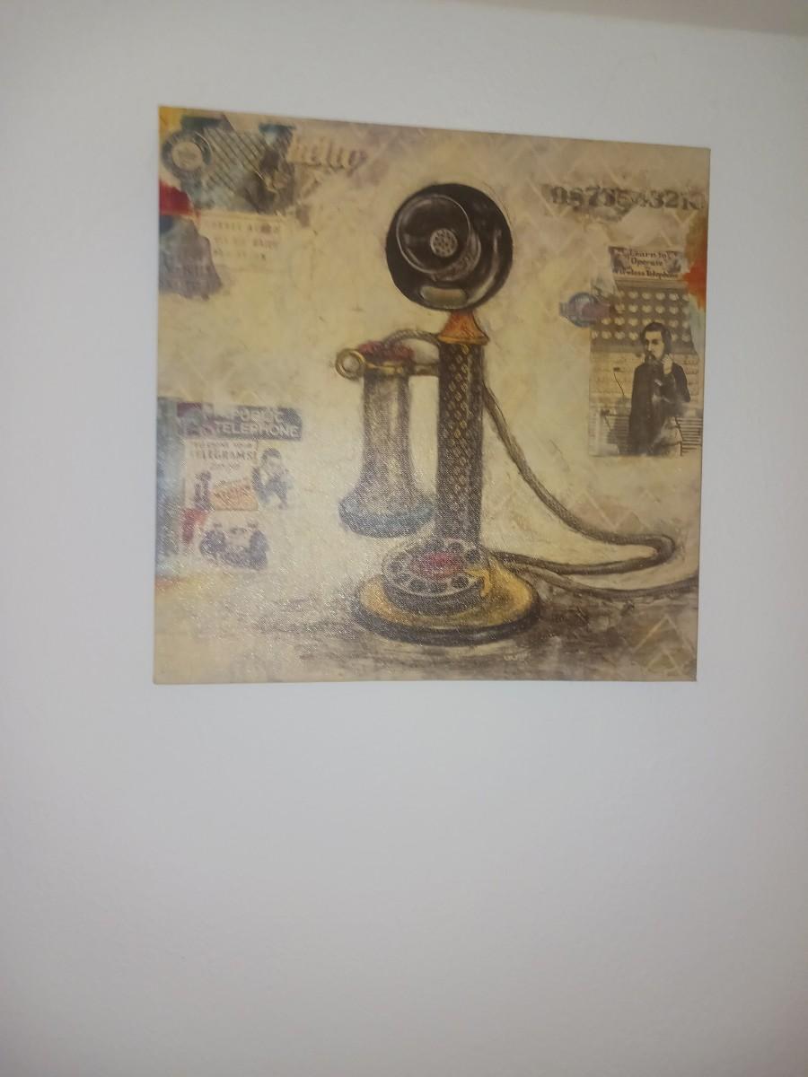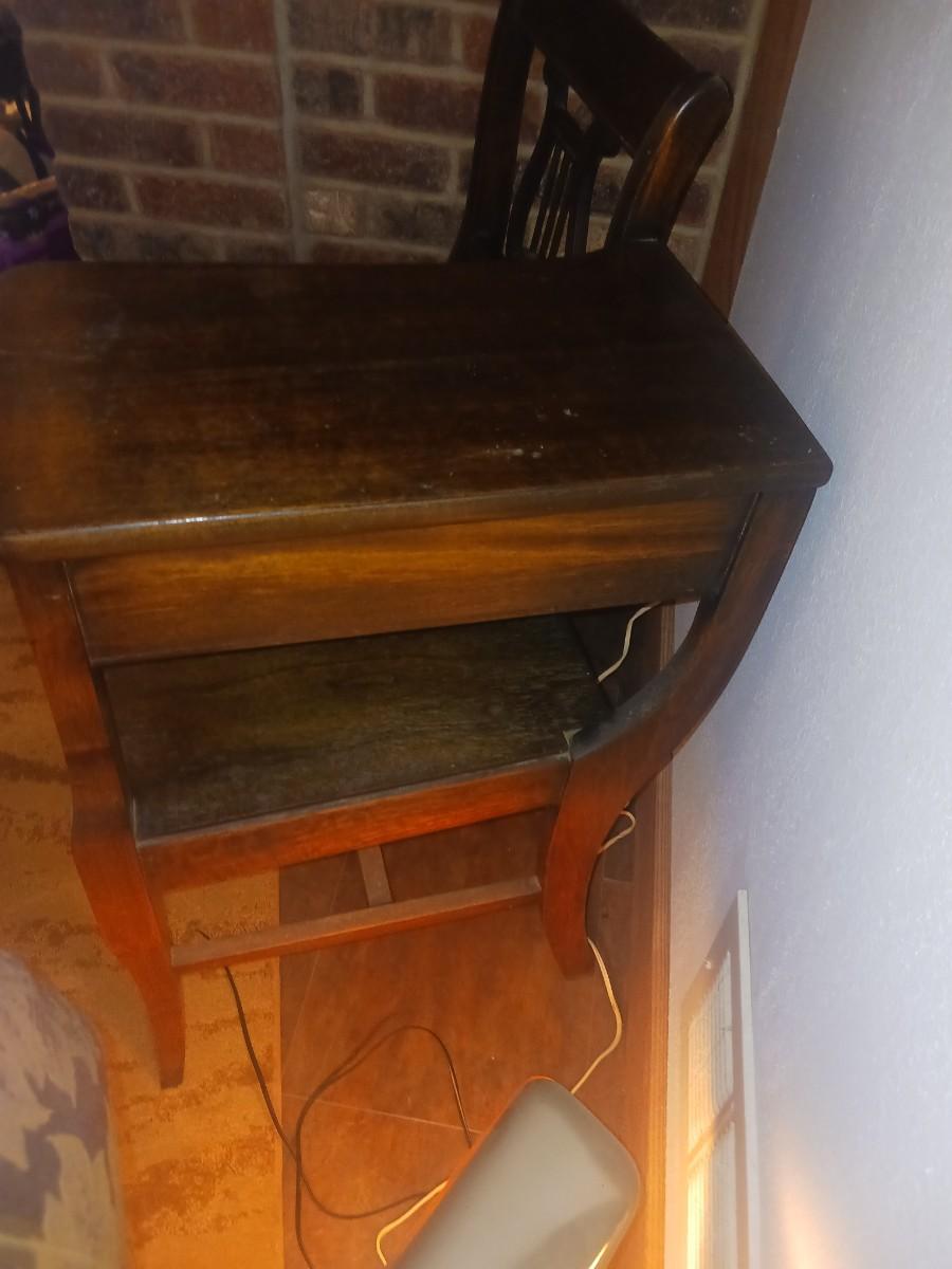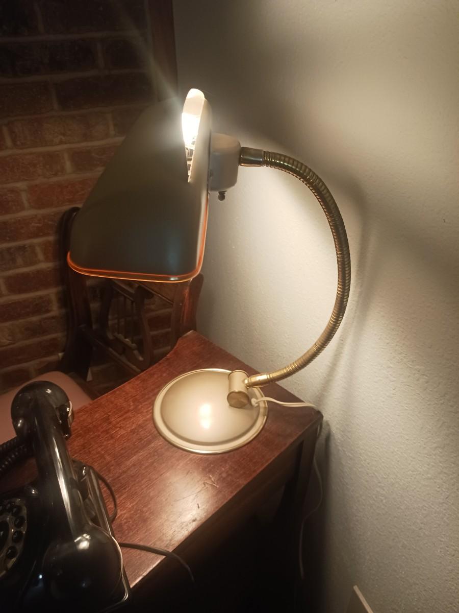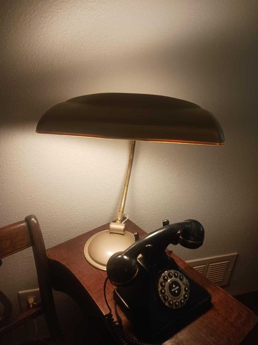 HARP BACK TELEPHONE CHAIR WITH REPROD ANTIQUE PHONE AND RETRO LAMP