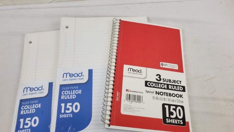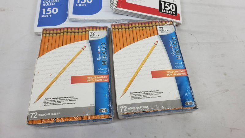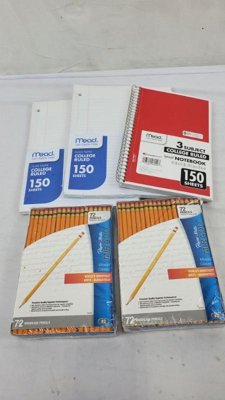 School Supplies, 2 Sets of 150 Sheets Each Filler Paper, 3 Subject College Ruled Notebook, & 2 Packages of 72 Count Woodcase Pencils - New