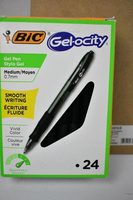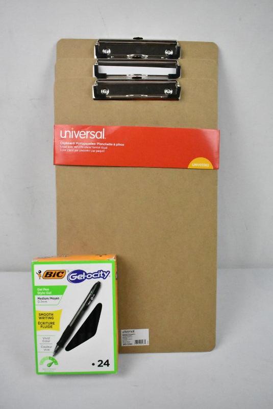 School/Office: BIC Gelocity Retractable Gel Pens, Black, 24-Count & 3 Clipboards, 1/2" Capacity, Holds 8 1/2"x14" - New