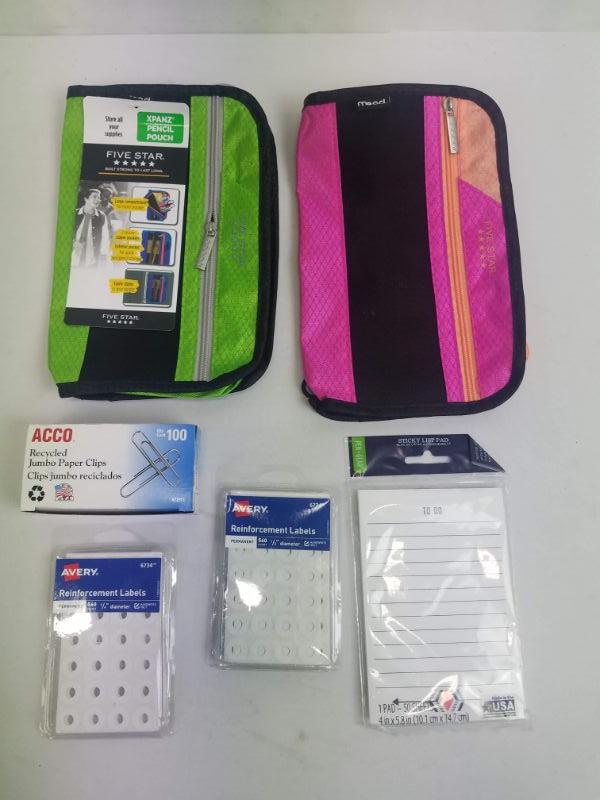 School/Office Supply Lot of 6: Pencil Pouches, Paper Clips, Reinforcement Labels, Sticky List Pad - New