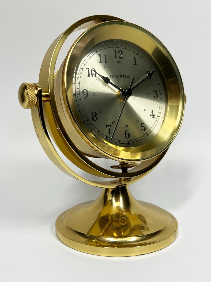 Schooner Hampton Rotating Brass Nautical Desk Ship Clock, there is no signifncant damage to the brass or protective glass and is in good displayable condition. The clock is not running, check pictures for more details and for sizing.